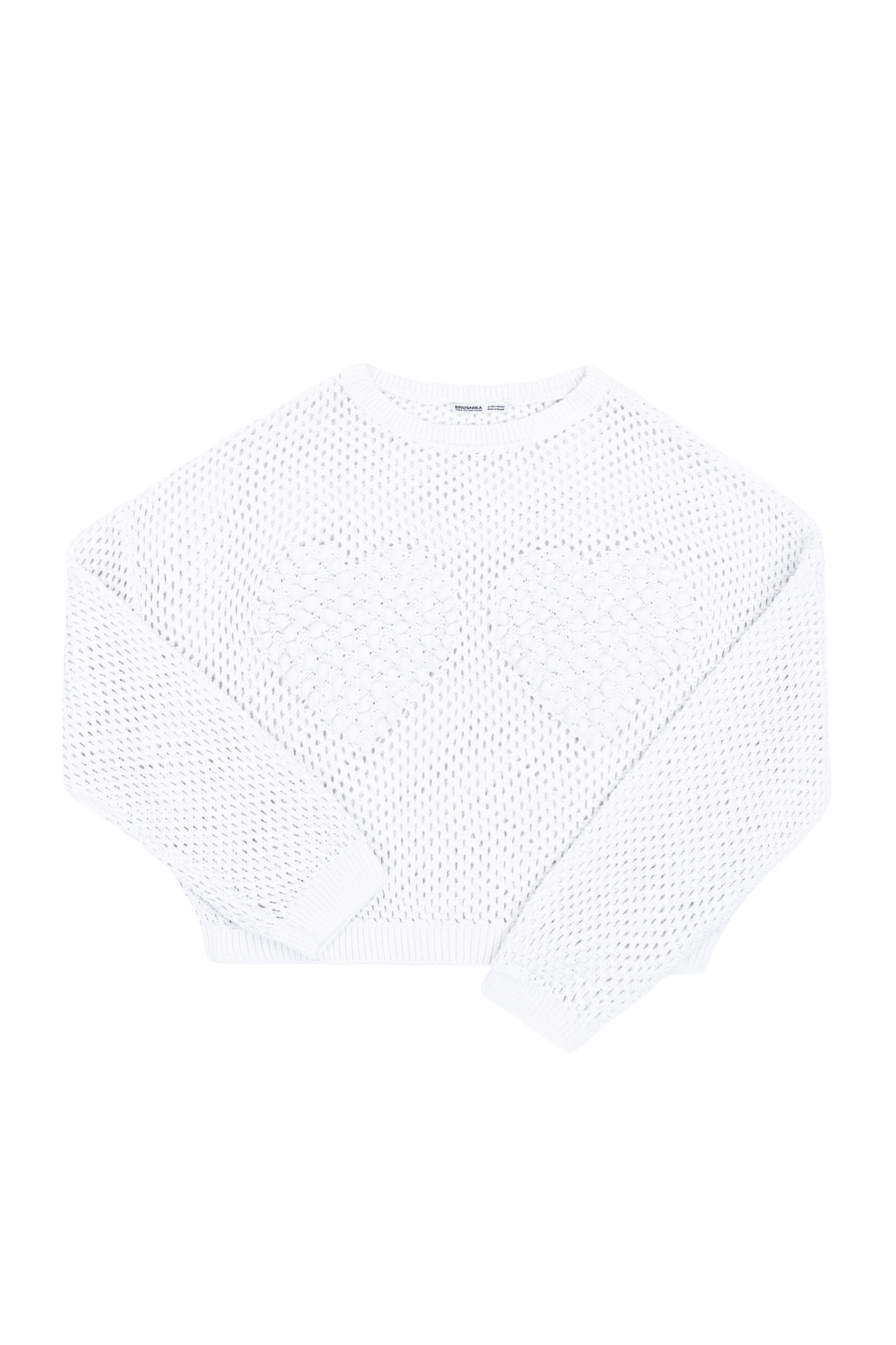 Трикотажный джемпер из хлопка. Модель свободного силуэта со спущенной линией плеча и круглым вырезом горловины. Изделие декорировано объемным орнаментом в виде двух сердец на груди.