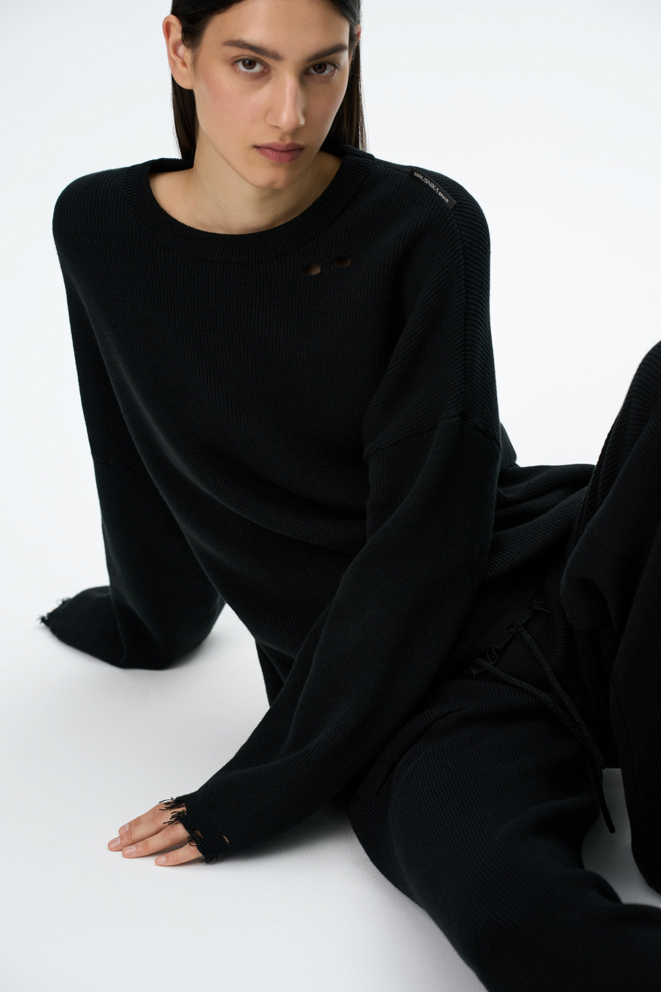 Трикотажный джемпер из хлопка с добавлением вискоза. Модель свободного силуэта со спущенной линией плеча и круглым вырезом горловины. Изделие декорировано имитацией драни и необработанным краем.