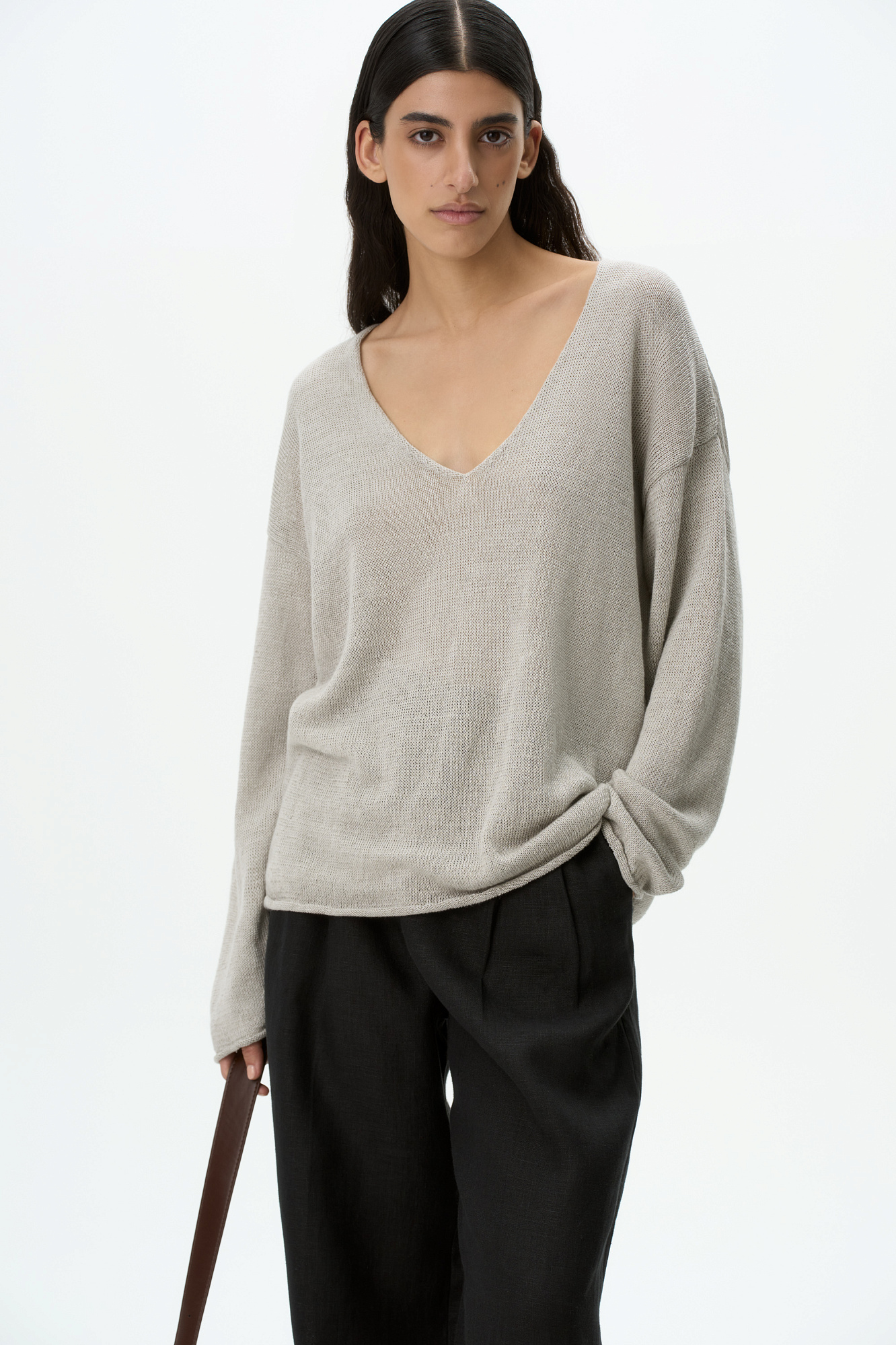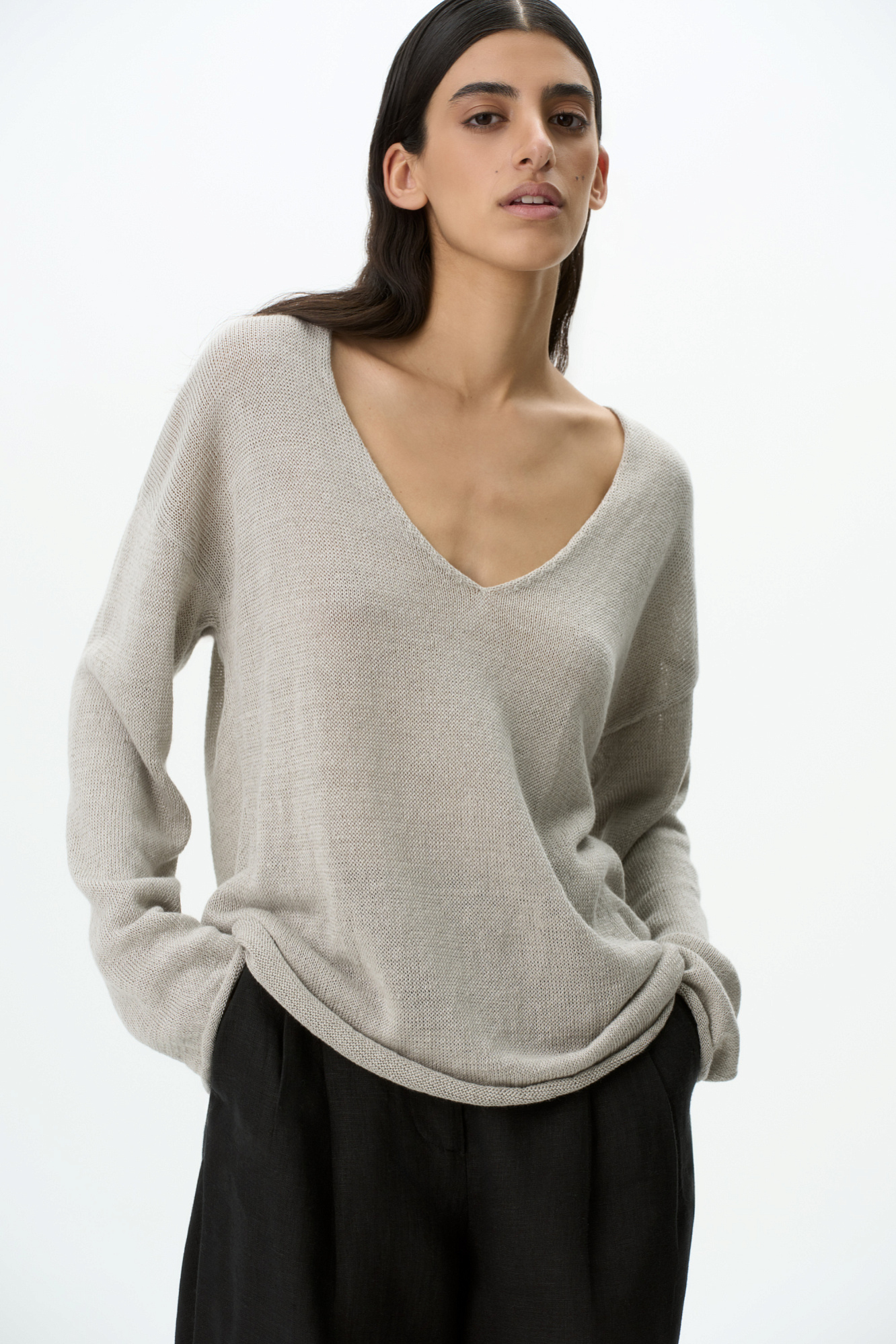 Трикотажный джемпер из 100% льна. Модель свободного силуэта с длинным рукавом и с V-образным вырезом горловины. Изделие декорировано брендированным ярлыком сбоку и валиками по низу.