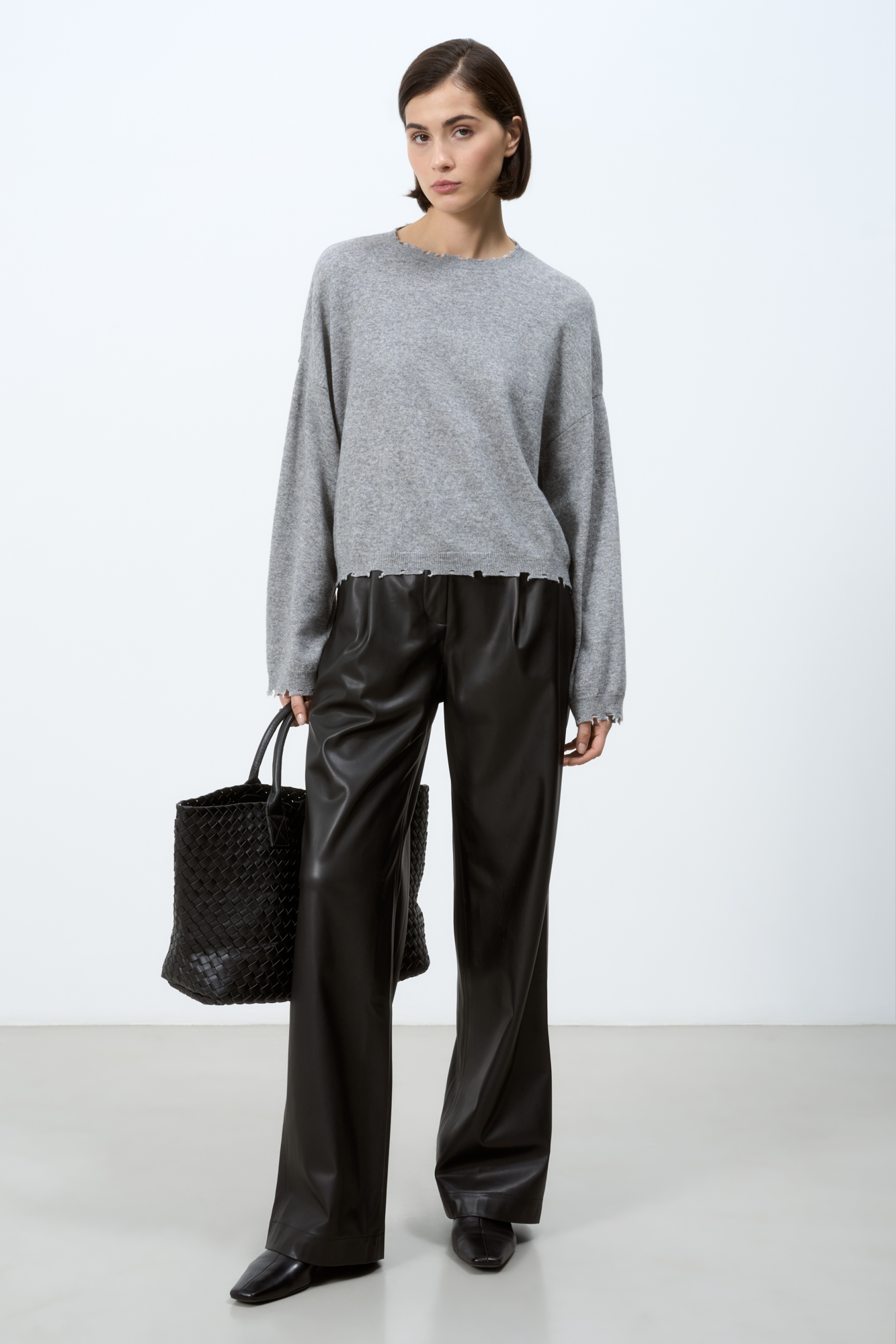 Укороченный трикотажный джемпер из шерсти с добавлением кашемира. Модель свободного силуэта со спущенной линией плеча. Горловина, манжеты рукавов и низ изделия выполнены с дранью.