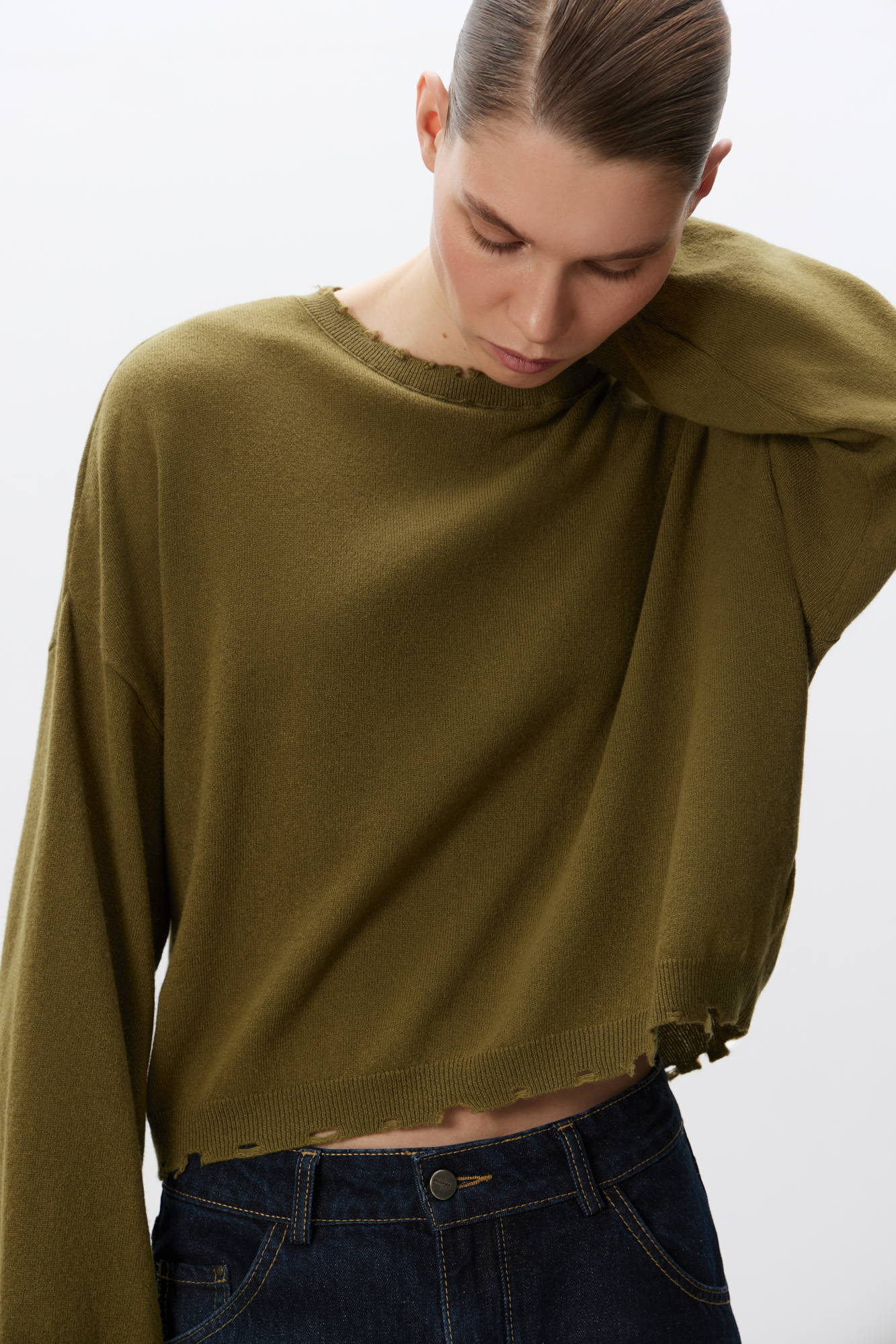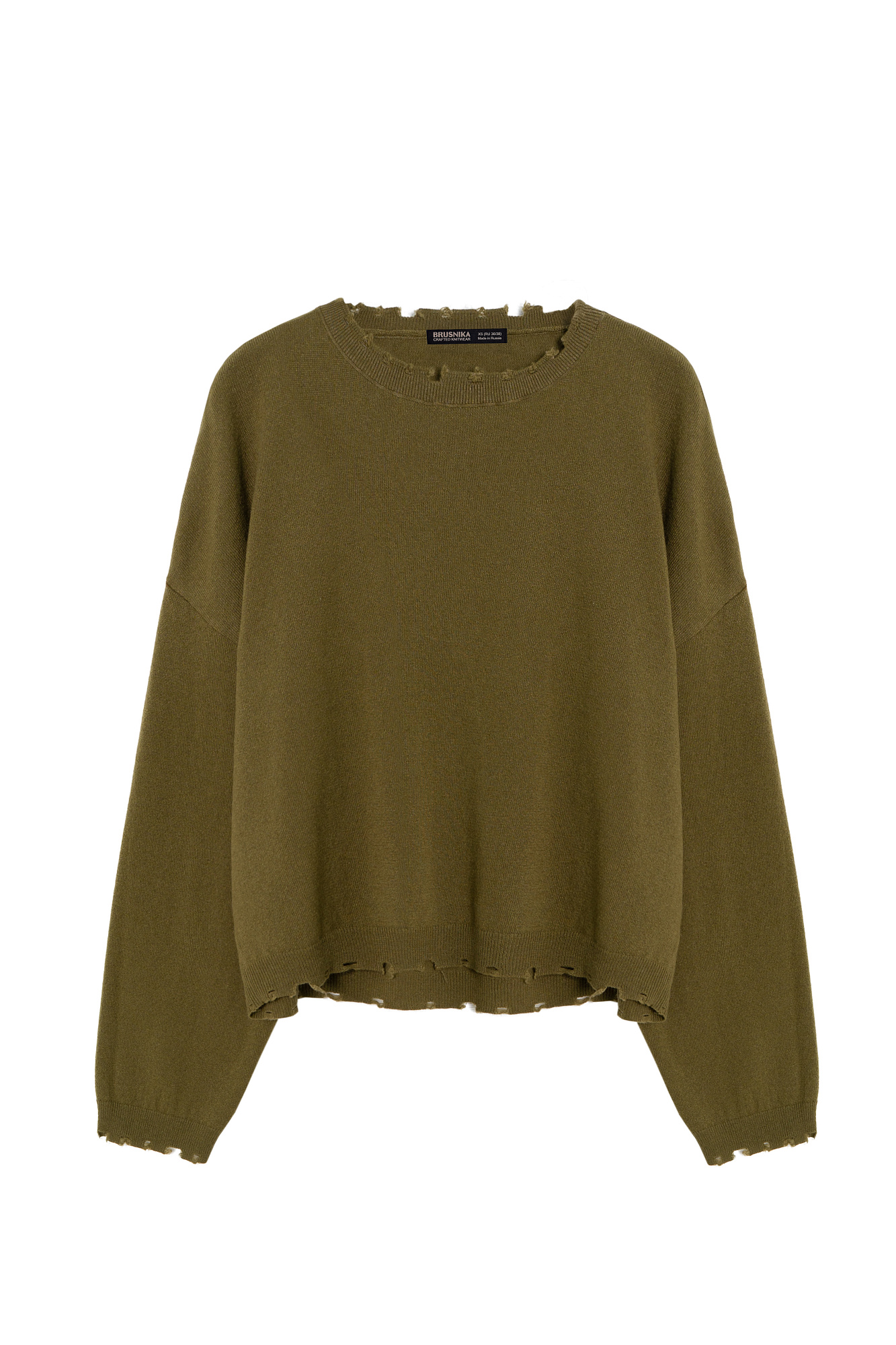 Укороченный трикотажный джемпер из шерсти с добавлением кашемира. Модель свободного силуэта со спущенной линией плеча. Горловина, манжеты рукавов и низ изделия выполнены с дранью.
