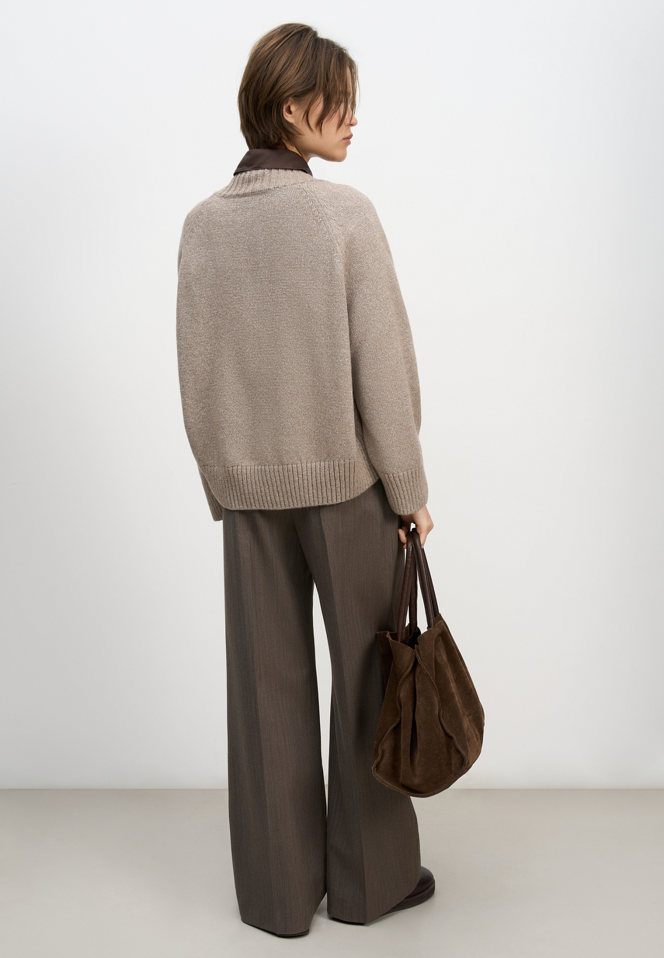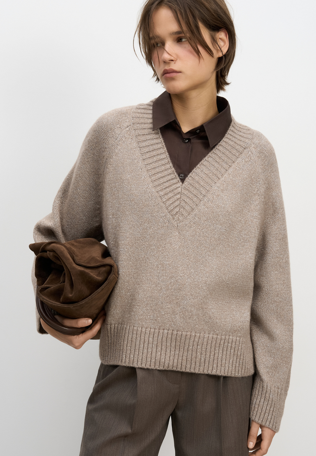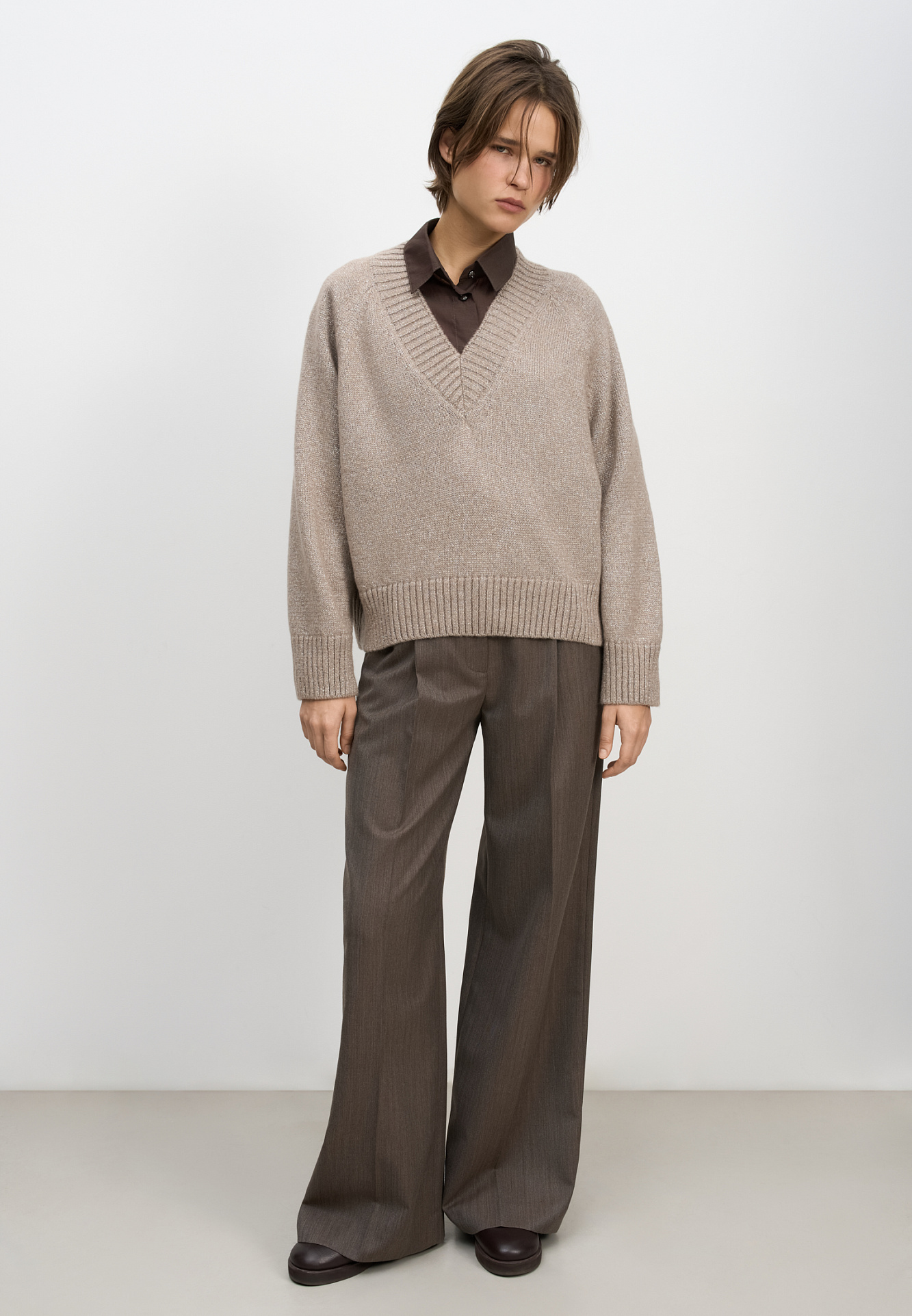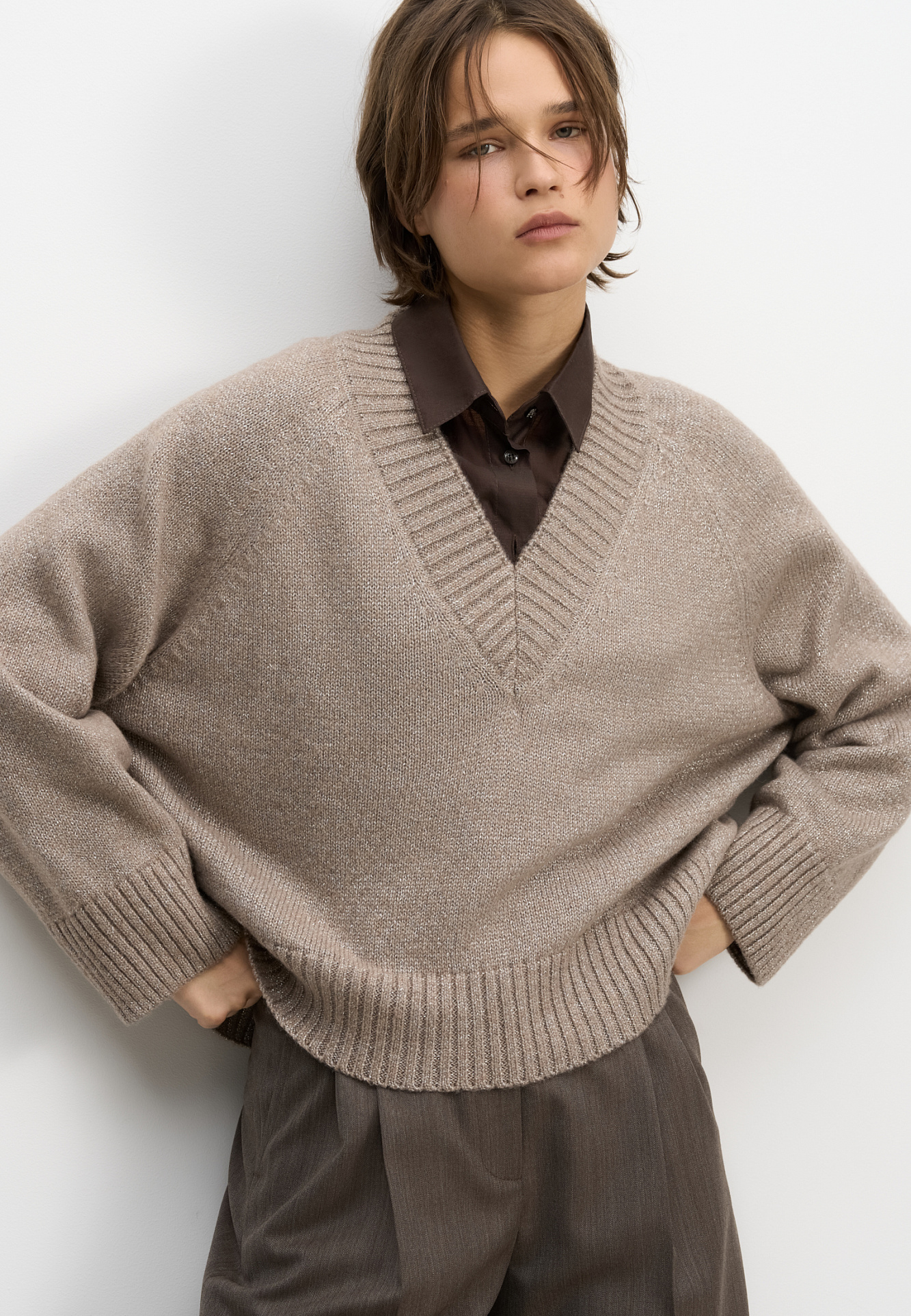 Трикотажный джемпер из шерсти мериноса с люрексом. Модель свободного силуэта с V-образным вырезом.