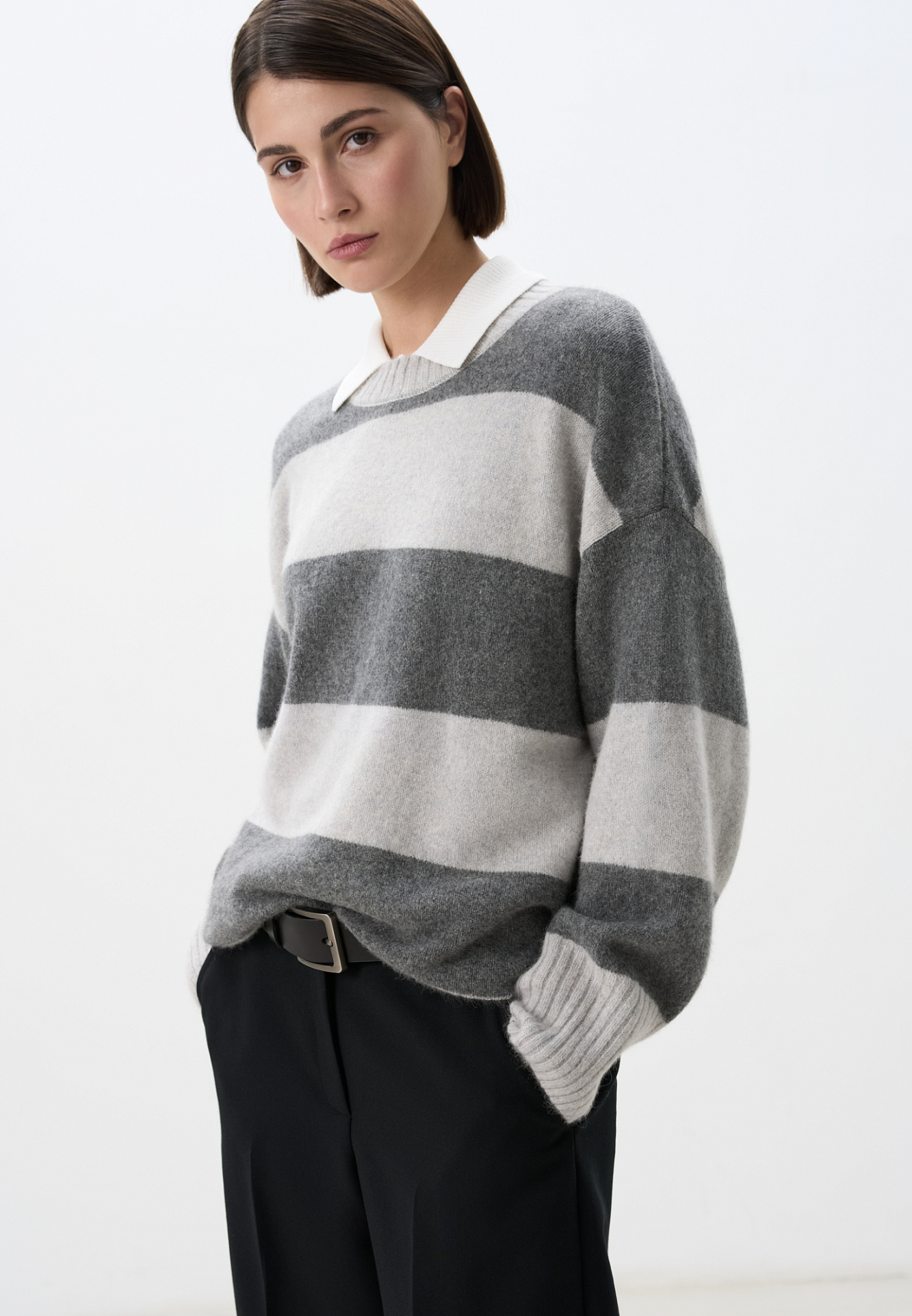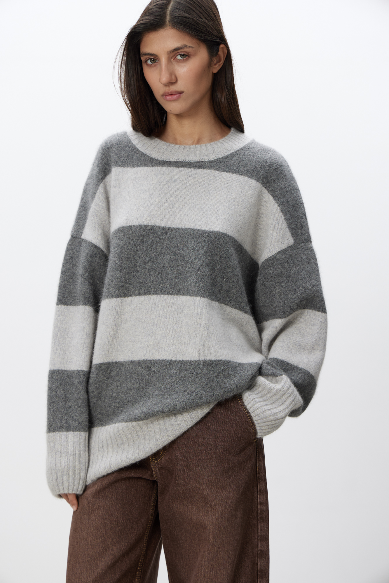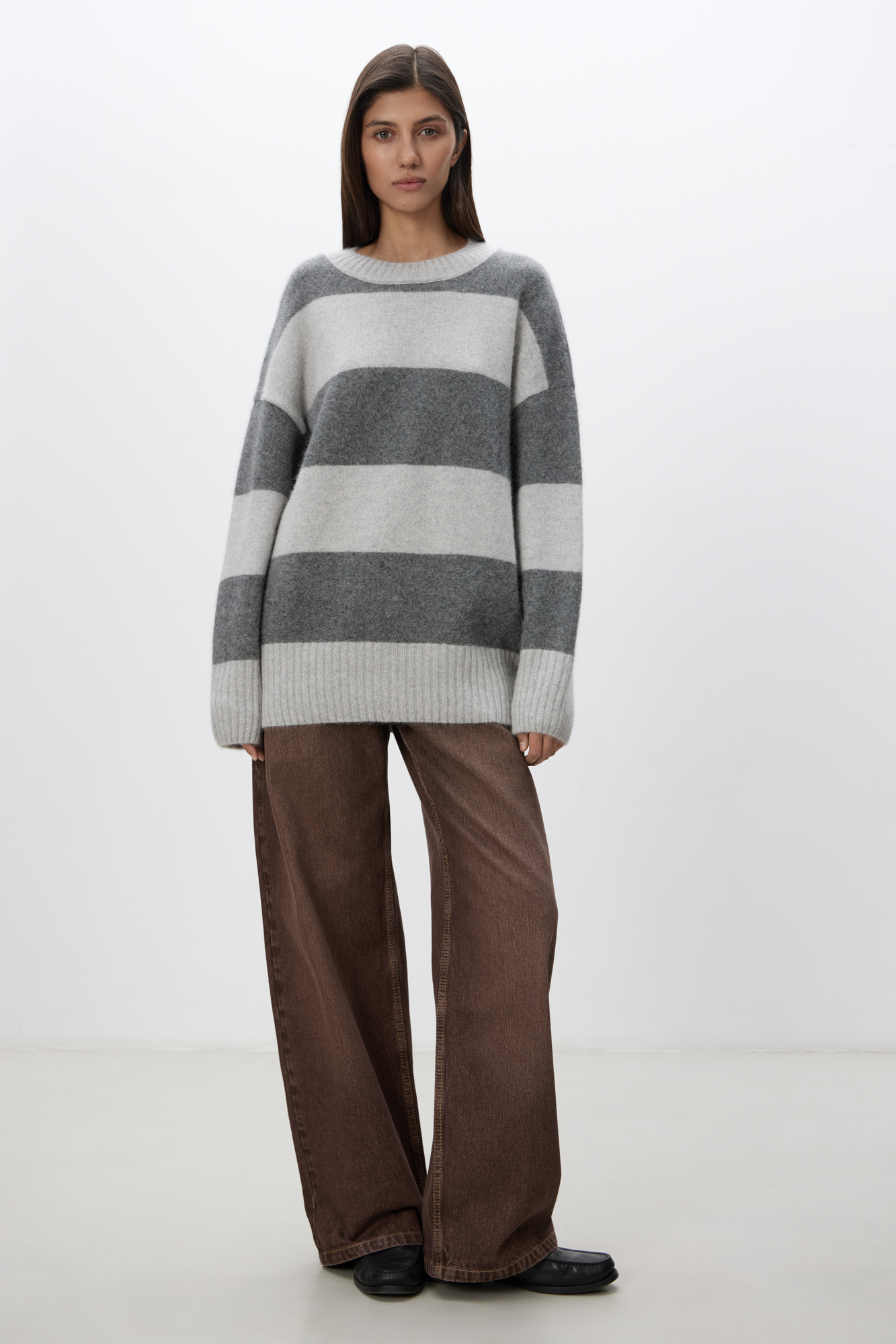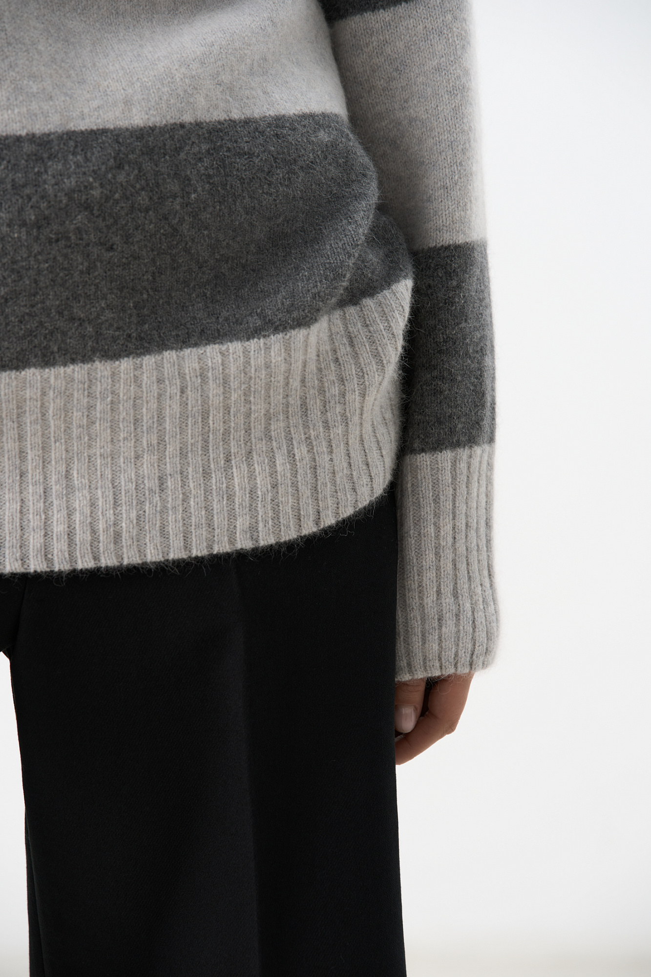 Трикотажный джемпер из пуха лисы в полоску. Модель свободного силуэта со спущенной линией плеча и круглой горловиной. Манжеты и низ изделия выполнен в рубчик.