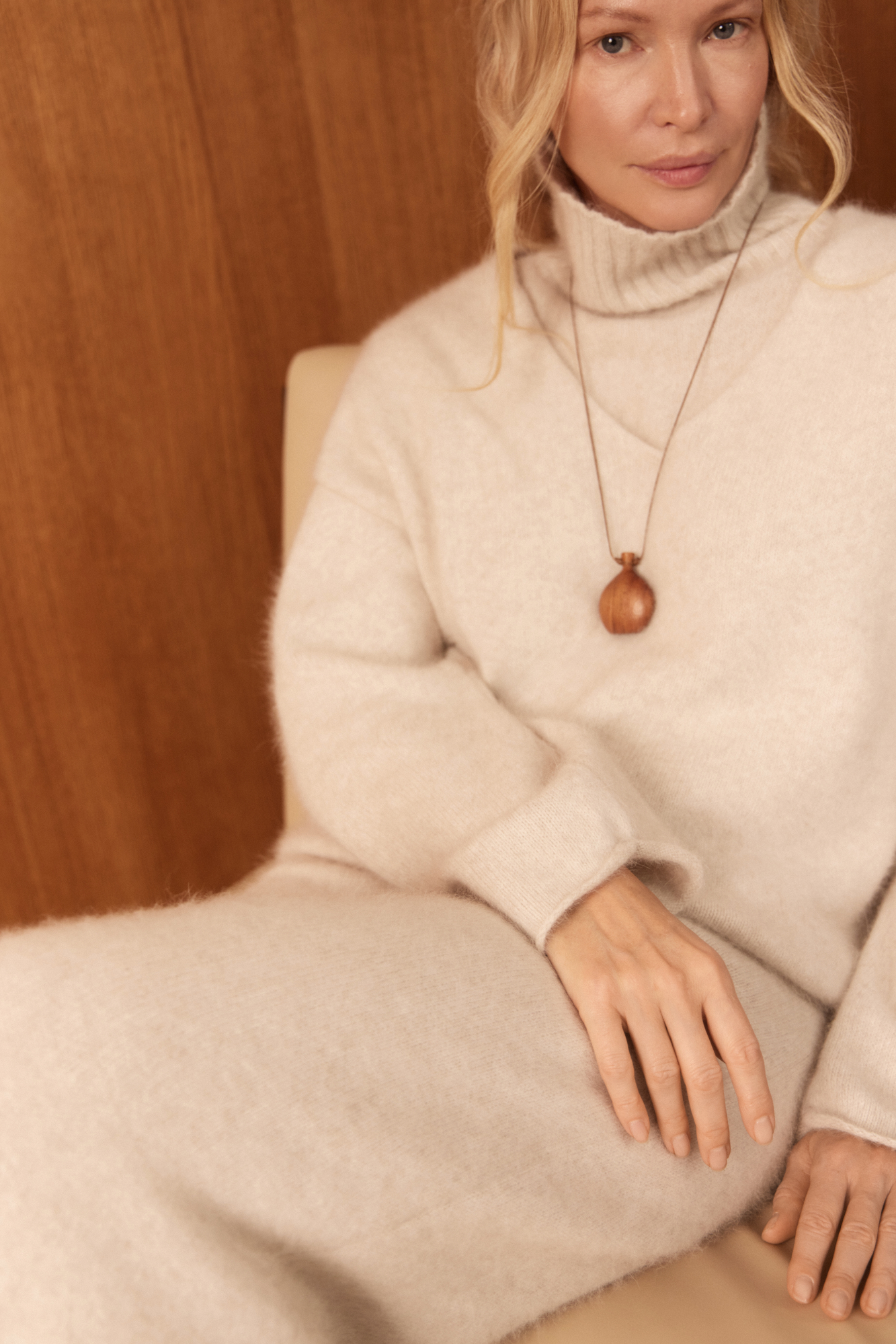 Объемный трикотажный джемпер из пуха лисы. Модель с глубоким V-образным вырезом горловины, спущенной линией плеч, длинными широкими рукавами и валиками по низу. Дополнить образ можно юбкой.