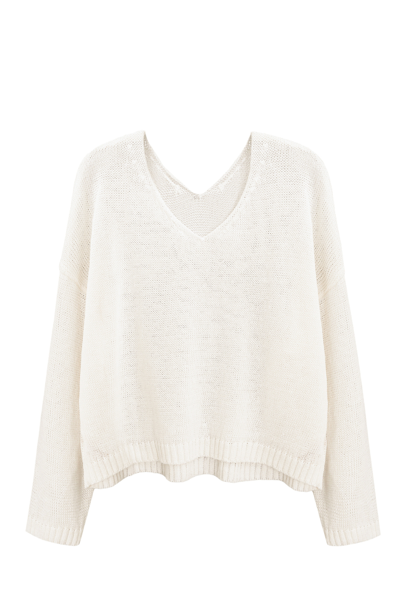 Трикотажный джемпер из 100% льна с V-образным вырезом. Модель прямого силуэта с длинным рукавом и удлиненной спинкой. Края изделия выполнены в рубчик.