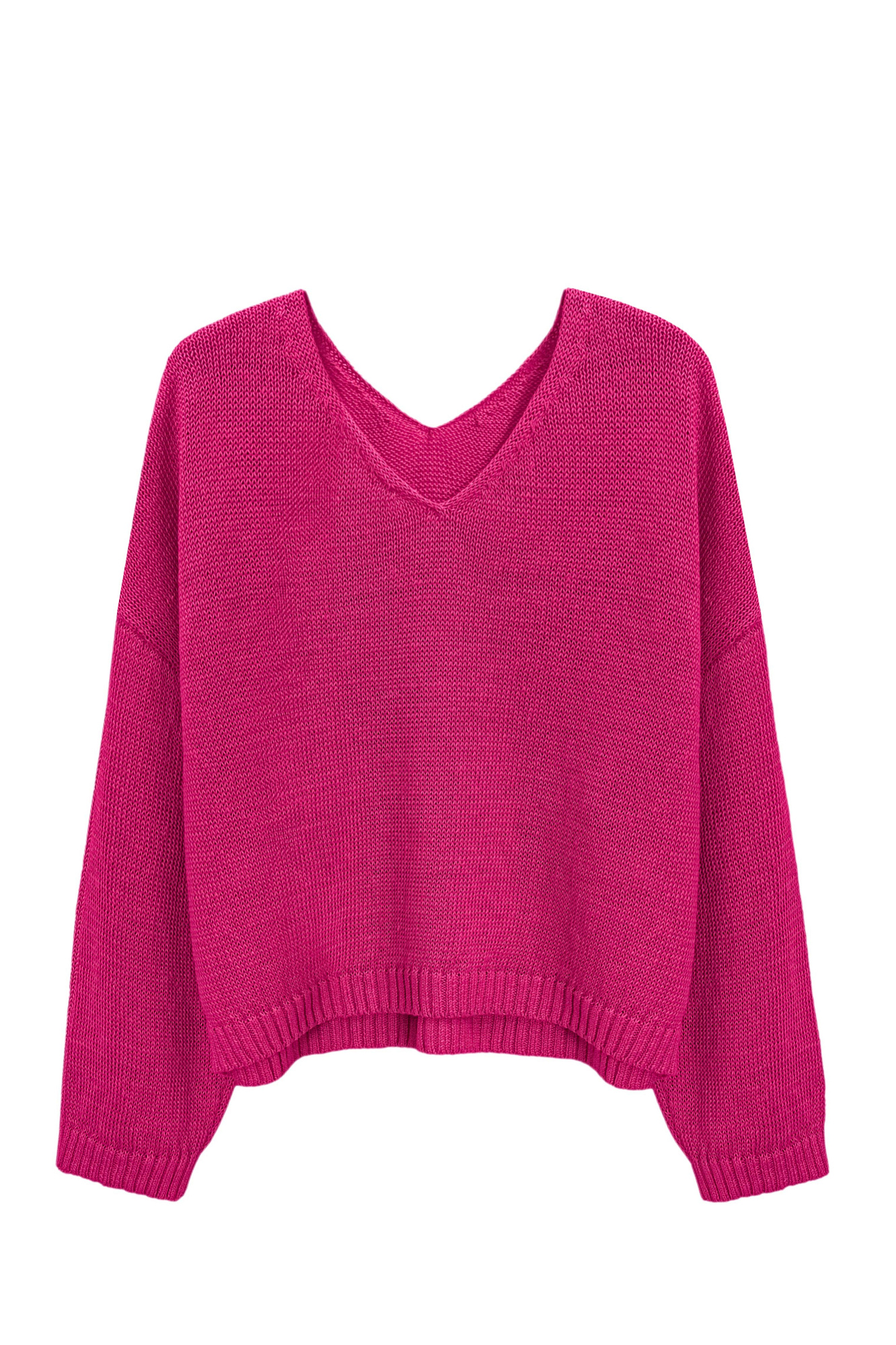 Трикотажный джемпер из 100% льна с V-образным вырезом. Модель прямого силуэта с длинным рукавом и удлиненной спинкой. Края изделия выполнены в рубчик.
