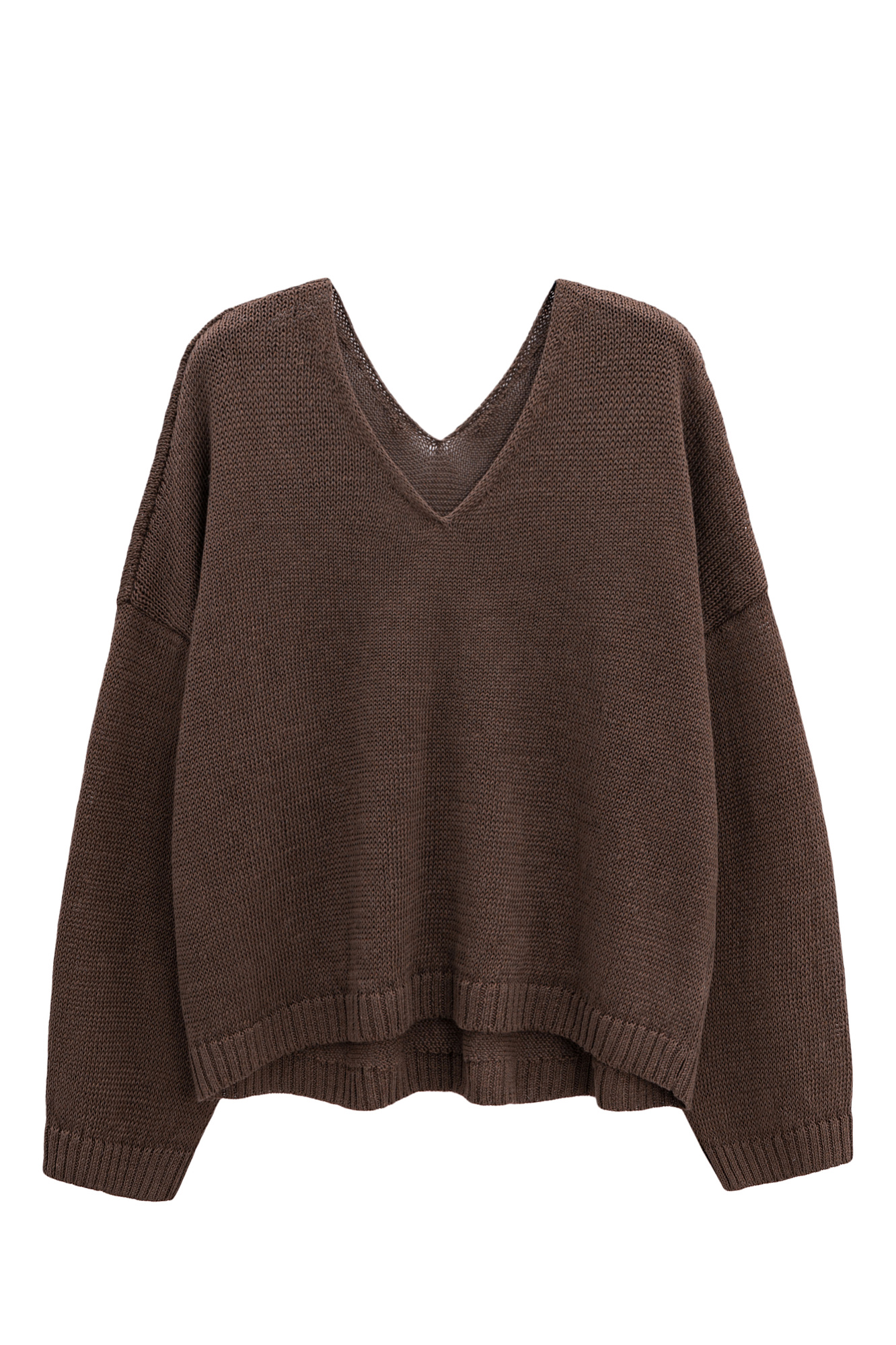 Трикотажный джемпер из 100% льна с V-образным вырезом. Модель прямого силуэта с длинным рукавом и удлиненной спинкой. Края изделия выполнены в рубчик.