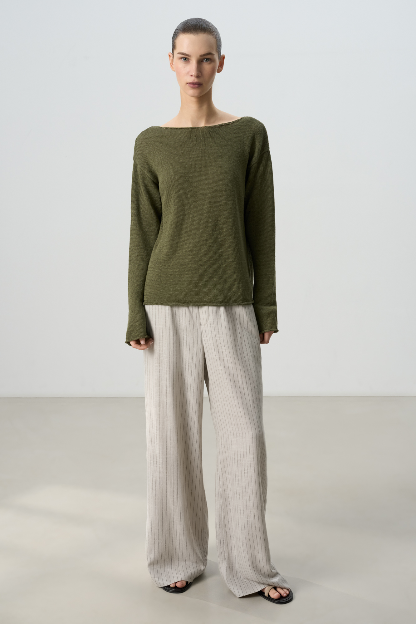 Трикотажный джемпер из 100% льна. Модель свободного кроя, со спущенной линий плеч и неглубоким вырезом горловины. Края изделия декорированы валиками.