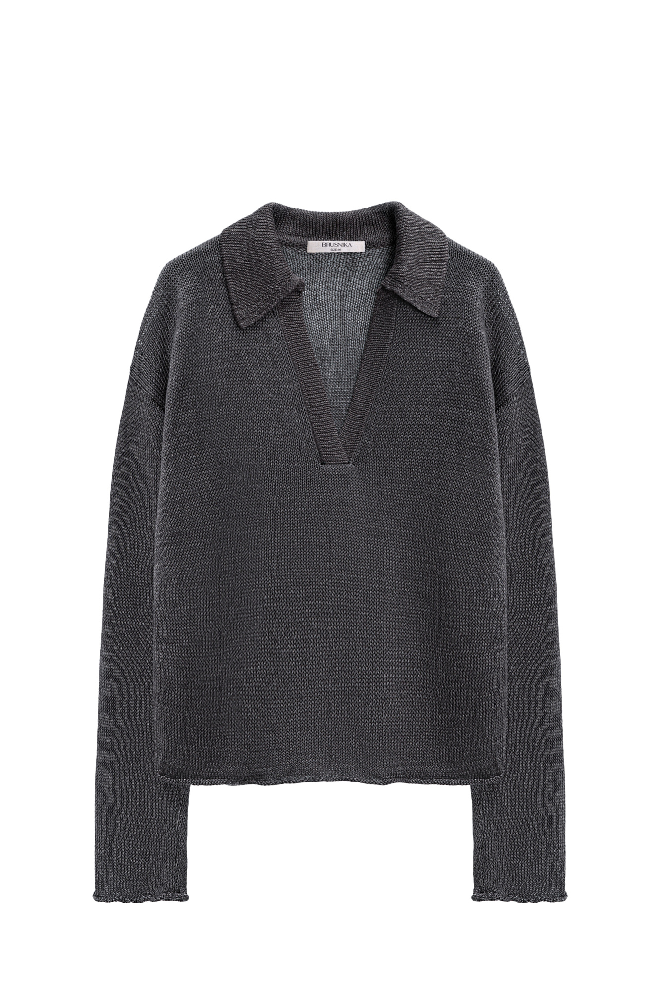 Трикотажный джемпер из 100% льна с воротником поло. Модель свободного силуэта, со спущенной линией плеча, длинными рукавами, V-образным вырезом горловины и валиками по нижнему краю изделия.