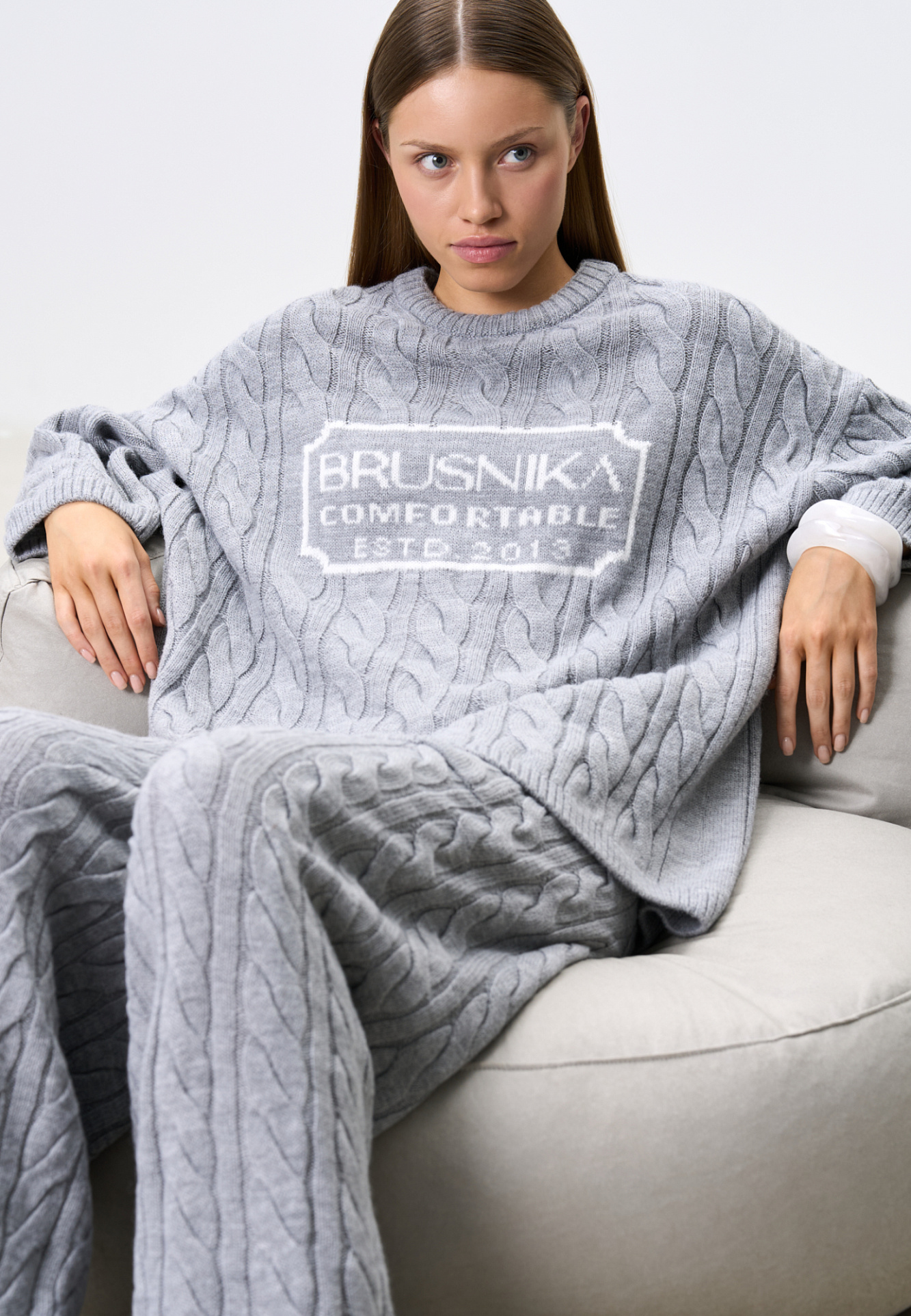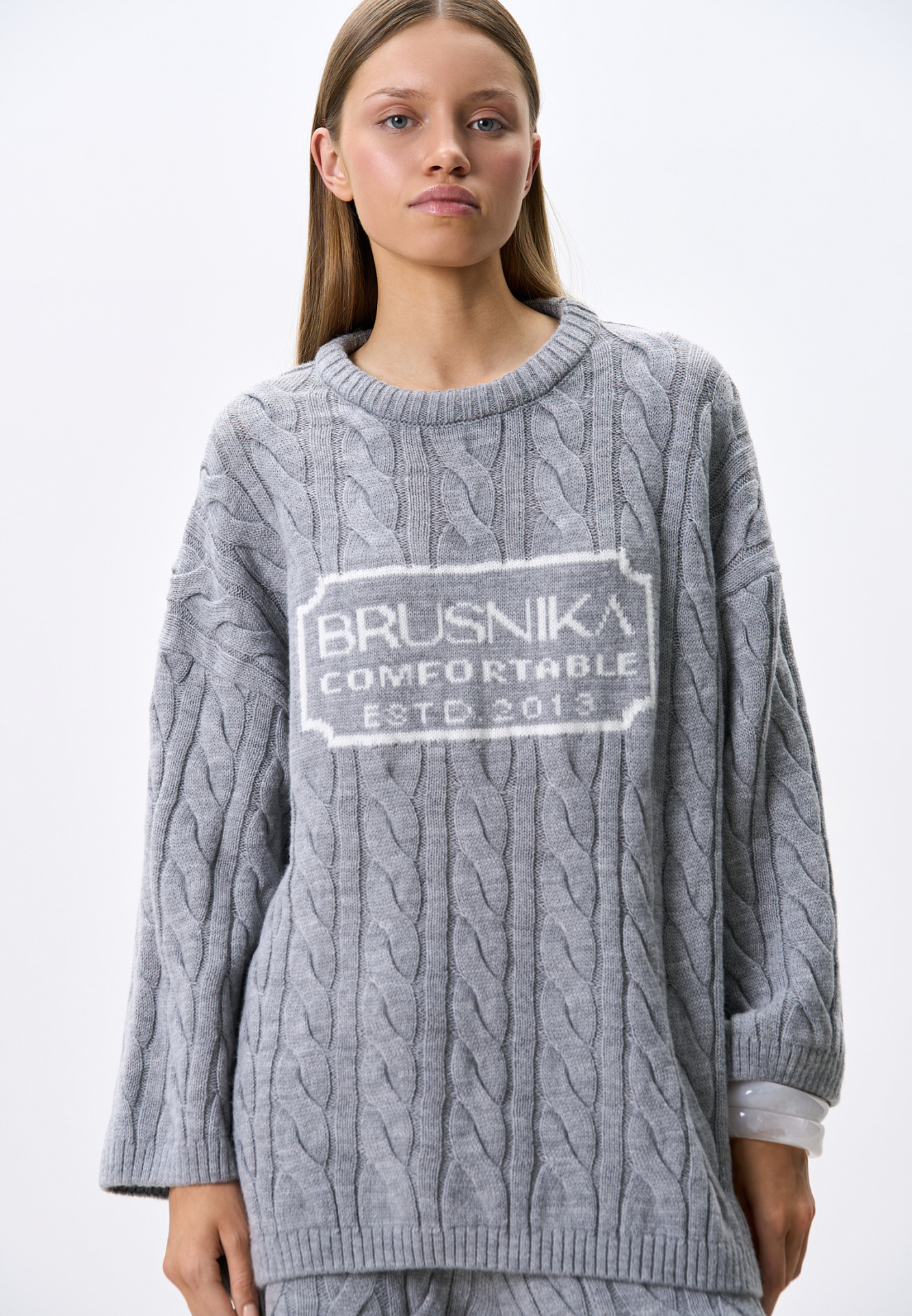 Трикотажный джемпер с объемными косами из мягкой шерсти. Модель свободного силуэта, со спущенной линией плеч и круглым вырезом. Изделие декорировано брендированным жаккардом на груди. Дополнить образ можно брюками и юбкой в том же стиле.
