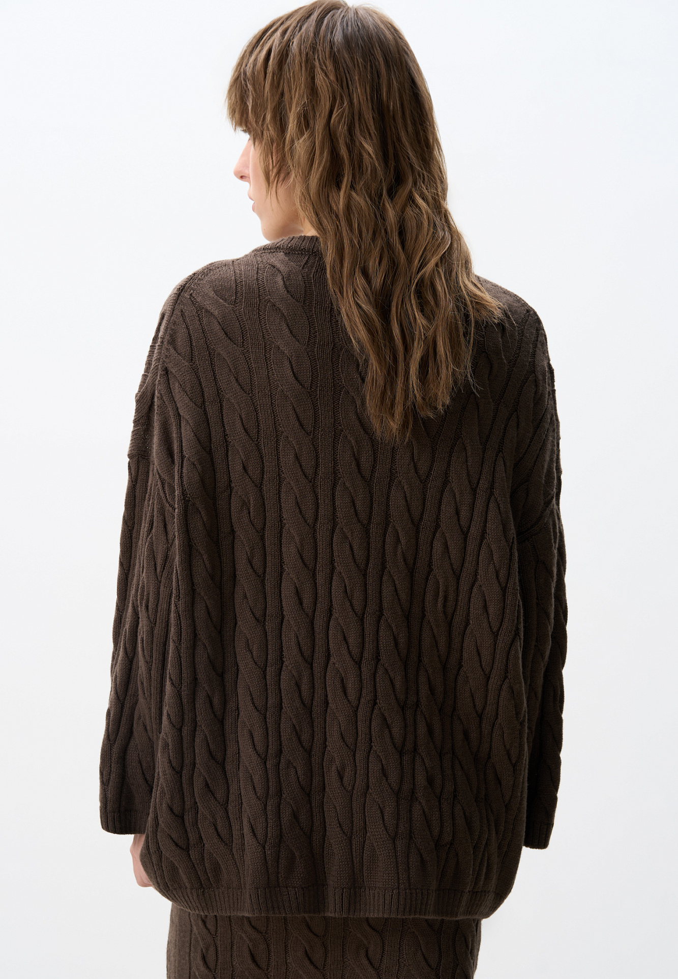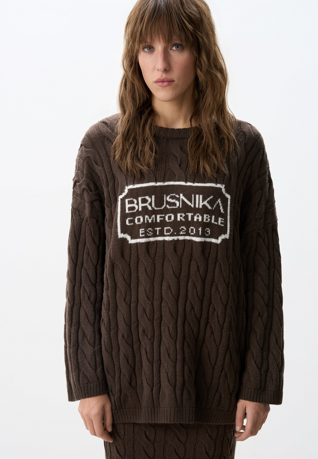 Трикотажный джемпер с объемными косами из мягкой шерсти. Модель свободного силуэта, со спущенной линией плеч и круглым вырезом. Изделие декорировано брендированным жаккардом на груди. Дополнить образ можно брюками и юбкой в том же стиле.