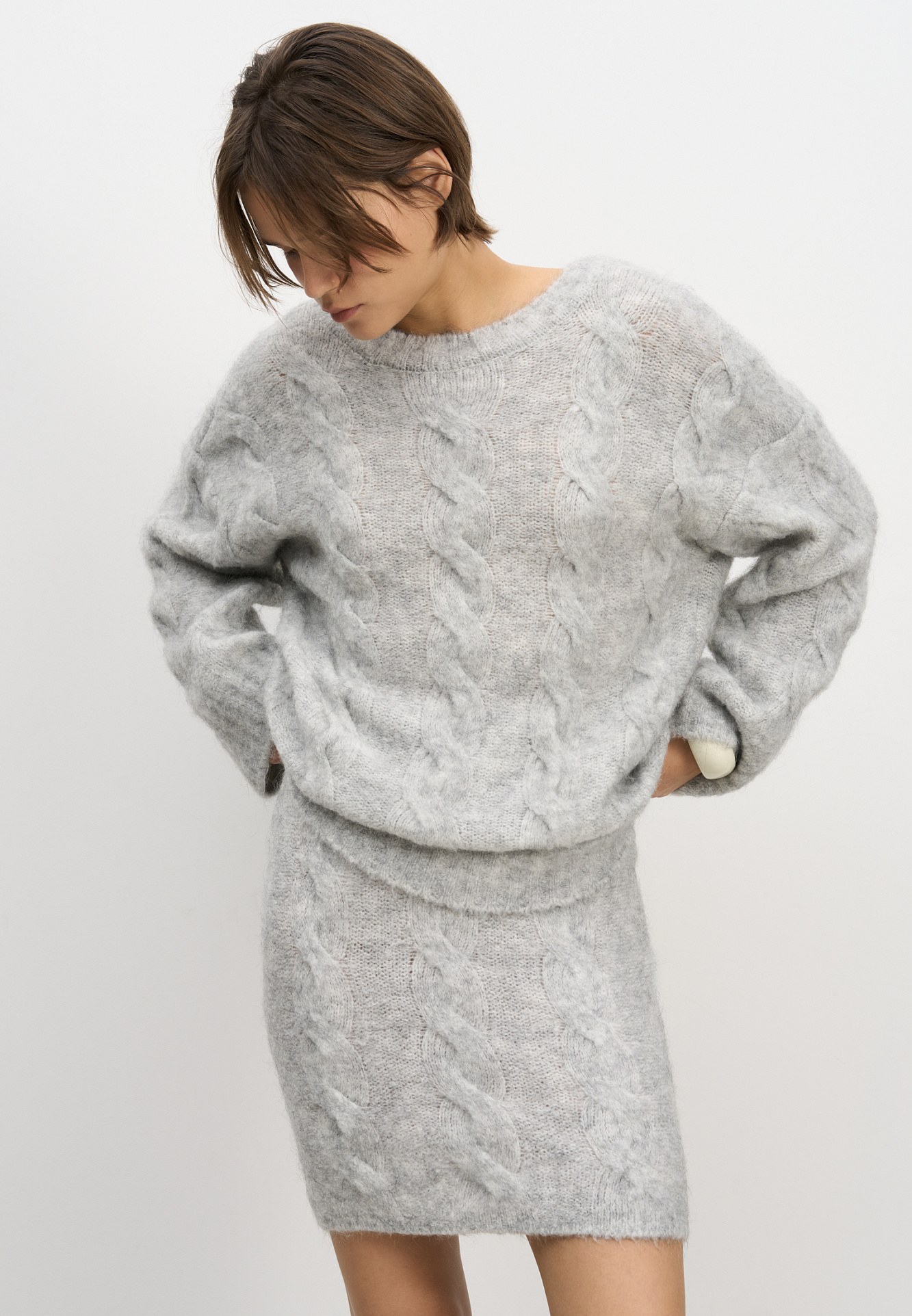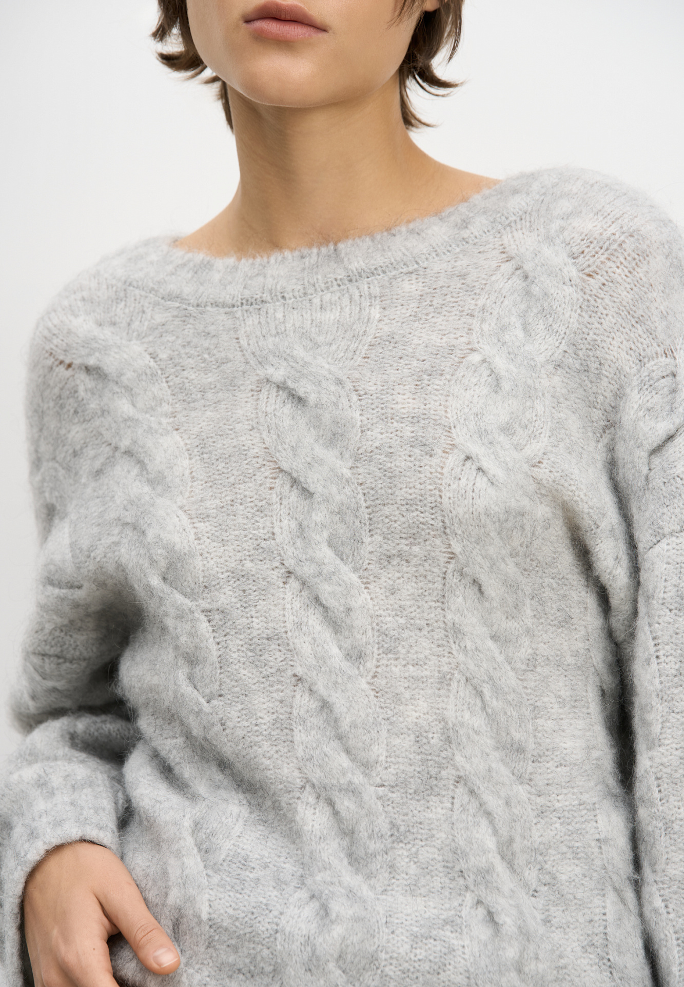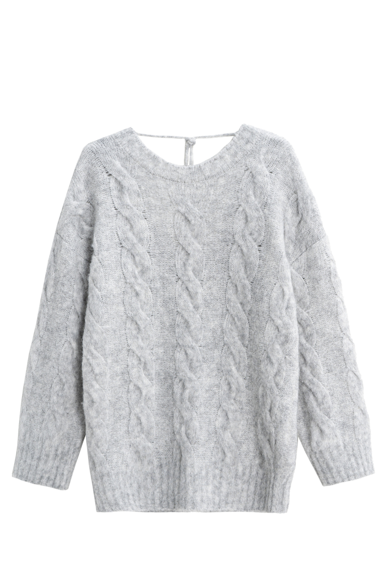 Трикотажный джемпер из шерсти и мохера. Модель свободного силуэта со спущенной линией плеч, длинными рукавами, круглой горловиной и глубоким вырезом на спине, фиксирующимся шнурком. Изделие декорировано фактурной вязкой в виде кос. Края изделия выполнены в рубчик.