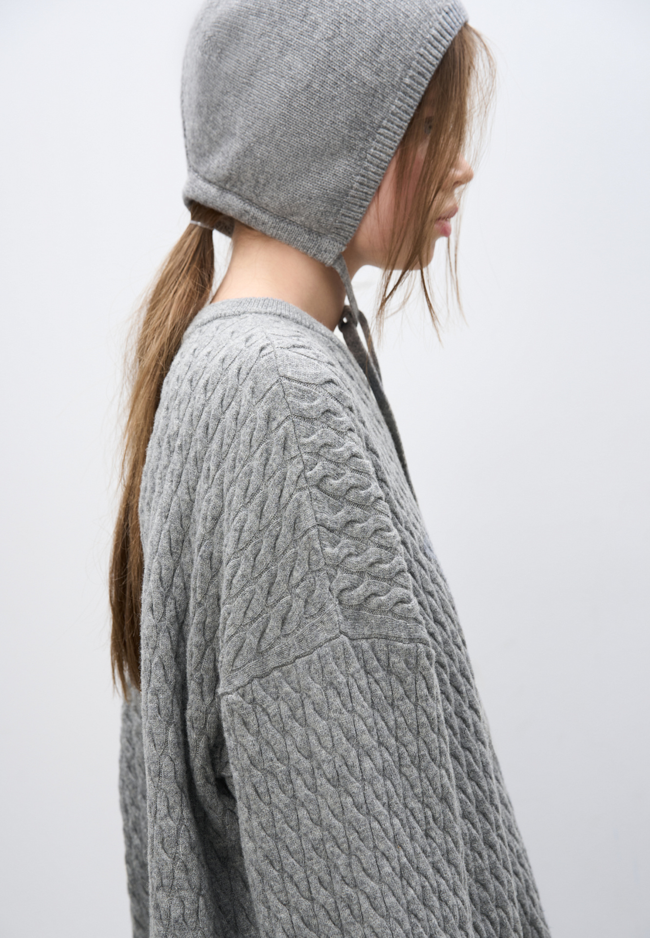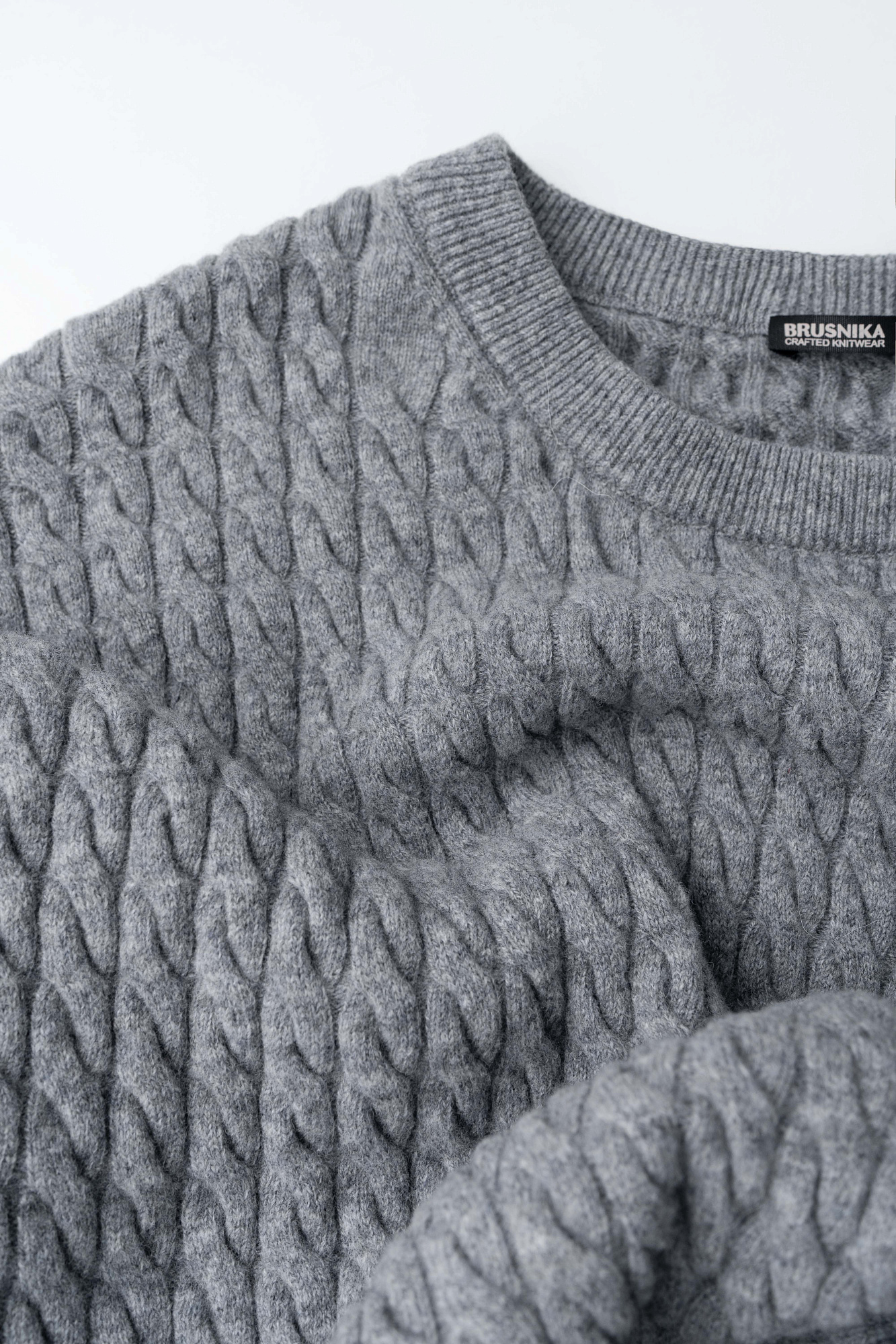 Трикотажный джемпер с объемными косами из 100% шерсти мериноса экстрафайн. Модель свободного силуэта, со спущенной линией плеч и круглым вырезом горловины, оформленным двойной бейкой. Края изделия выполнены в мелкий рубчик.