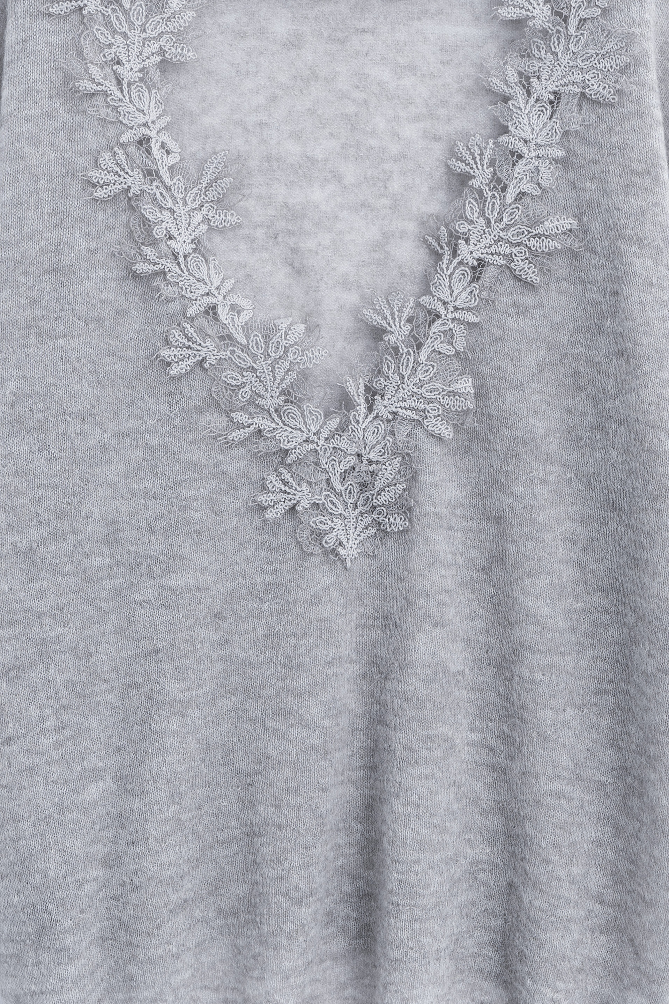 Трикотажный полупрозрачный джемпер из шерсти мериноса экстрафайн и альпака экстрафайн. Модель свободного силуэта со спущенной линией плеча и V-образным вырезом на спинке, декорированным кружевом.