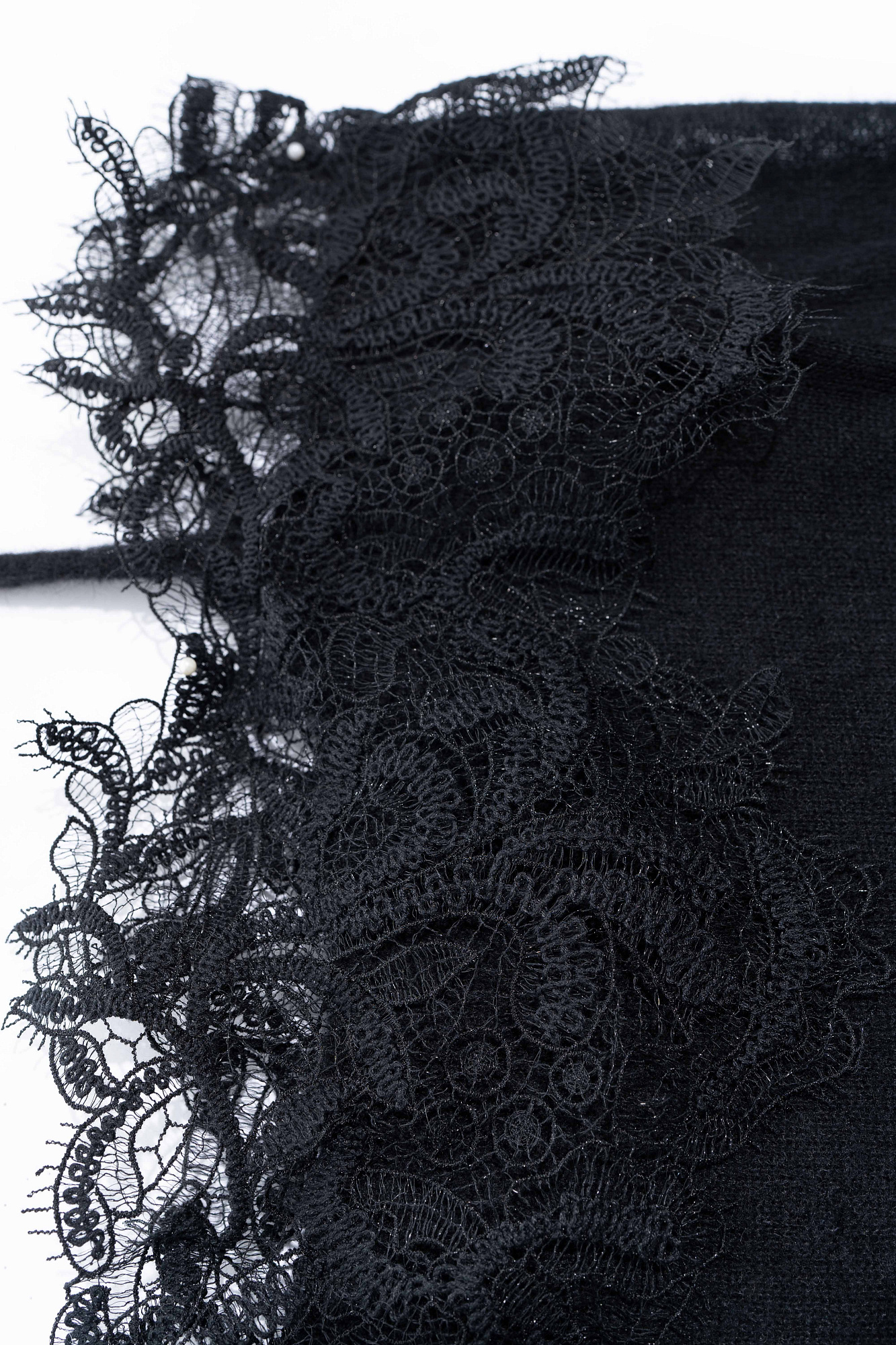 Трикотажный лонгслив из шерсти мериноса экстрафайн и альпака суперфайн. Модель по фигуре на тонких бретелях с длинными рукавами и открытой линией плеч. Декольте декорировано кружевом.