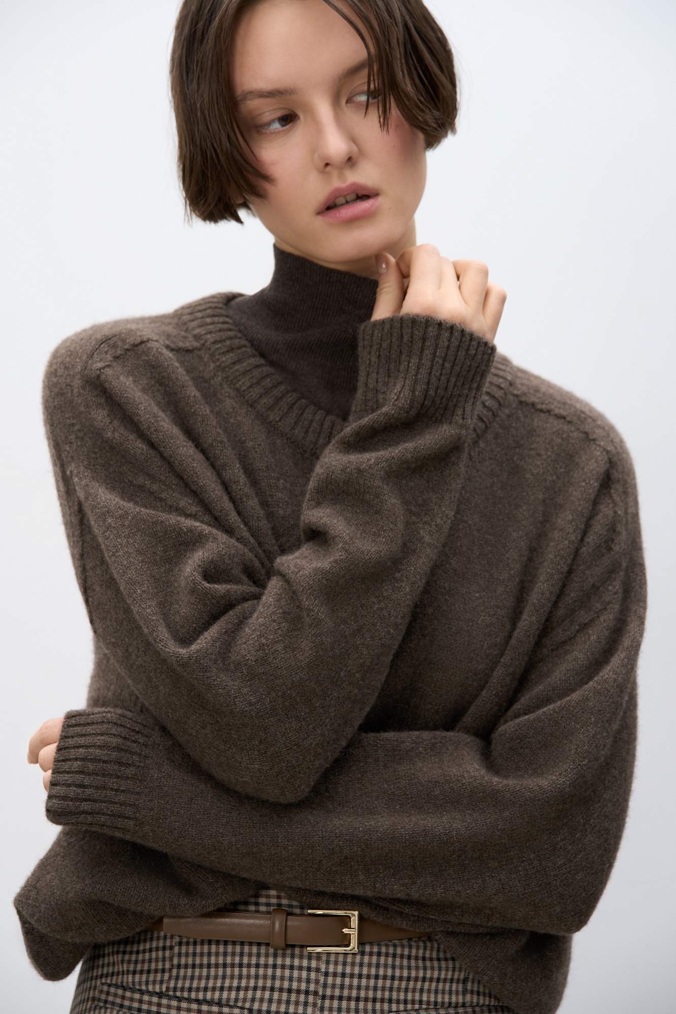 Трикотажный джемпер из 100% шерсти яка. Модель свободного силуэта с вывязанной круглой горловиной и планкой на пуговицах. Низ изделия и манжеты рукавов выполнены в рубчик.