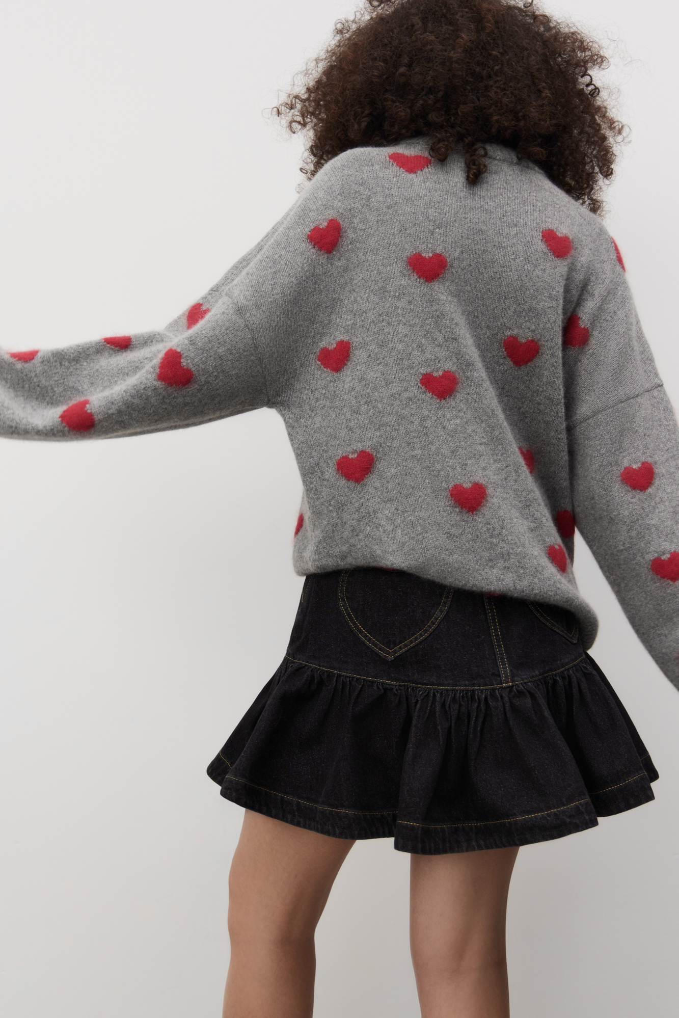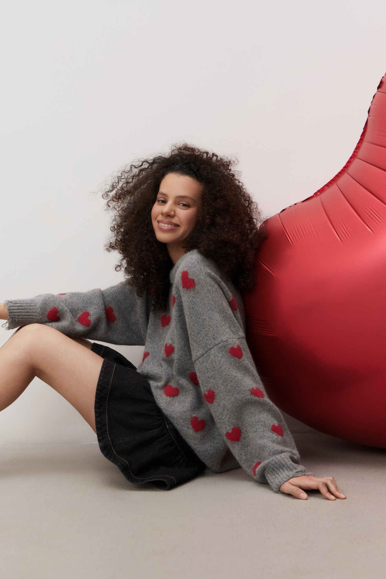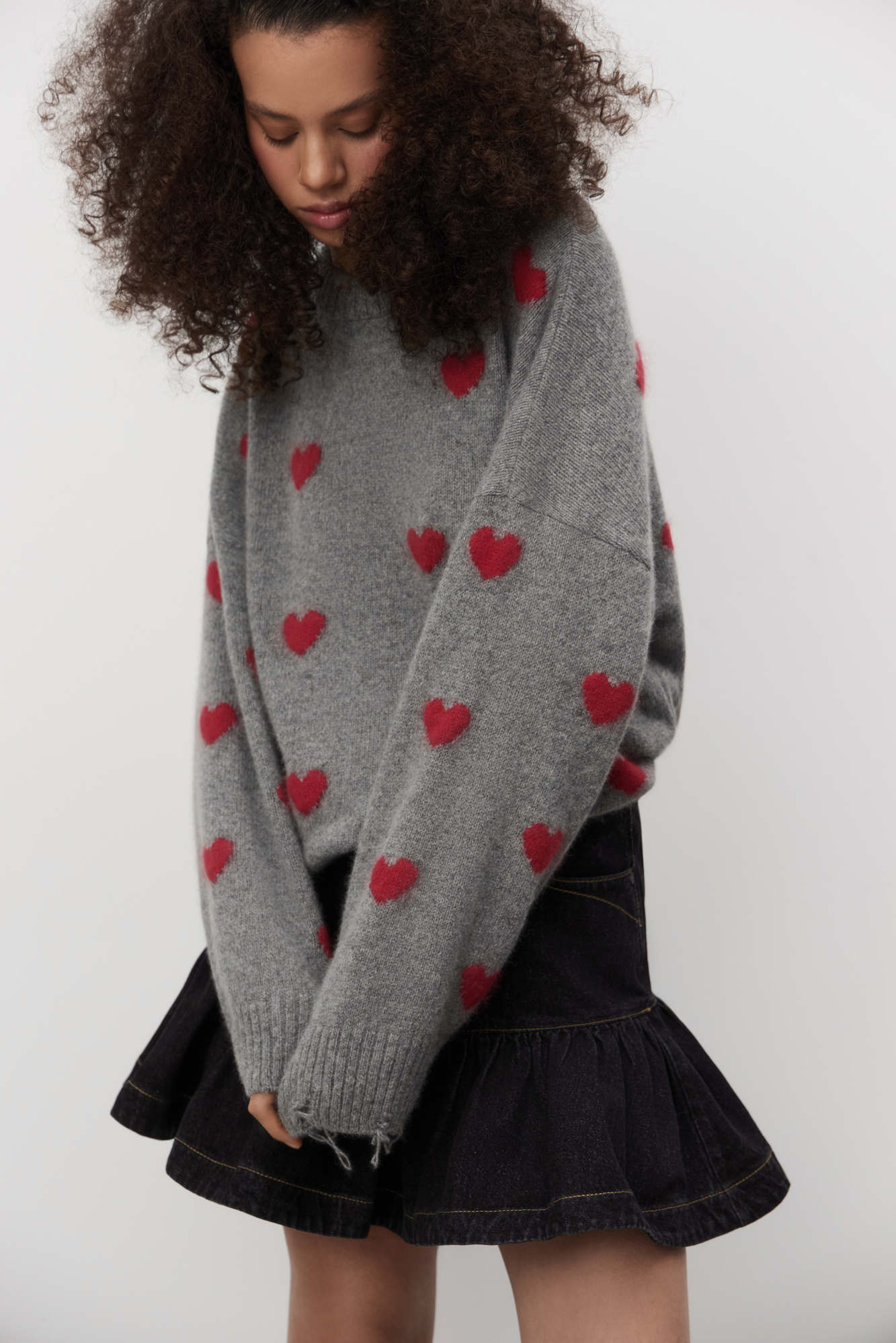 Джемпер из шерсти и пуха лисы с жаккардовым рисунком в виде сердечек. Модель свободного силуэта со спущенной линией плеч и круглым вырезом горловины. Манжеты рукавов и низ изделия выполнены в шикорий рубчик с разрезами в стиле гранж.
