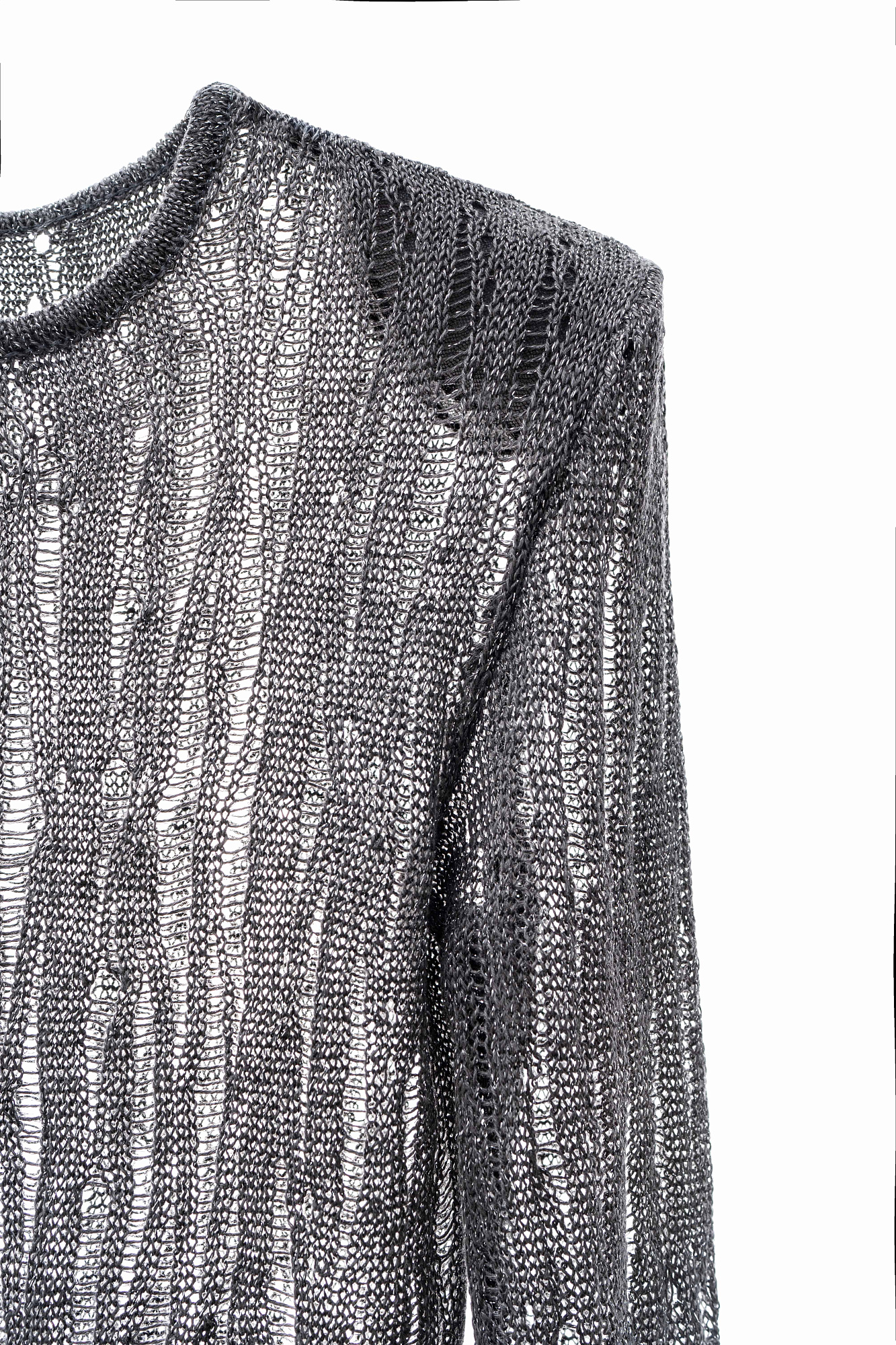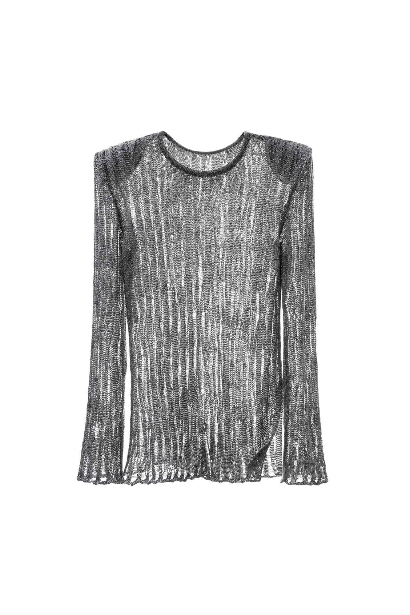 Полупрозрачный джемпер, выполненный изо льна с добавлением люрекса. Модель по фигуре с круглым вырезом горловины и невысоким разрезом сбоку. Изделие с подплечниками.