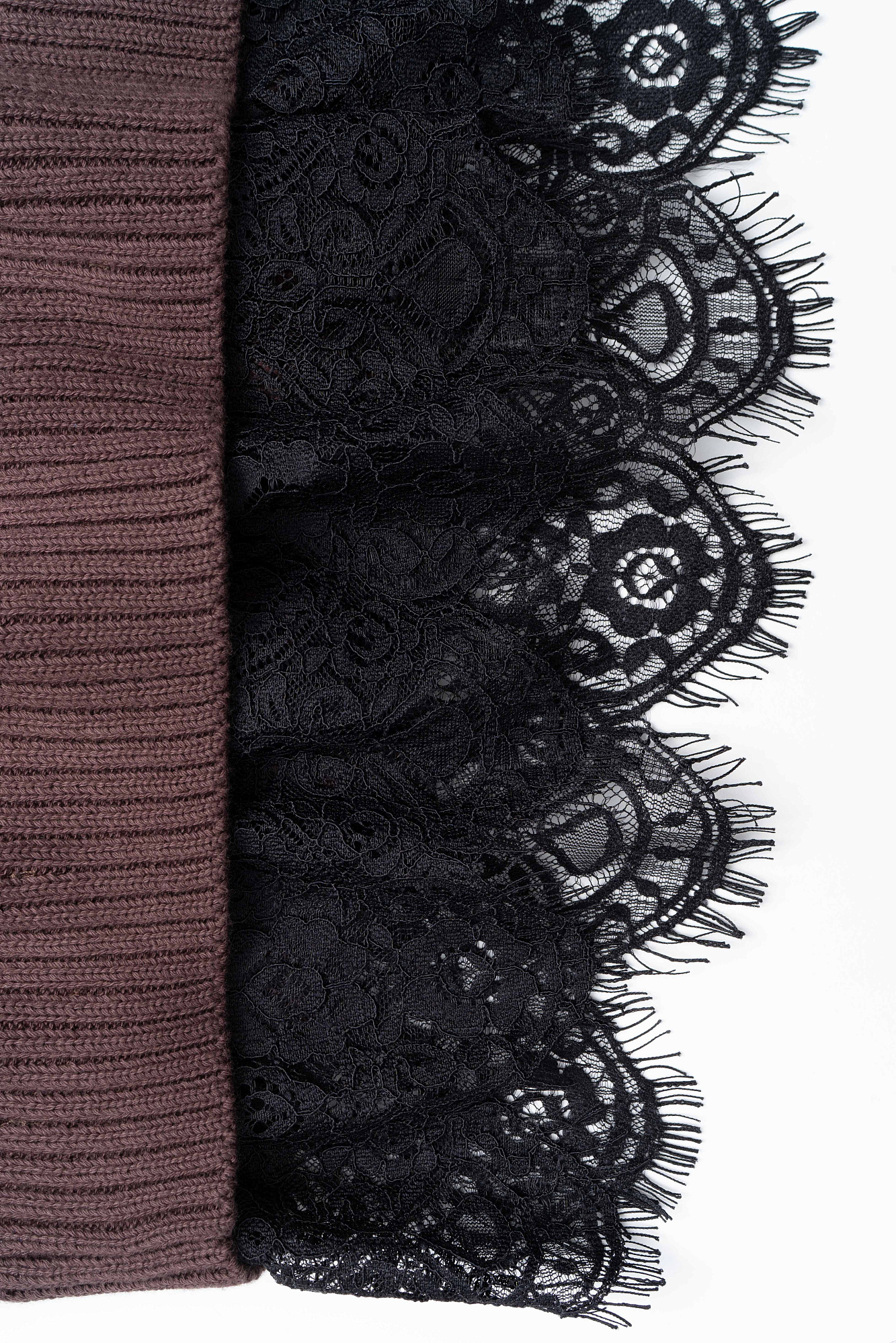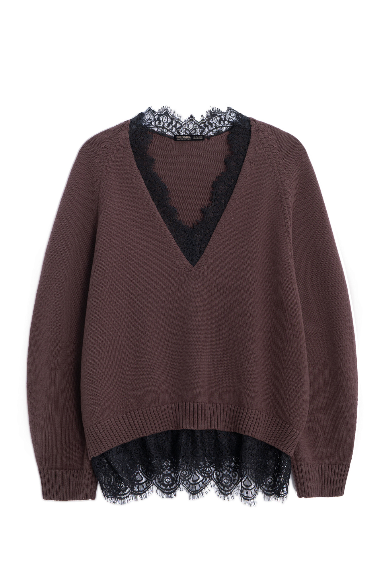 Трикотажный джемпер из 100% хлопка. Модель свободного силуэта с рукавом реглан и V-образным вырезом. Вырез и низ изделия декорированы кружевом контрастного цвета.