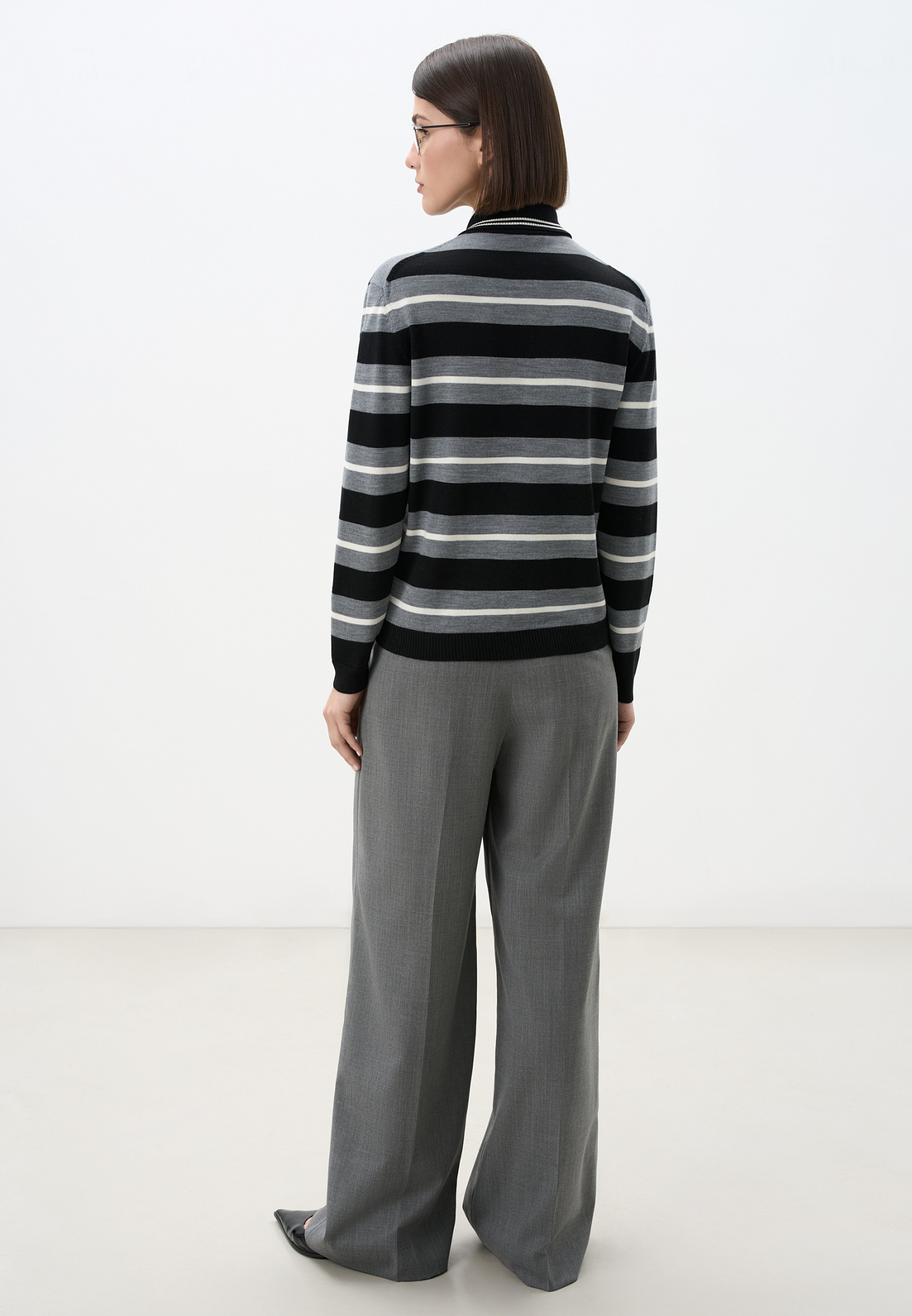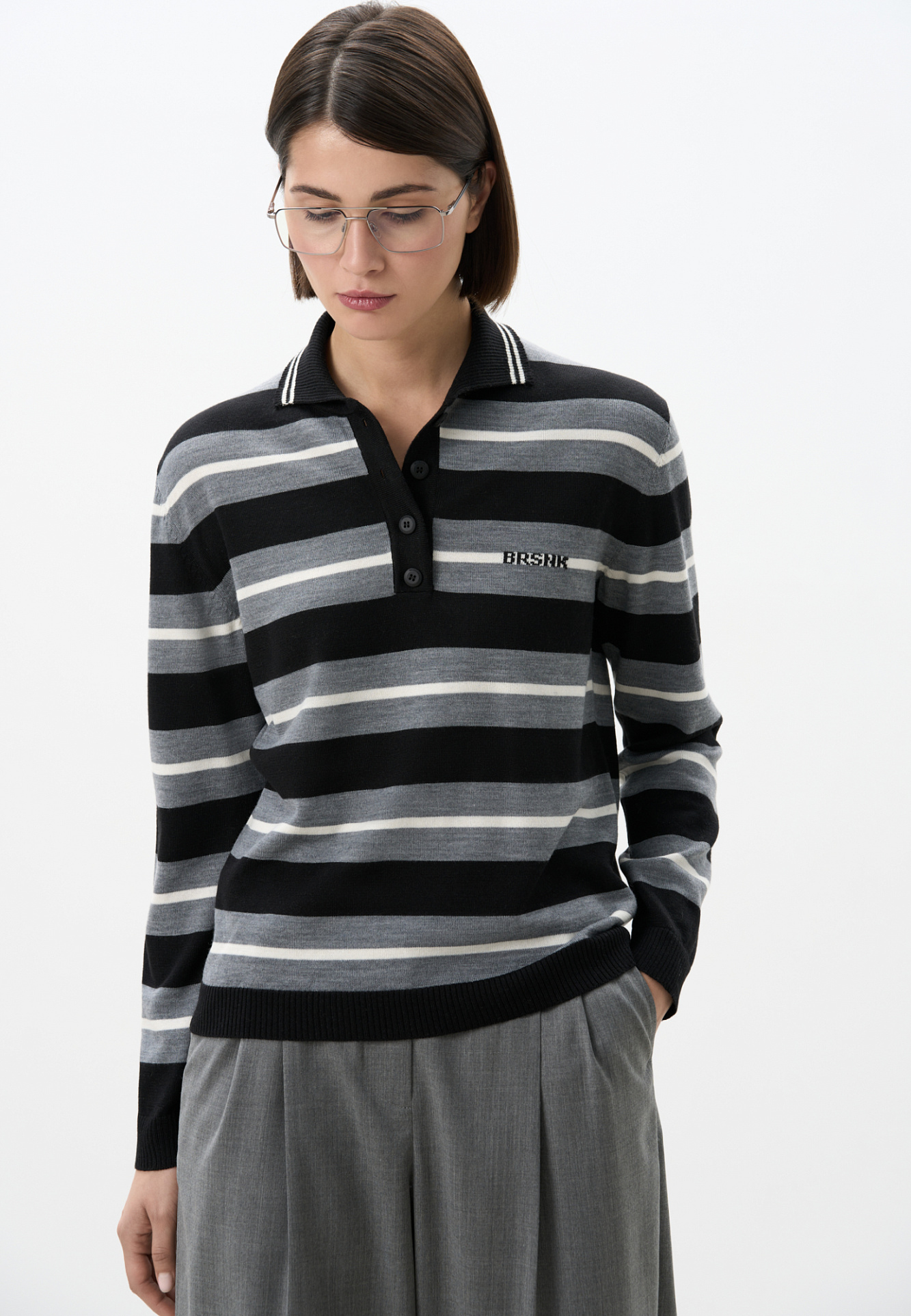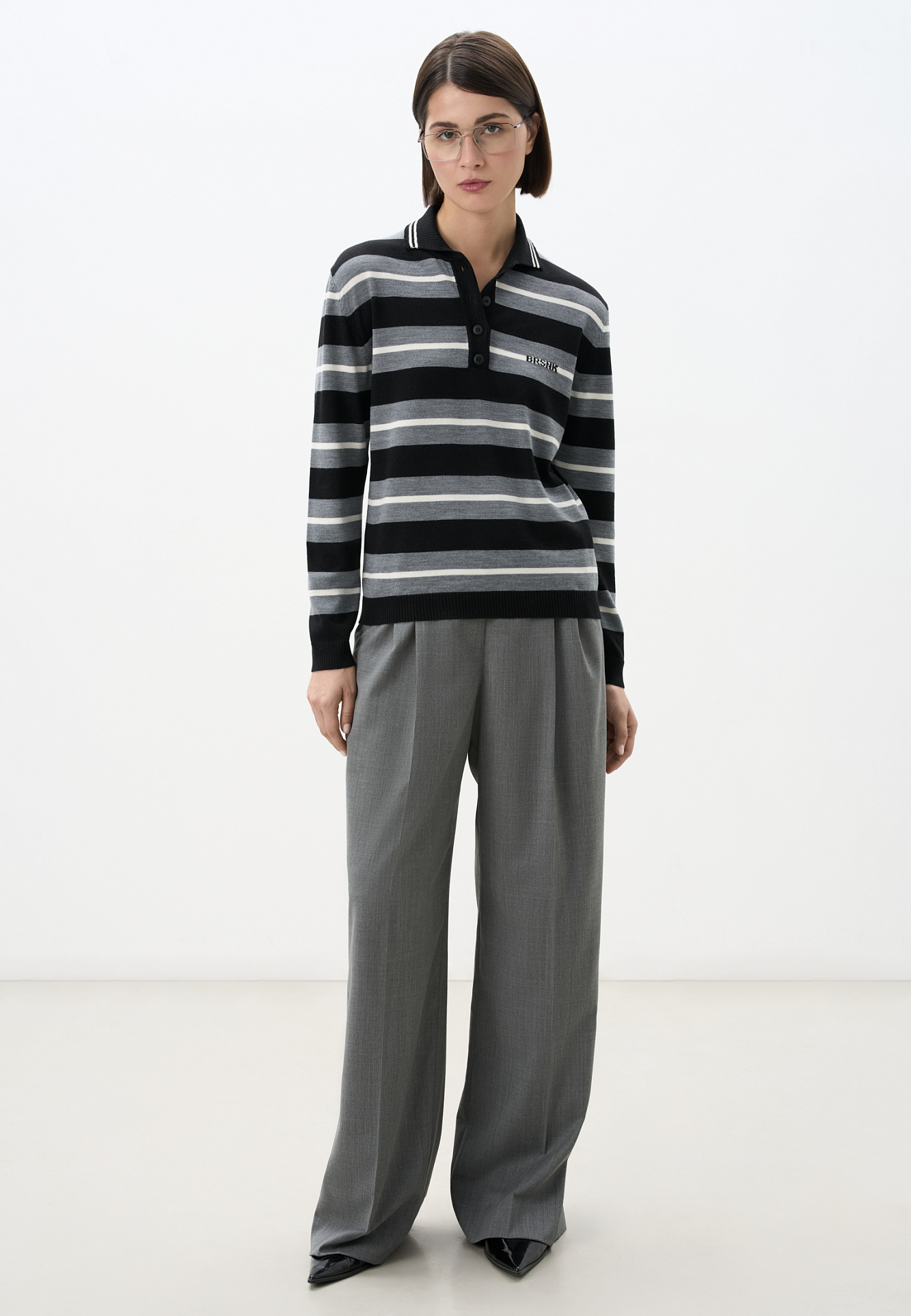 Трикотажный джемпер из шерсти в полоску. Модель свободного силуэта, с длинными рукавами, воротником поло на пуговицах и брендированным жаккардом на груди. Манжеты, воротничок и низ изделия выполнены в рубчик.