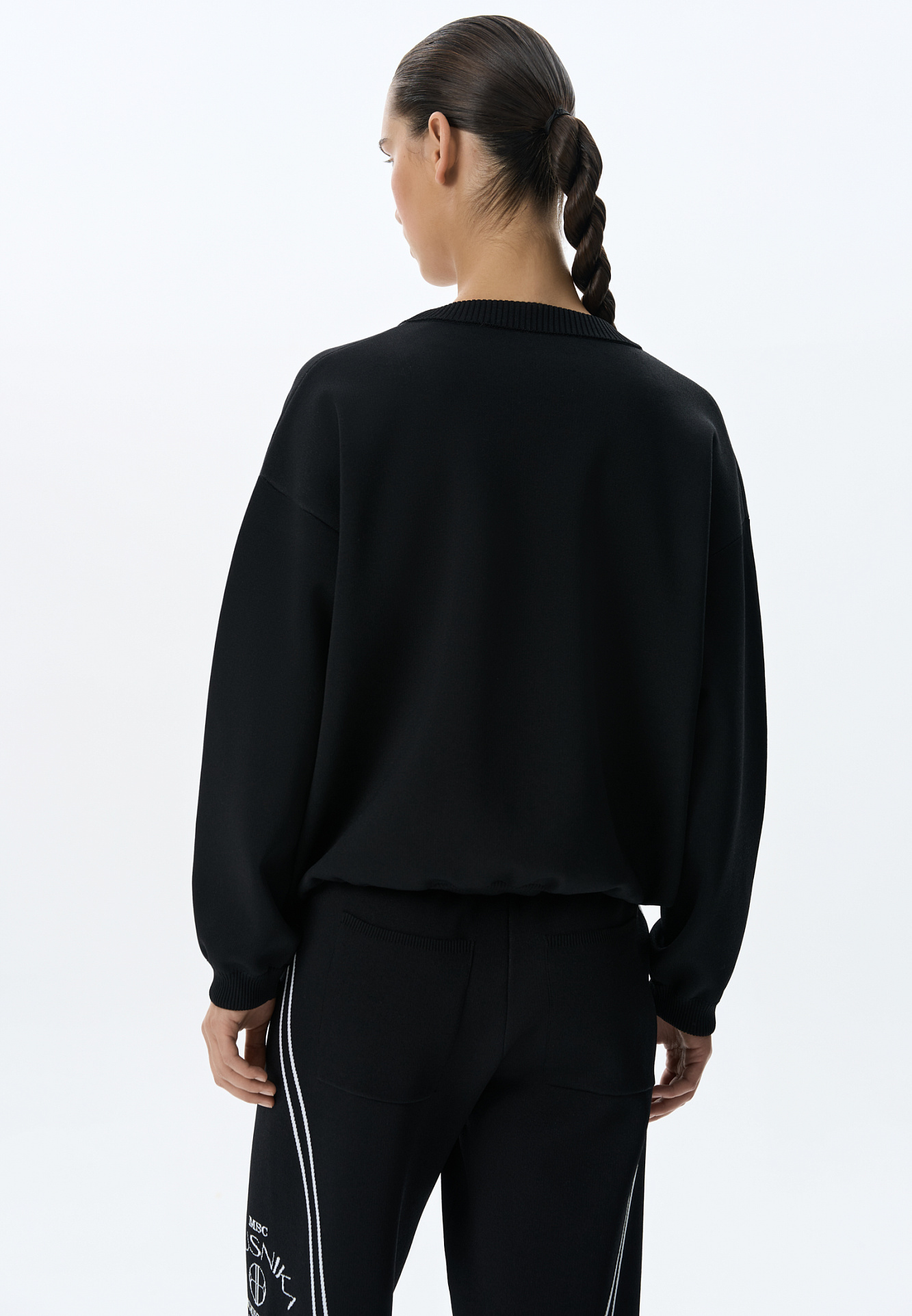 Трикотажный джемпер из вискозы. Модель свободного силуэта, с длинными рукавами, спущенной линией плеч и круглым вырезом горловины. Края выполнены в рубчик. Изделие декорировано брендированным жаккардом.
