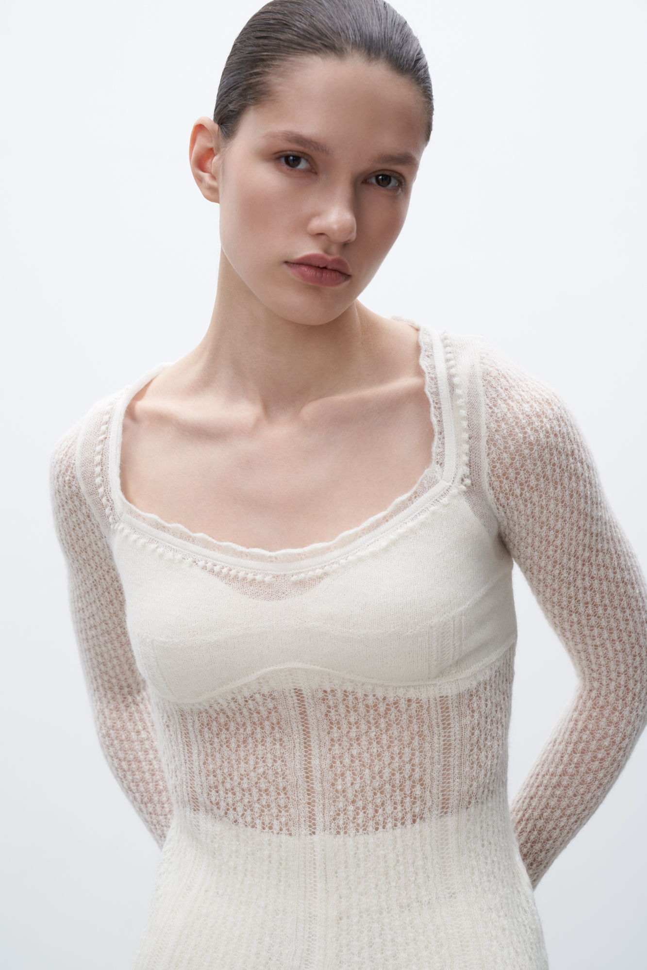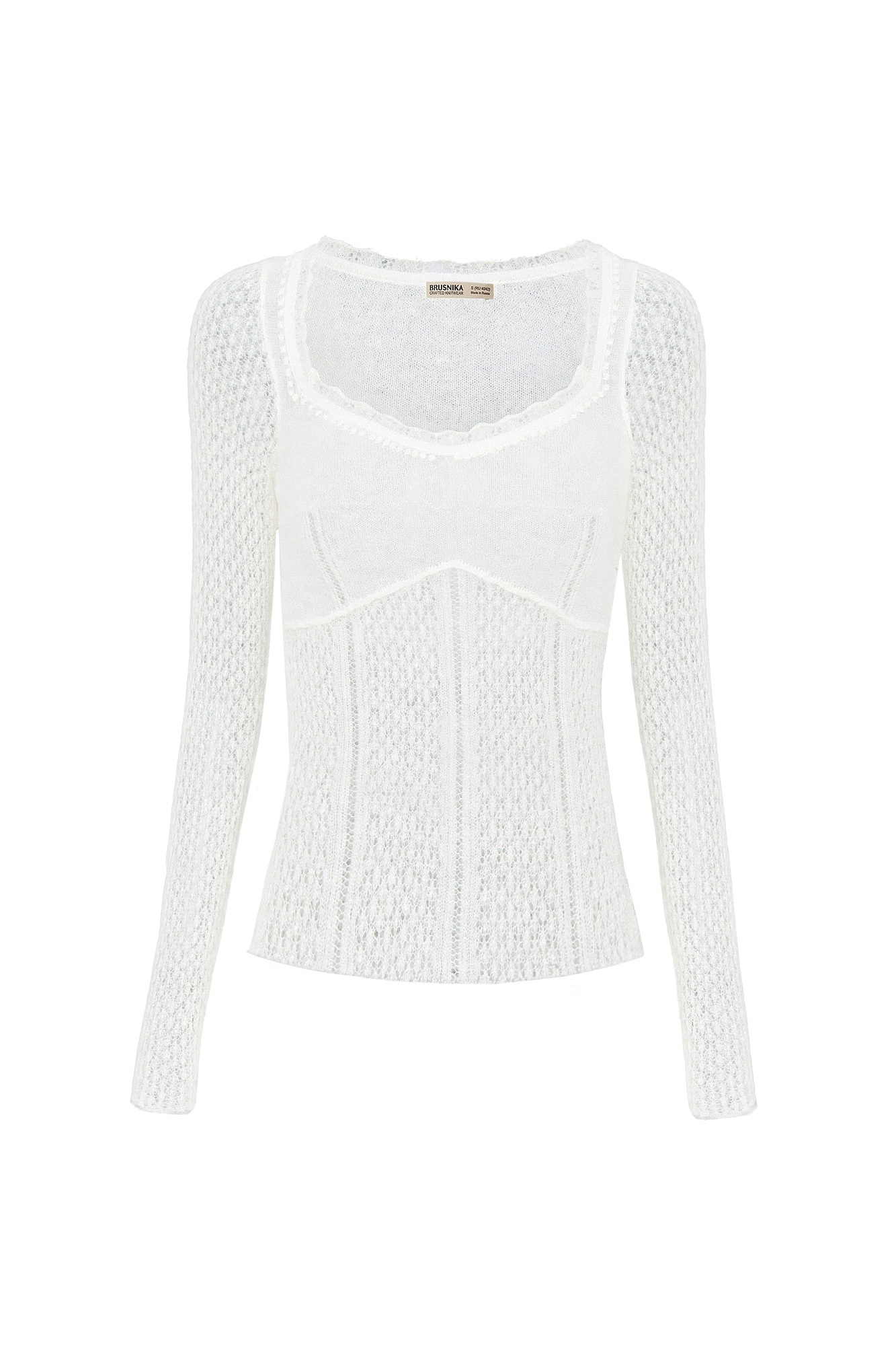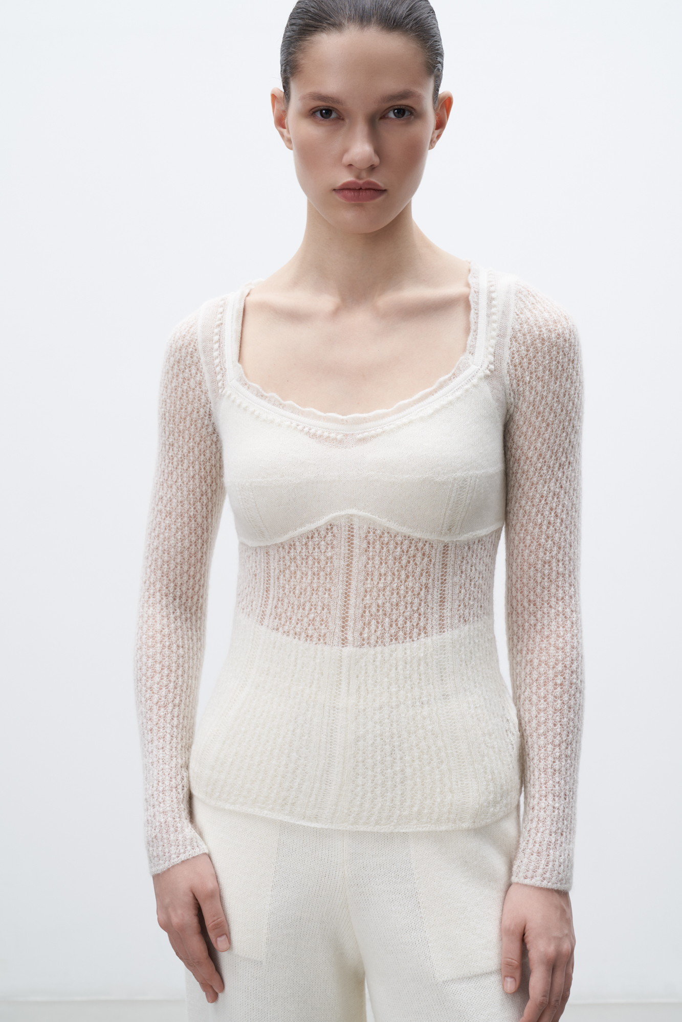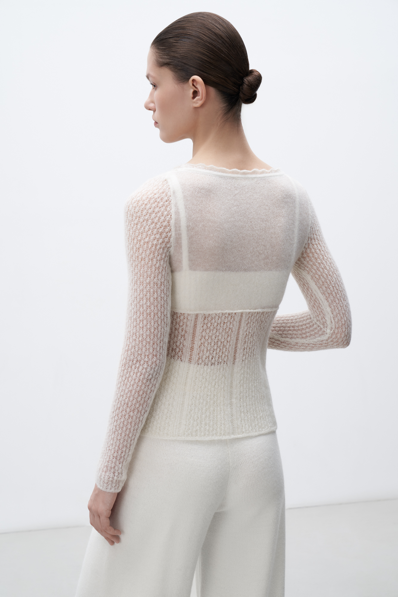 тонкий ажурный джемпер из супер кид мохера и шерсти беби альпака. Модель приталенного силуэта, с глубоким вывязаным декольте и длинными рукавами.