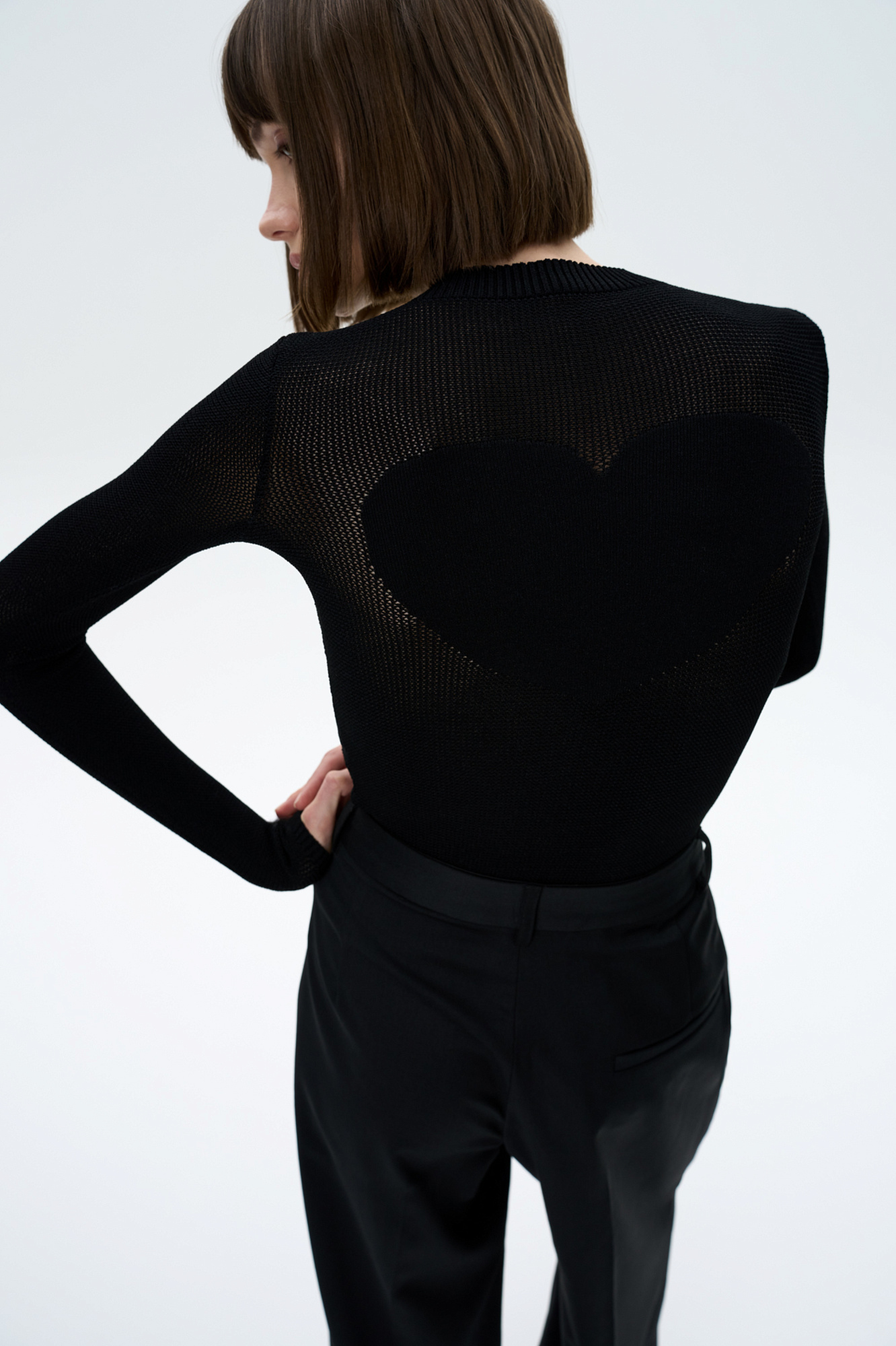 Трикотажный лонгслив с орнаментов в виде большого сердца на спине. Модель по фигуре выполнена ажурным переплетением с имитацией "сетки".