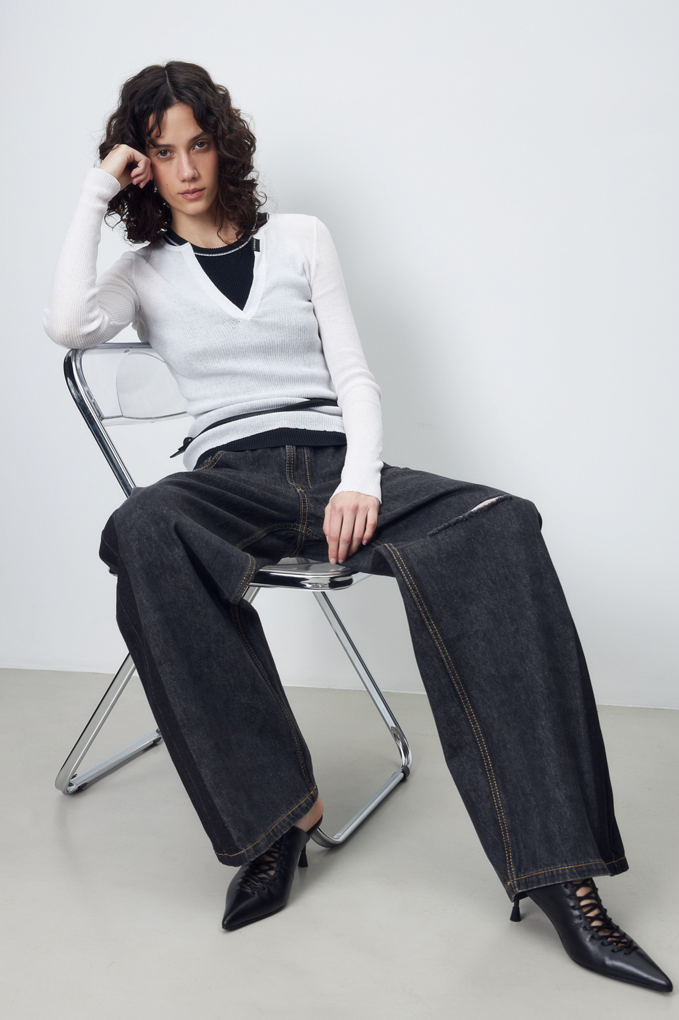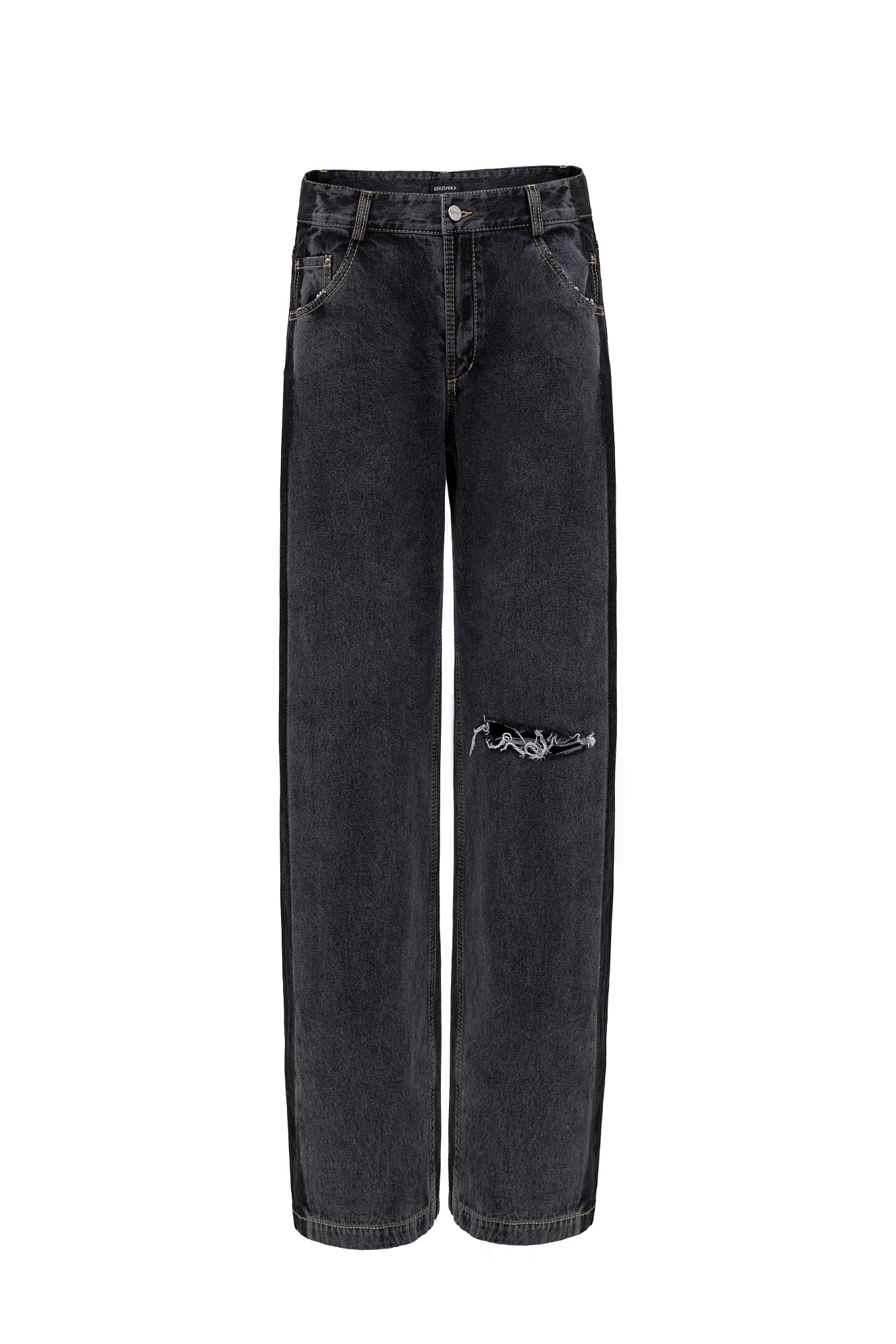 Джинсы из 100% хлопка с низкой посадкой. Модель прямого силуэта с разрезом на ноге и широким лампасом. Застежка на молнию и пуговицу.