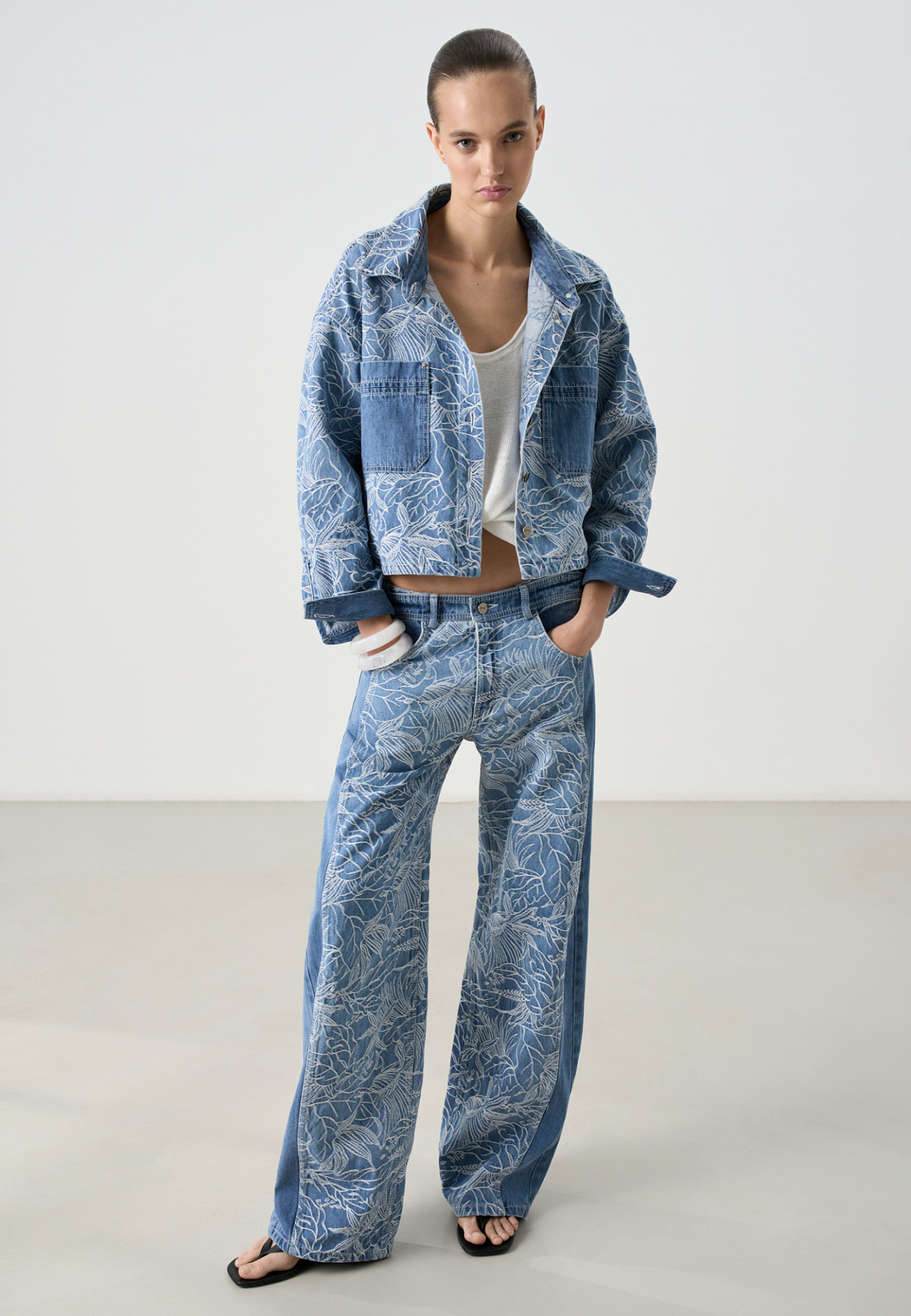 Принтованные джинсы из 100% хлопка. Модель прямого кроя, с вертикальными вытачками и широкими лампасами. Шлевки на поясе для ремня, застежка на молнию и пуговицу. 4 кармана.
