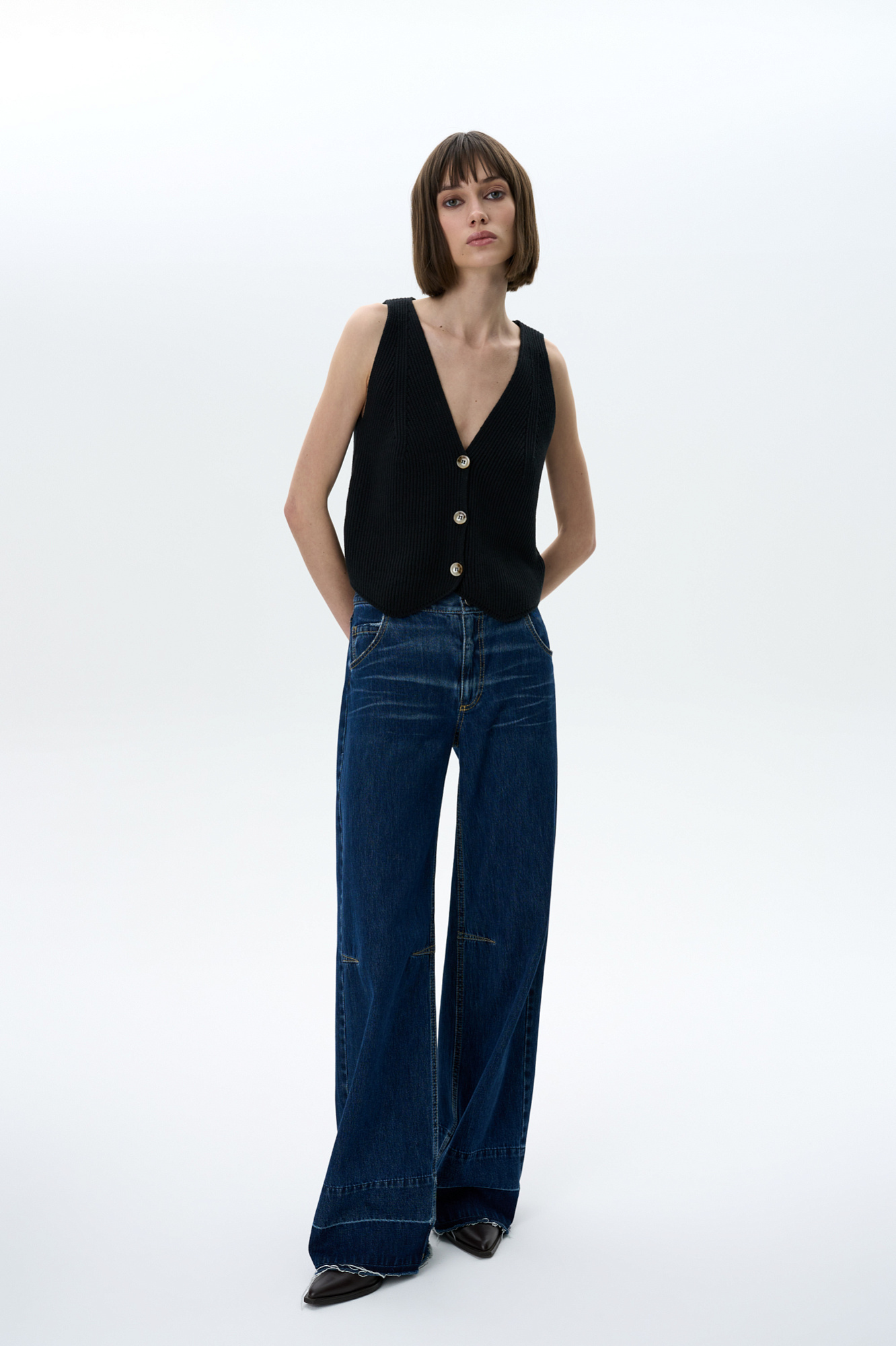 Прямые джинсы со средней посадкой с потертостями и контрастной отстрочкой. Потайная застежка на молнию и пуговицу. Необработанный низ. Четыре кармана.