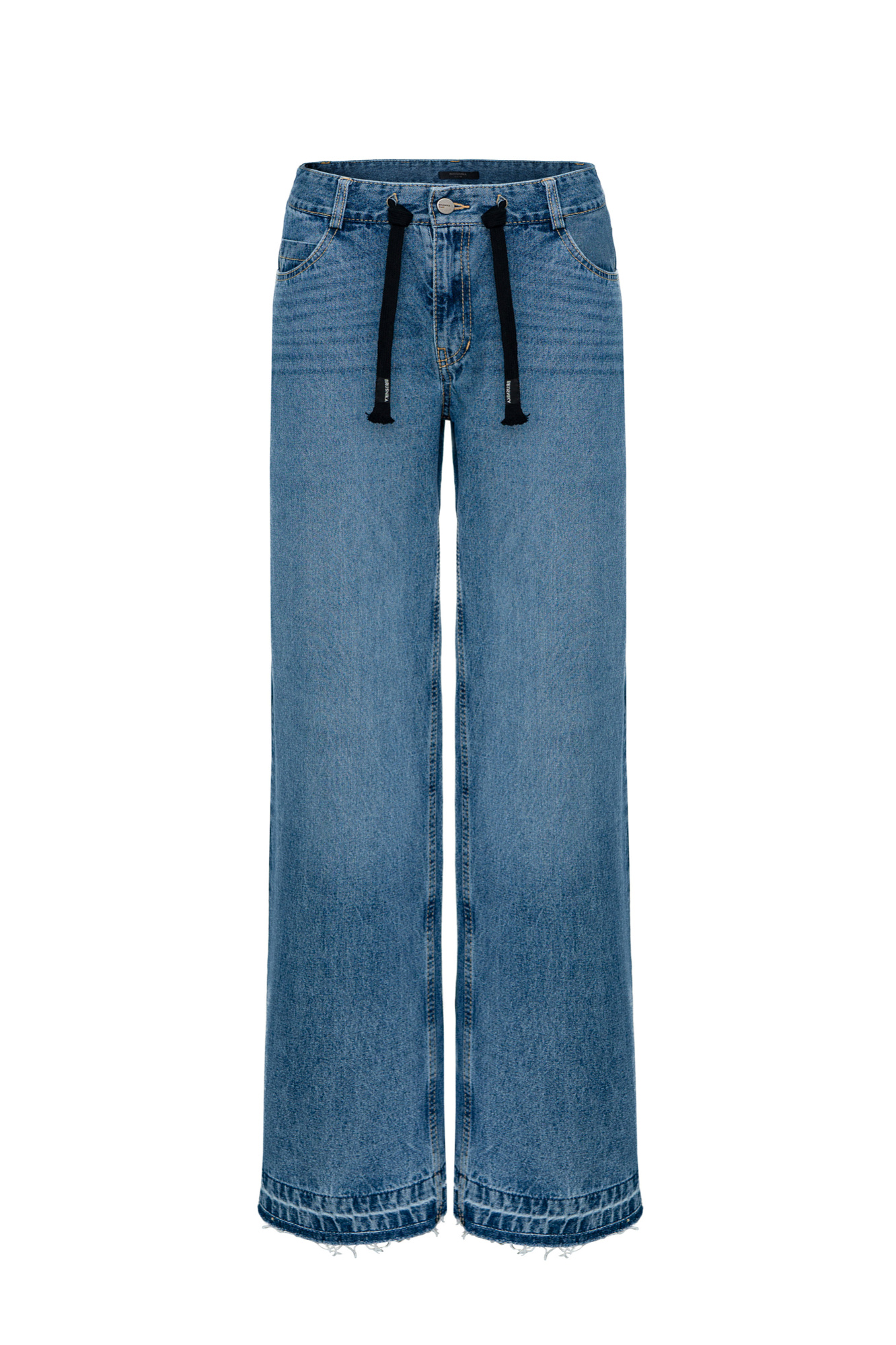 Прямые джинсы из 100% хлопка с боковыми карманами. Модель со средней посадкой, брендированной кулиской и потайной застежкой на молнию и пуговицу.