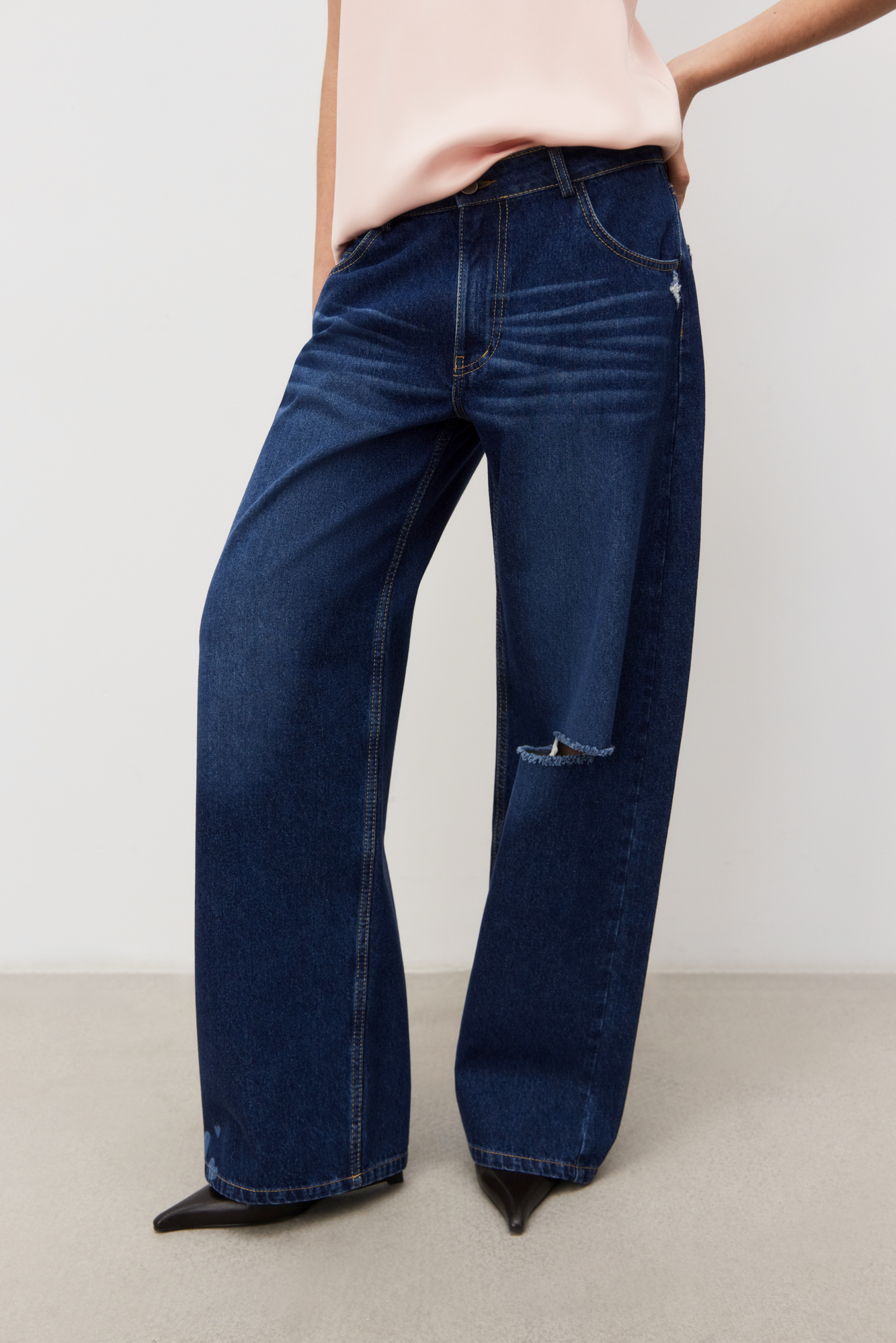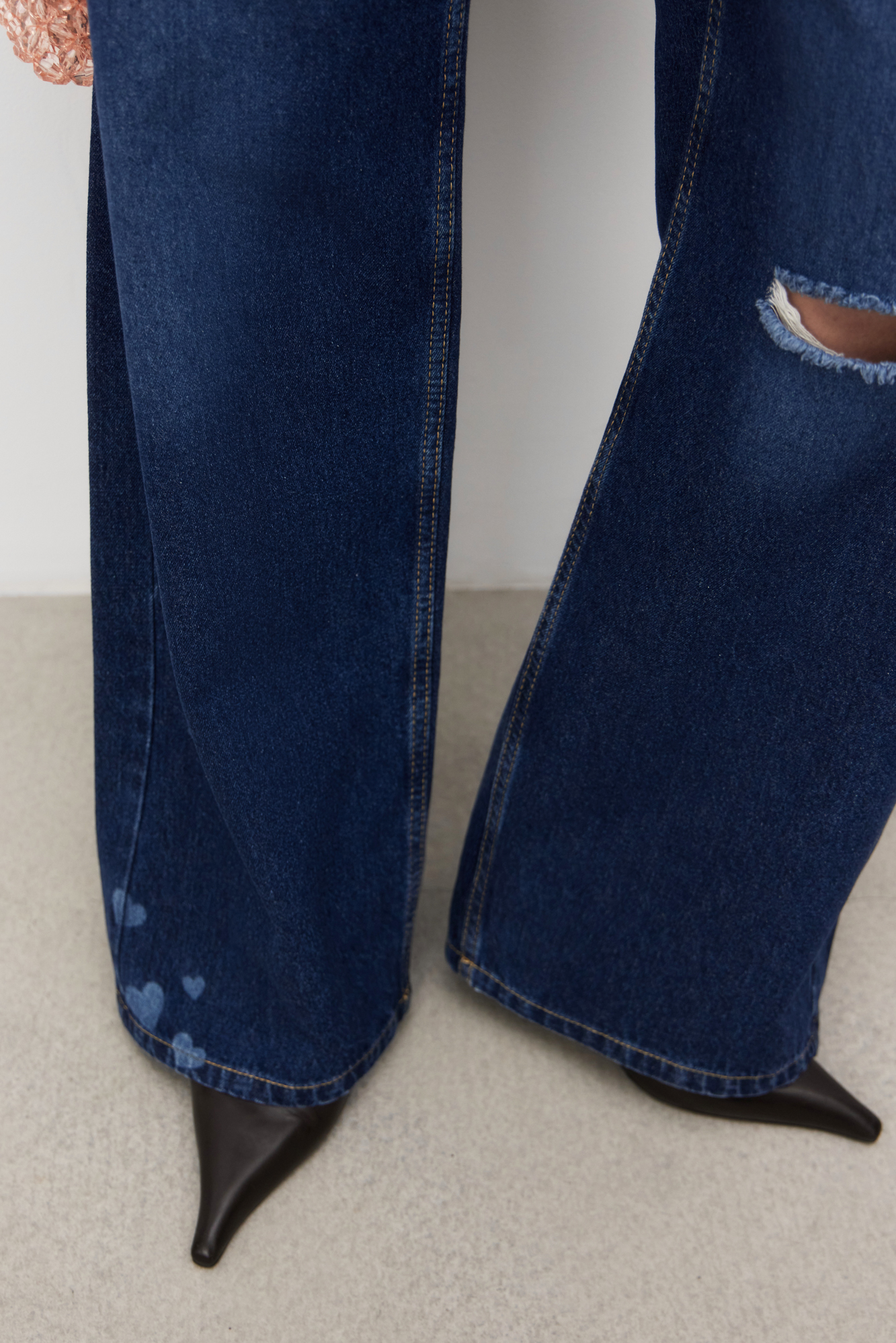 Джинсы из 100% хлопка с принтом в виде сердечек. Модель прямого силуэта со средней посадкой. Изделие декорировано разрезом на коленке и фигурными задними карманами в виде сердец. Застежка на молнию и пуговицу.
