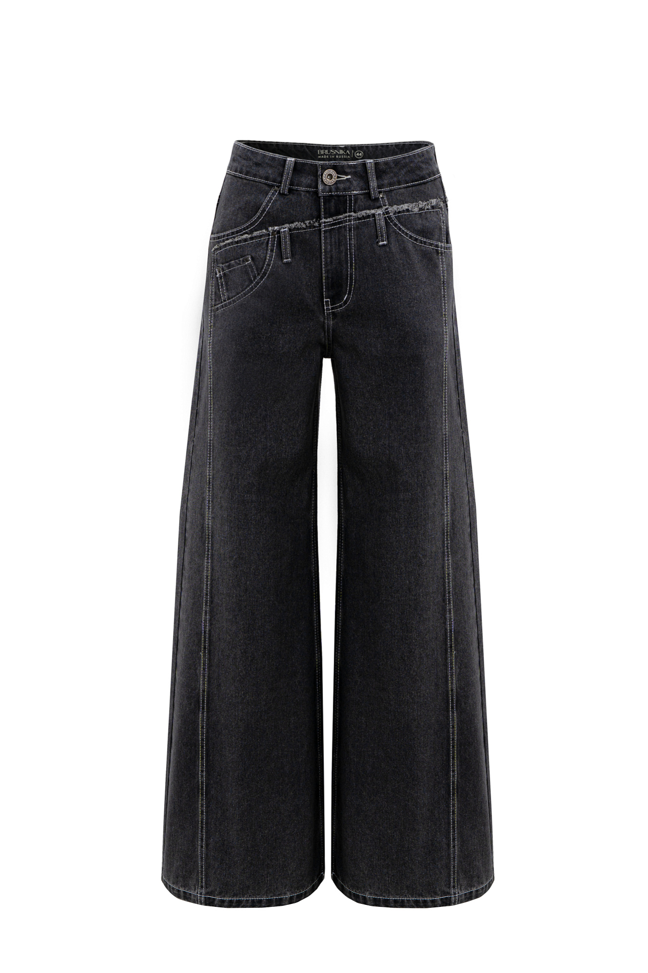 Джинсы с асимметричной деталью на поясе в виде второго яруса. Модель прямого кроя с небольшим расклешением. Пять карманов. Застежка на молнию и металлическую пуговицу.