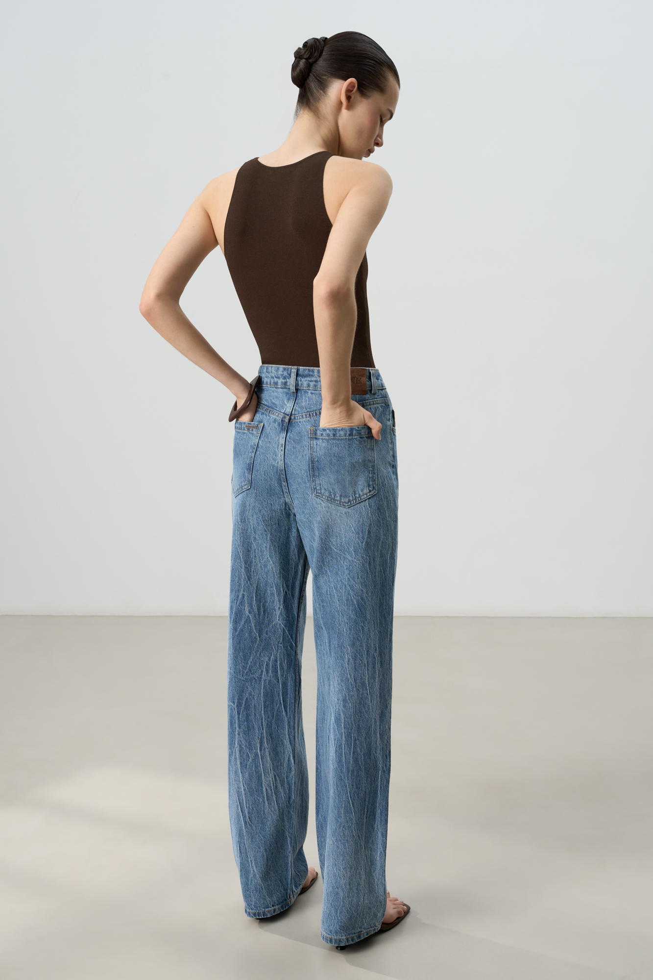 Джинсы из 100% хлопка. Модель прямого широкого кроя, с классической посадкой, пятью карманами, шлевками на поясе для ремня и застежкой на молнию и пуговицу. Эффект “мраморной” стирки по всей поверхности. Маленький карман с отделкой из коричневой экокожи.