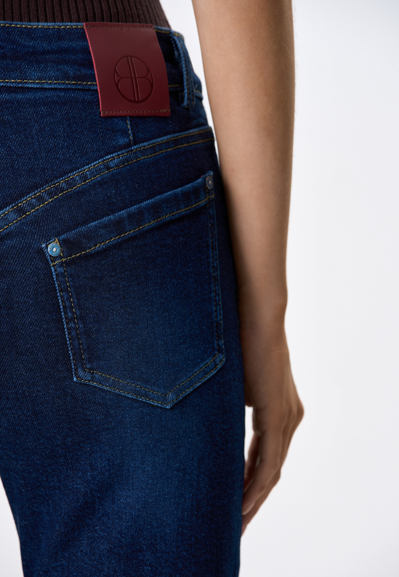 Расклешенные джинсы из 100% хлопка. Модель облегающего до колен кроя с высокой посадкой. Пять карманов. Застежка на молнию и металлическую пуговицу.