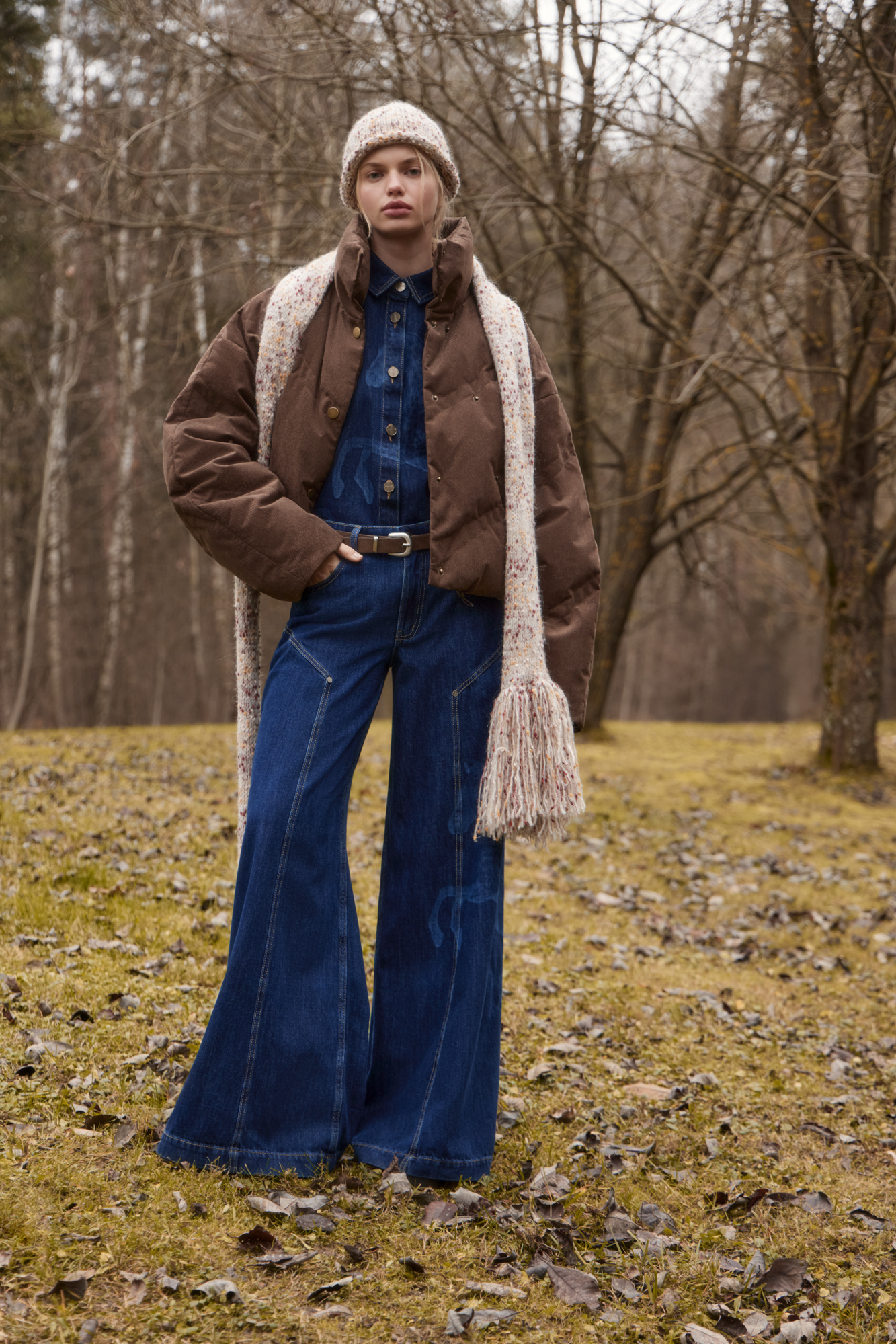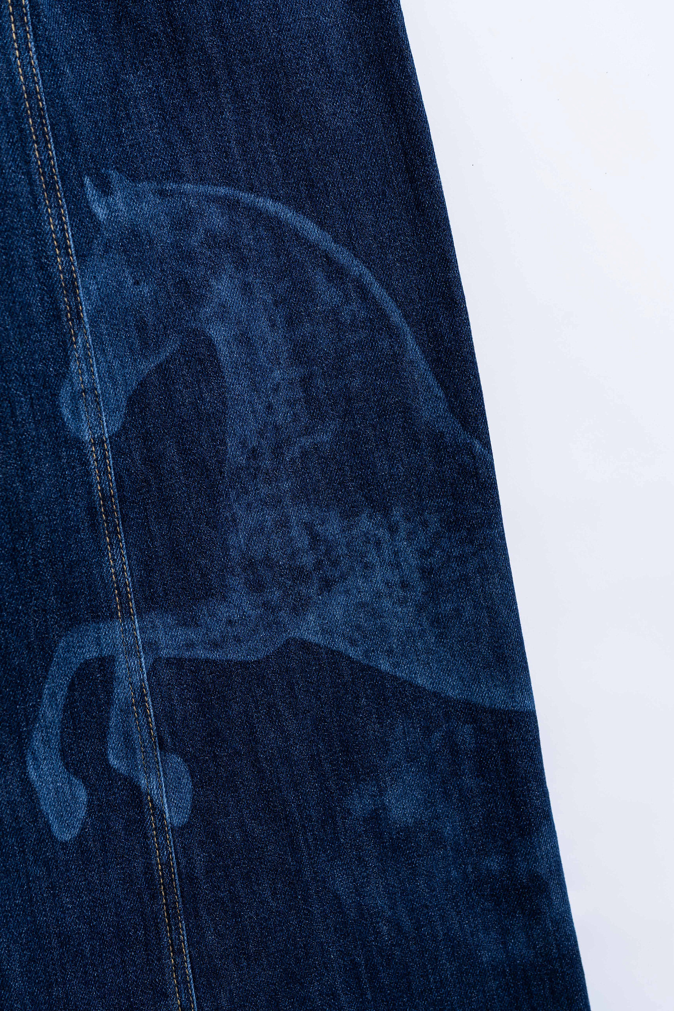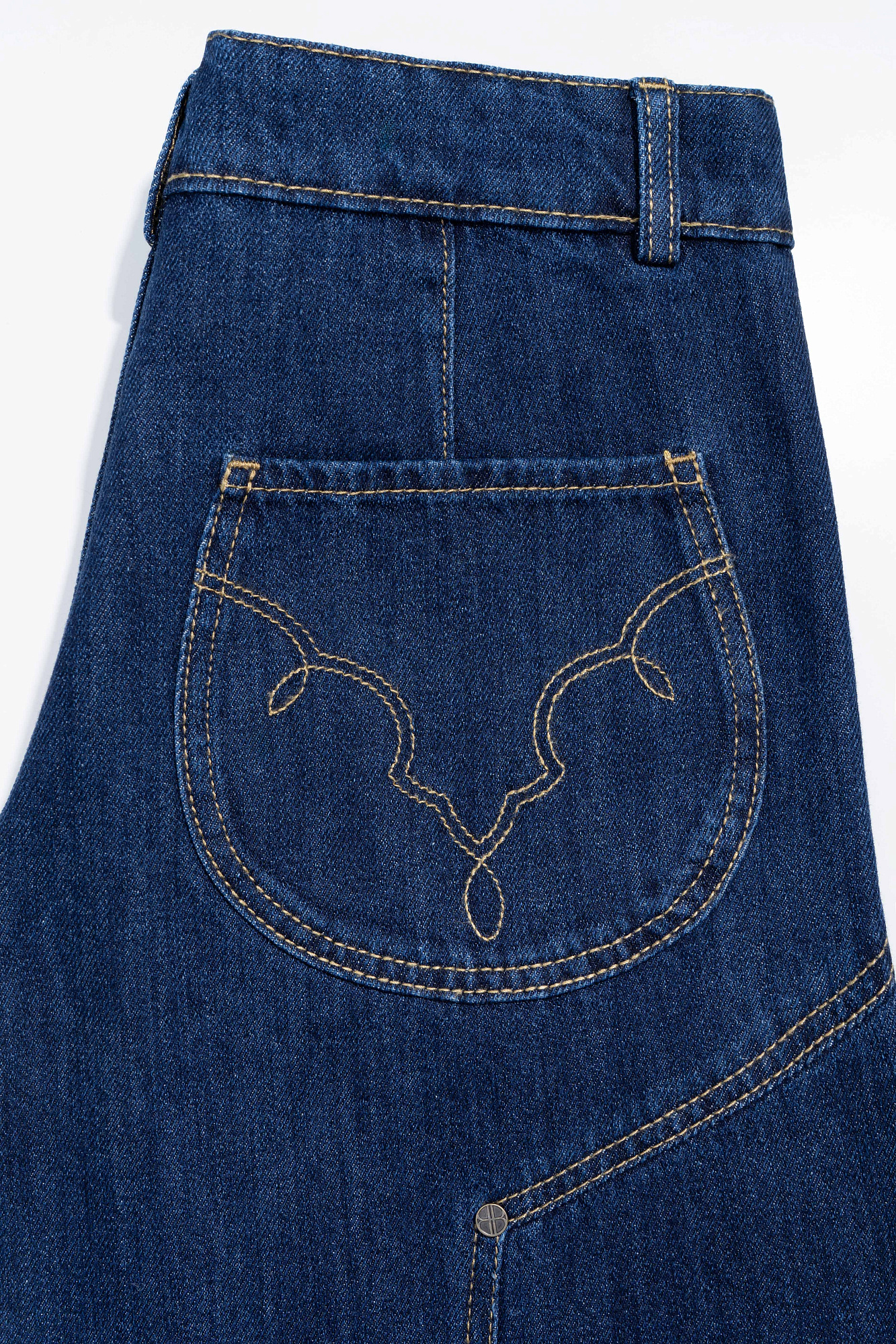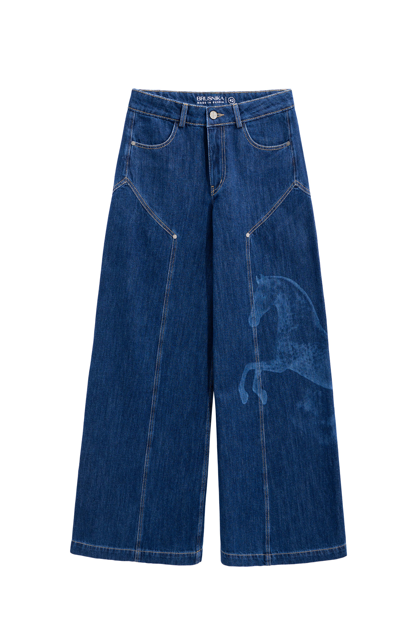 Широкие джинсы из 100% хлопка с принтом лошадей. Модель на средней посадке, с пятью карманами и шлевками на поясе для ремня. Застежка на молнию и пуговицу. На штанинах изделие декорировано принтом лошадей, выполненным лазером, и объемными геометрическими вытачками с заклепками.