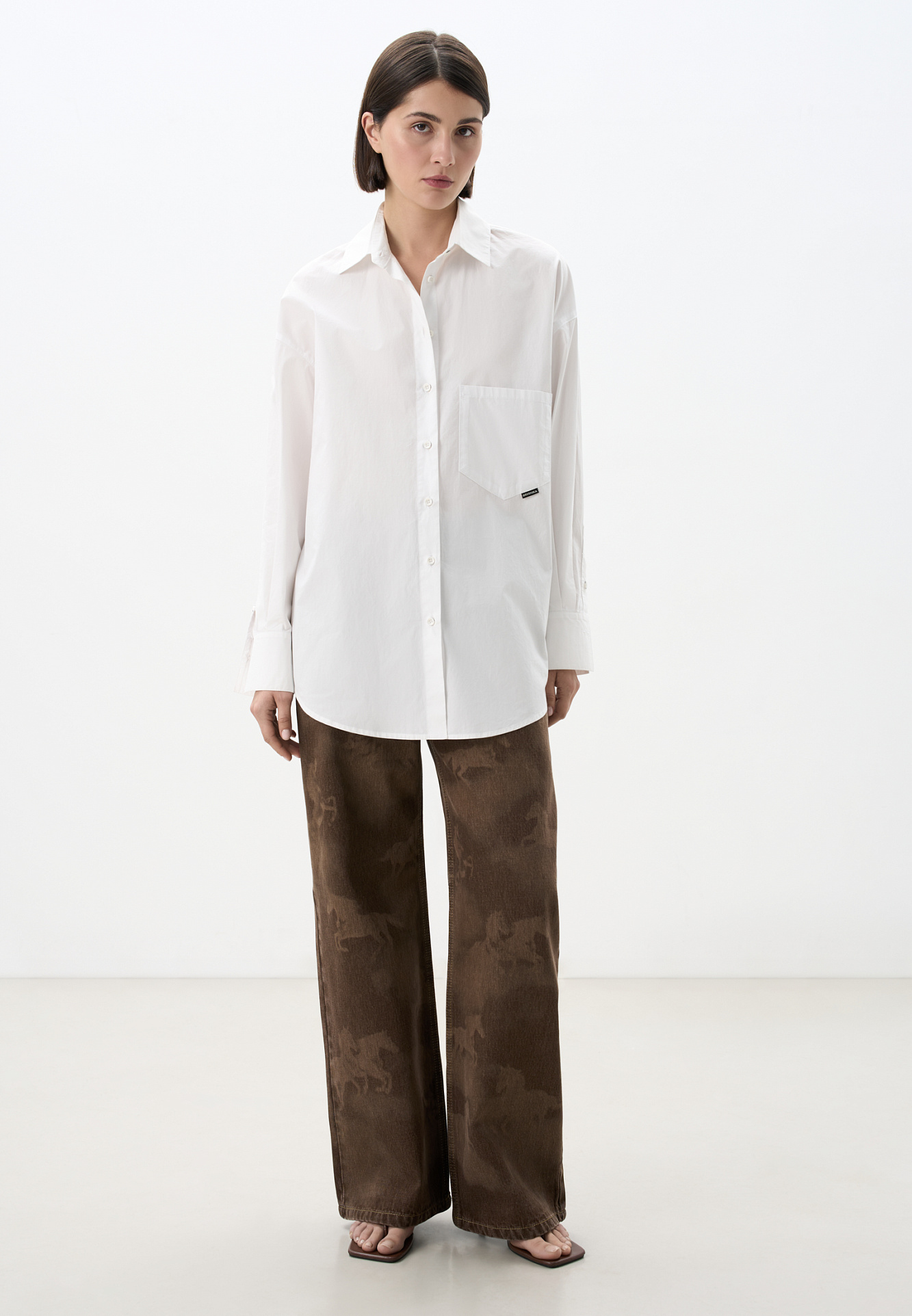 Джинсы из 100% хлопка с принтом в виде лошадей. Модель прямого кроя, с пятью карманами и шлевками на поясе для ремня. Застежка на молнию и пуговицу. Задние карманы выполнены в виде подковы.