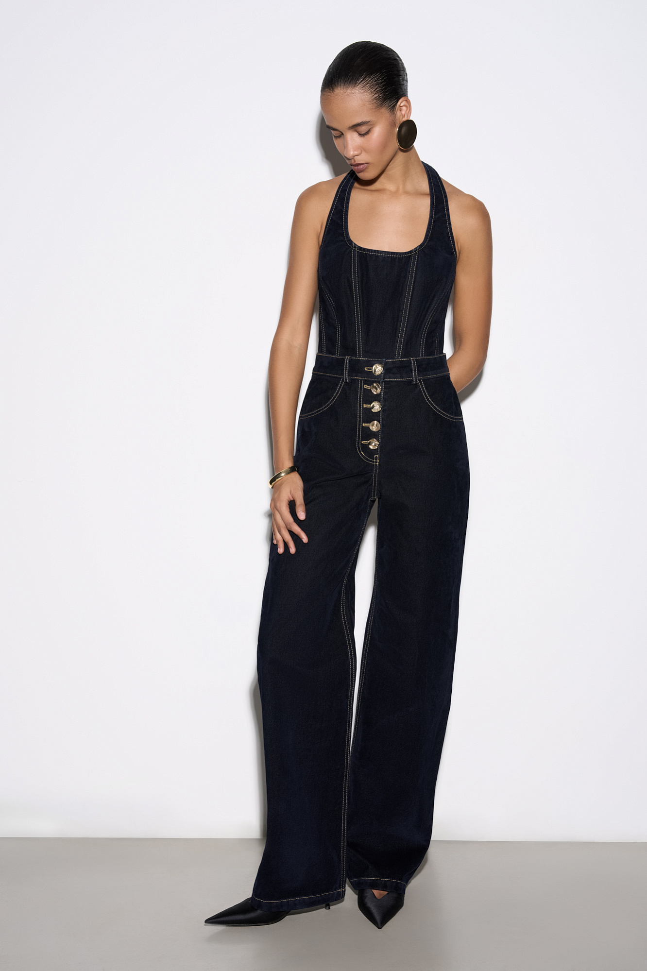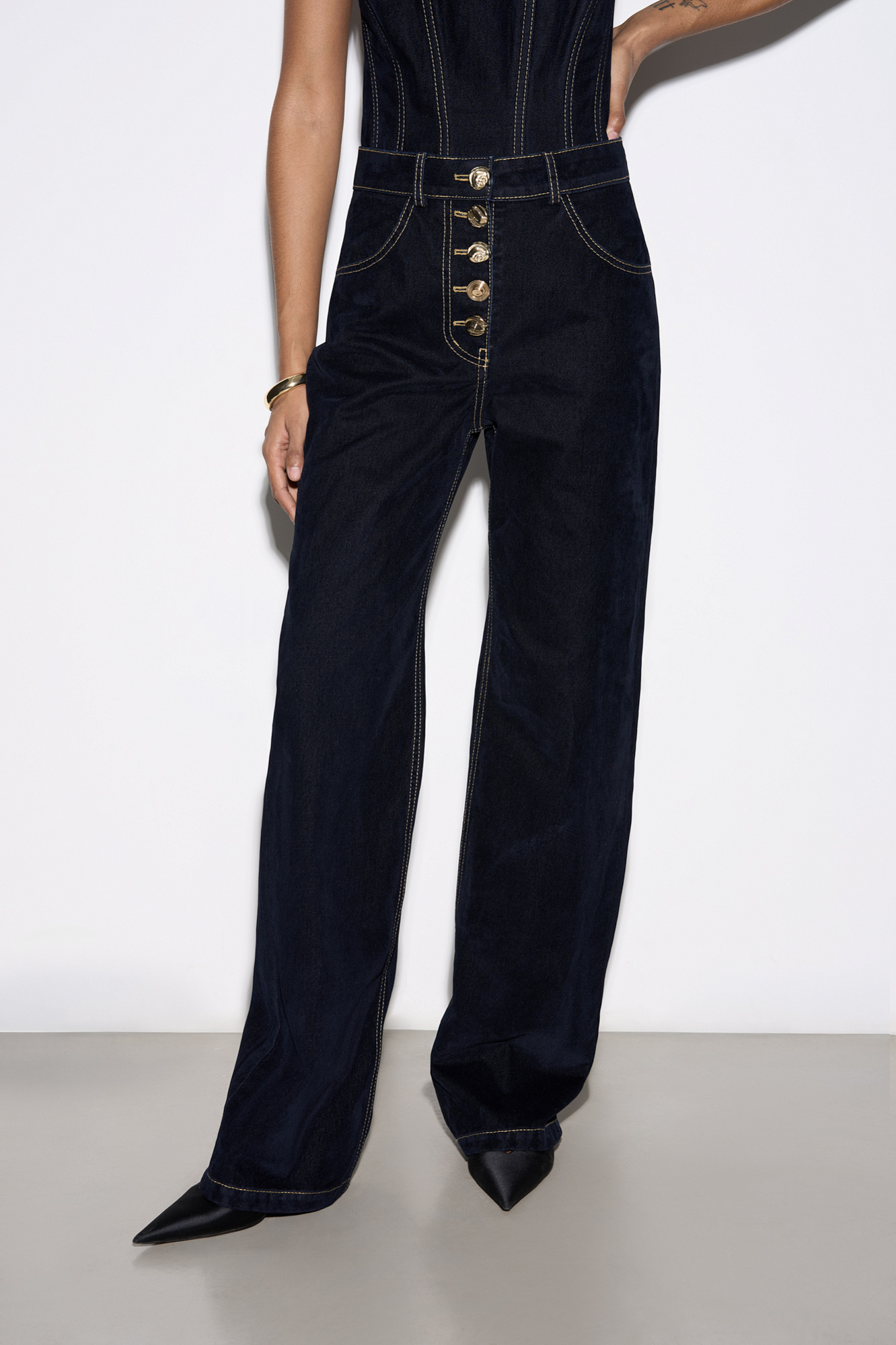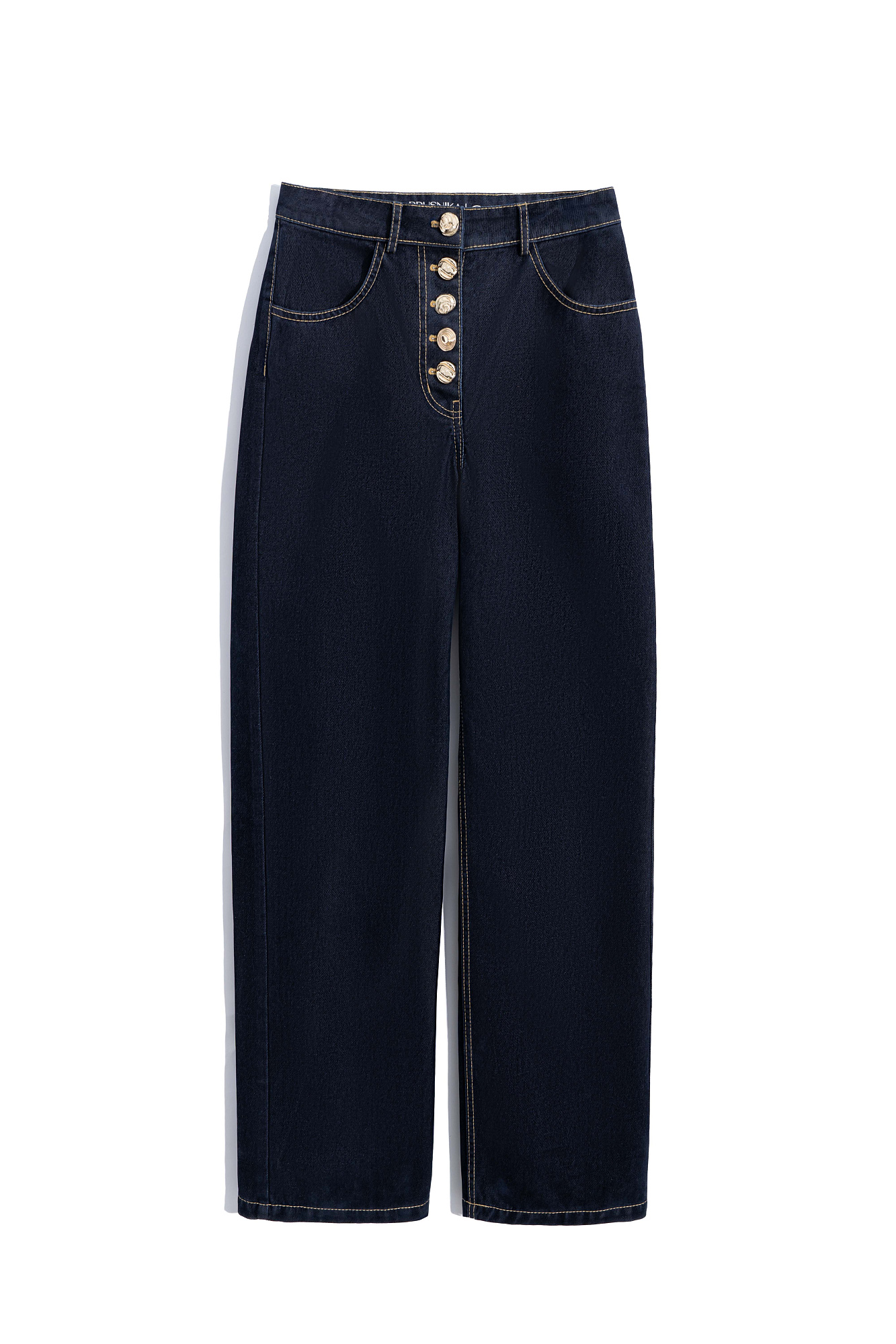 Джинсы из флокированного денима - 100% хлопка с имитацией бархатной текстуры. Модель прямого кроя на высокой посадке. Шлевки на поясе для ремня. Два передних, два задних кармана. Застежка на крупные пуговицы.