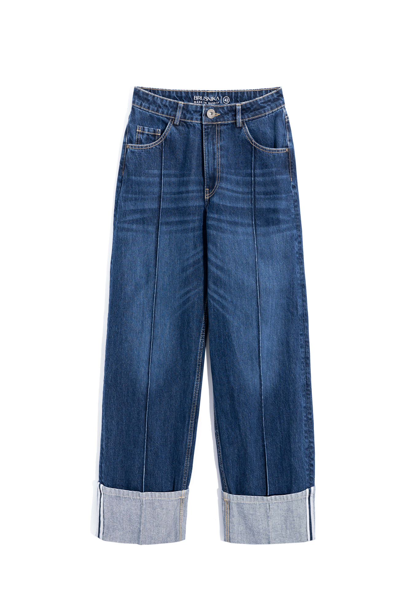 Джинсы relaxed fit из 100% хлопка. Модель с пятью карманами, шлевками на поясе для ремня и застежкой на молнию и кнопку. Изделие декорировано высокими подворотами и стрелками.