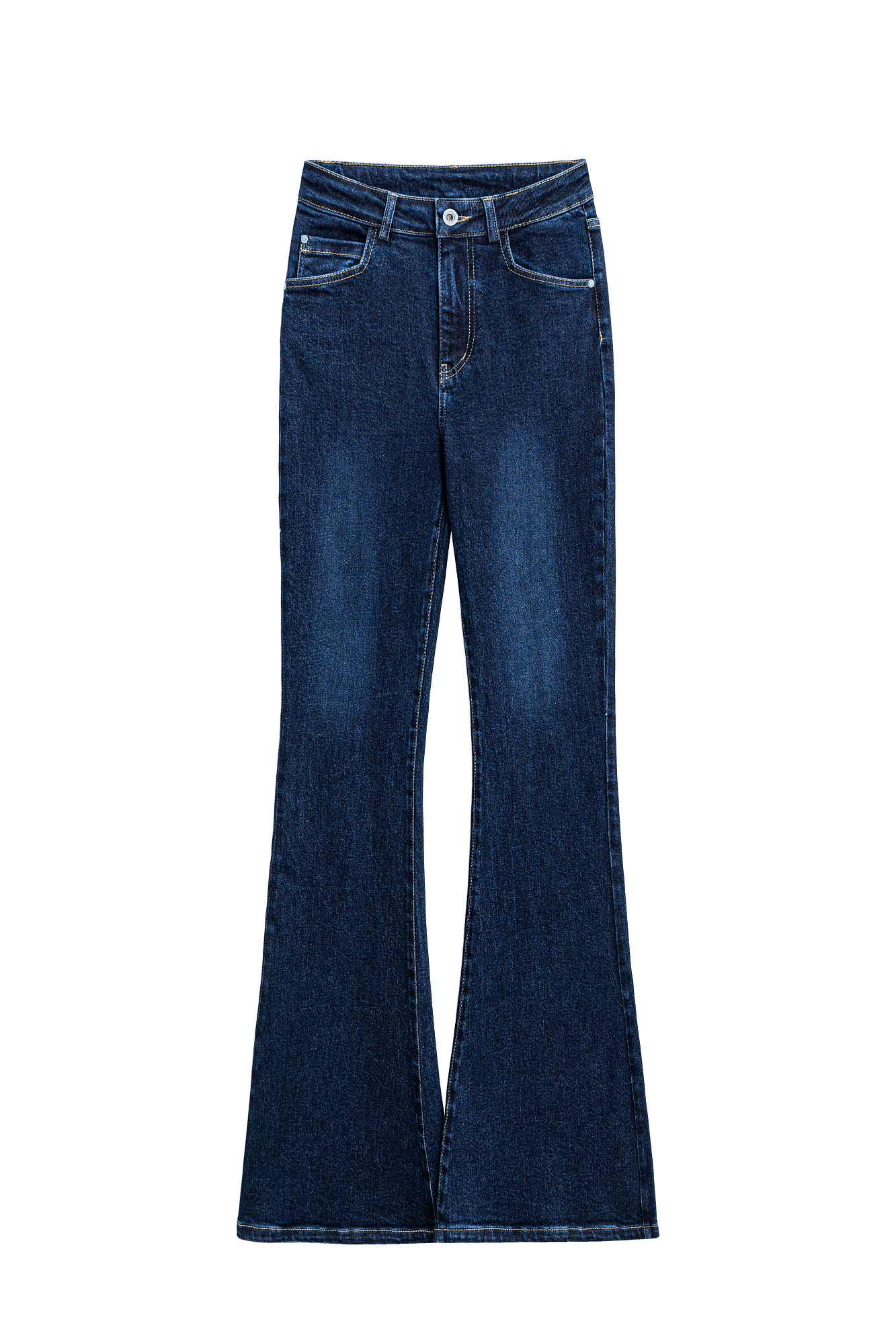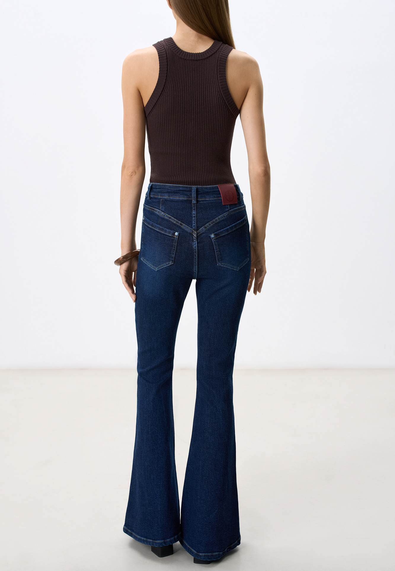 Расклешенные джинсы из 100% хлопка. Модель облегающего до колен кроя с высокой посадкой. Пять карманов. Застежка на молнию и металлическую пуговицу.