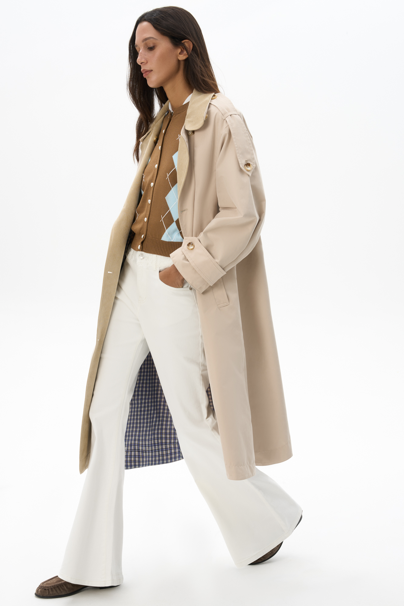 Двубортный короткий тренч под замшу