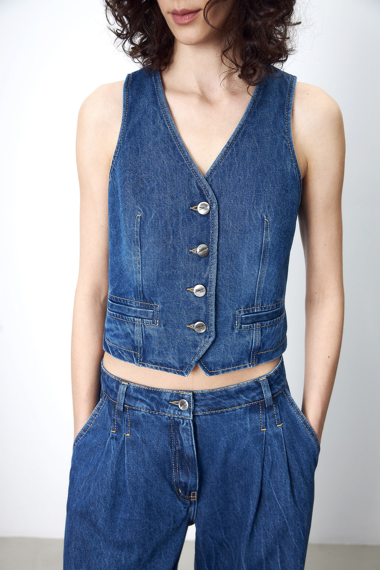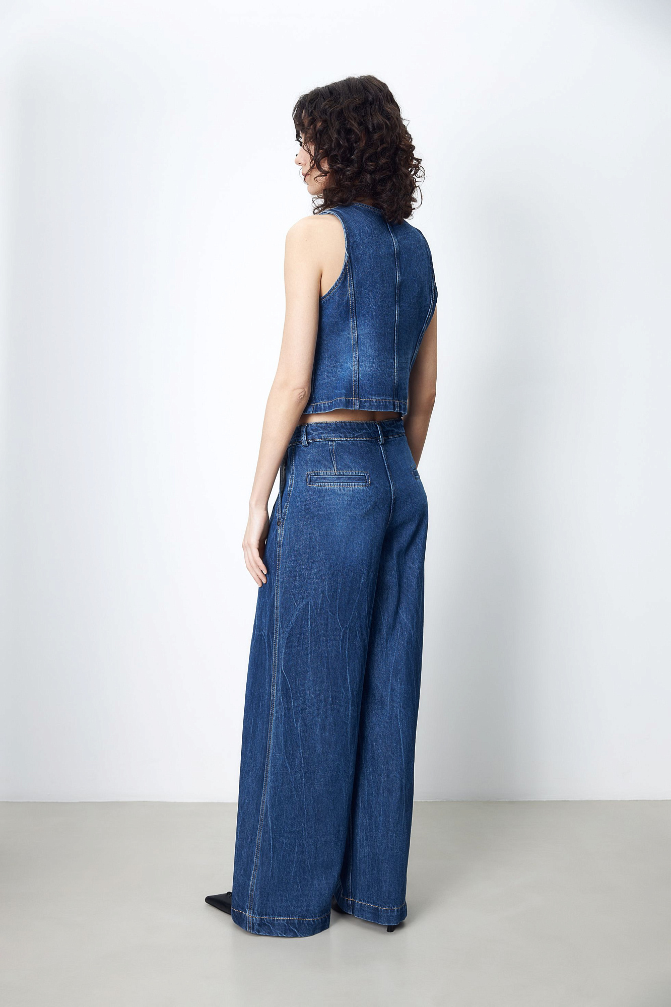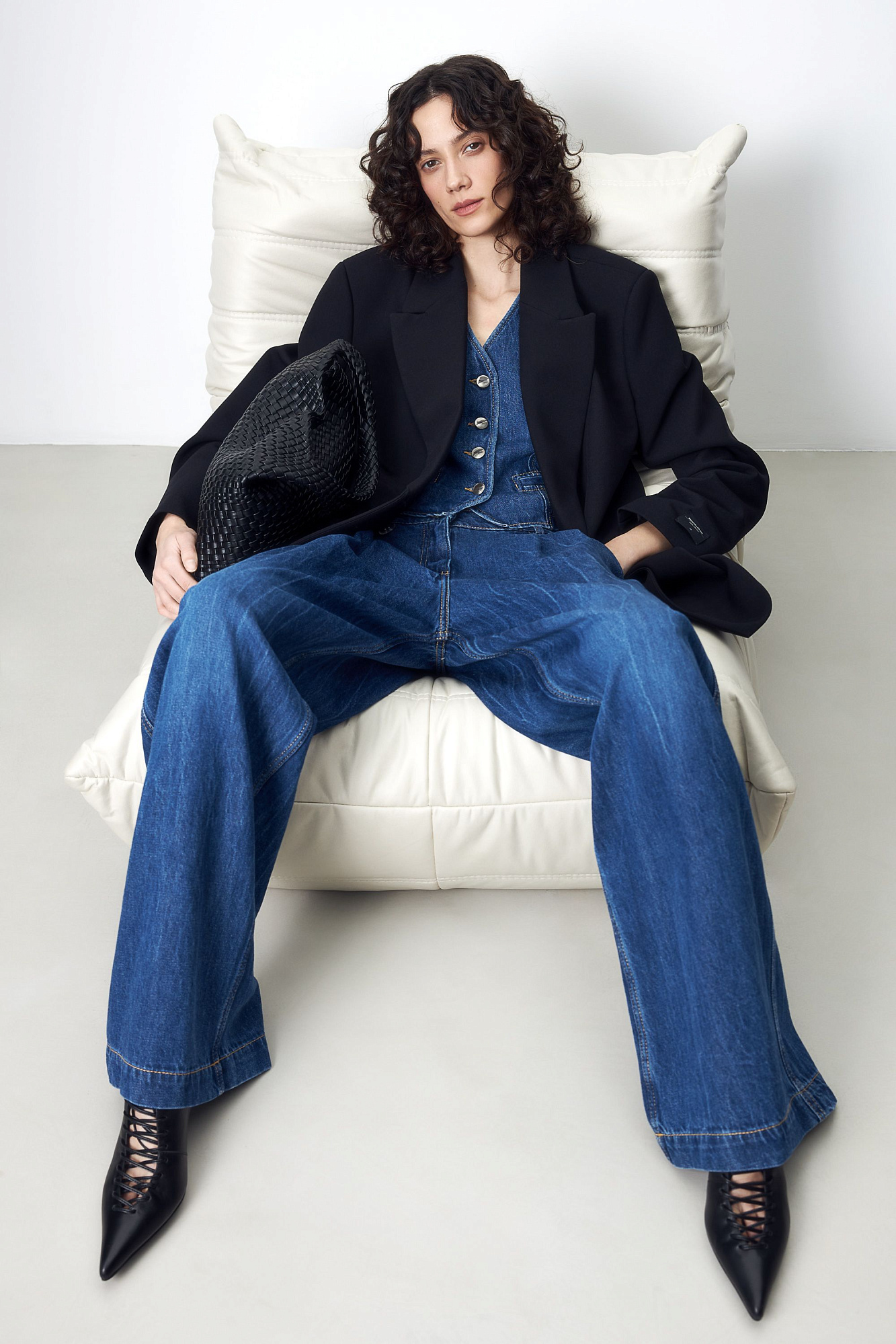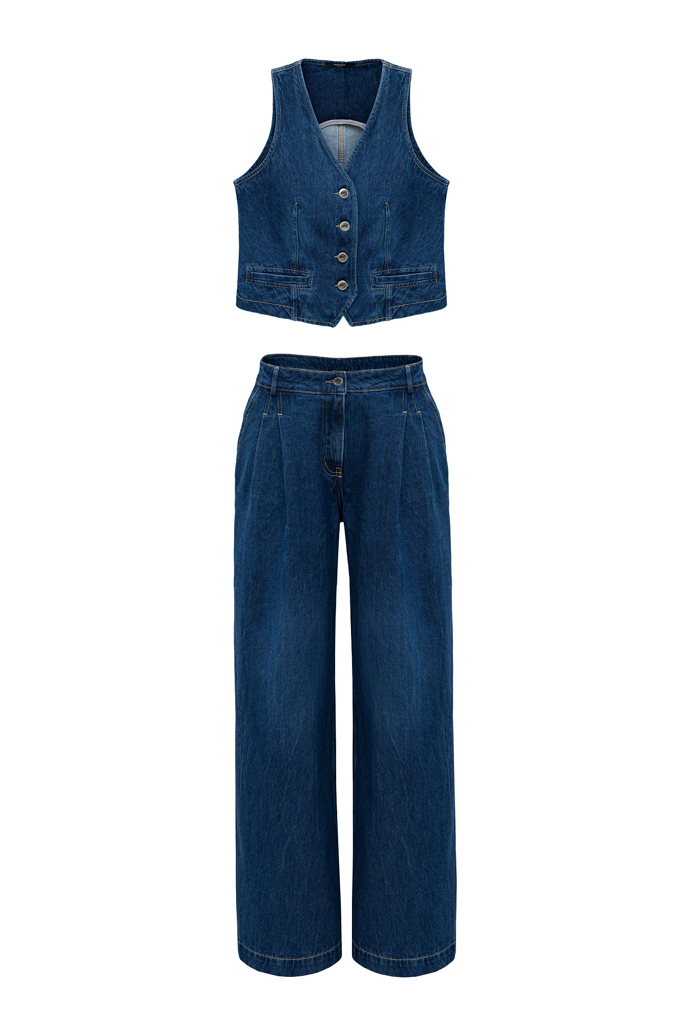 Джинсовый костюм из 100% хлопка, состоящий из джинс и жилета. Широкие джинсы прямого силуэта, со средней посадкой, застежкой на молнию и пуговицу, шлевки на поясе для ремня. Приталенный жилет с имитацией карманов и V-образным вырезом. Застежка на металлические пуговицы.