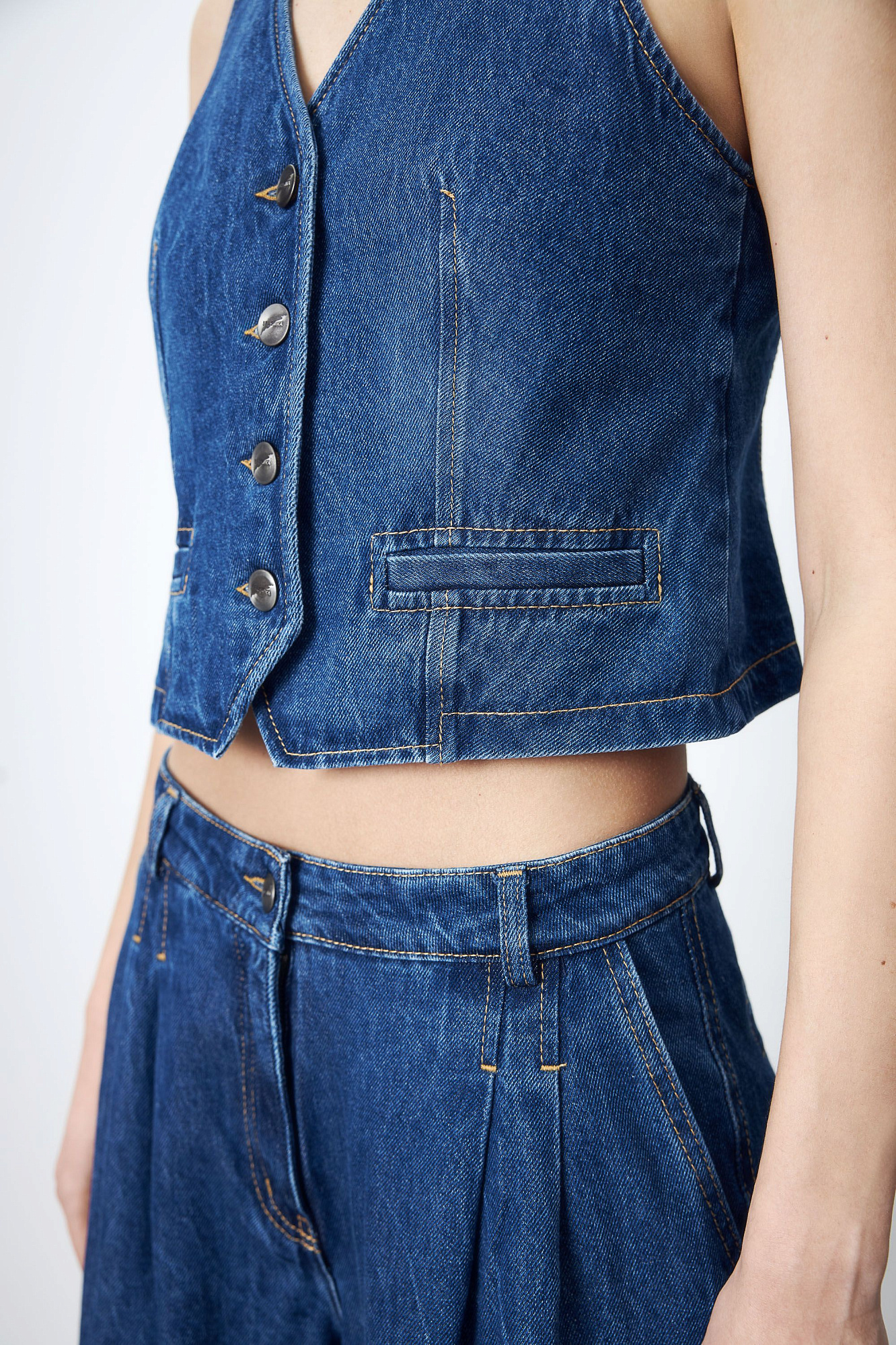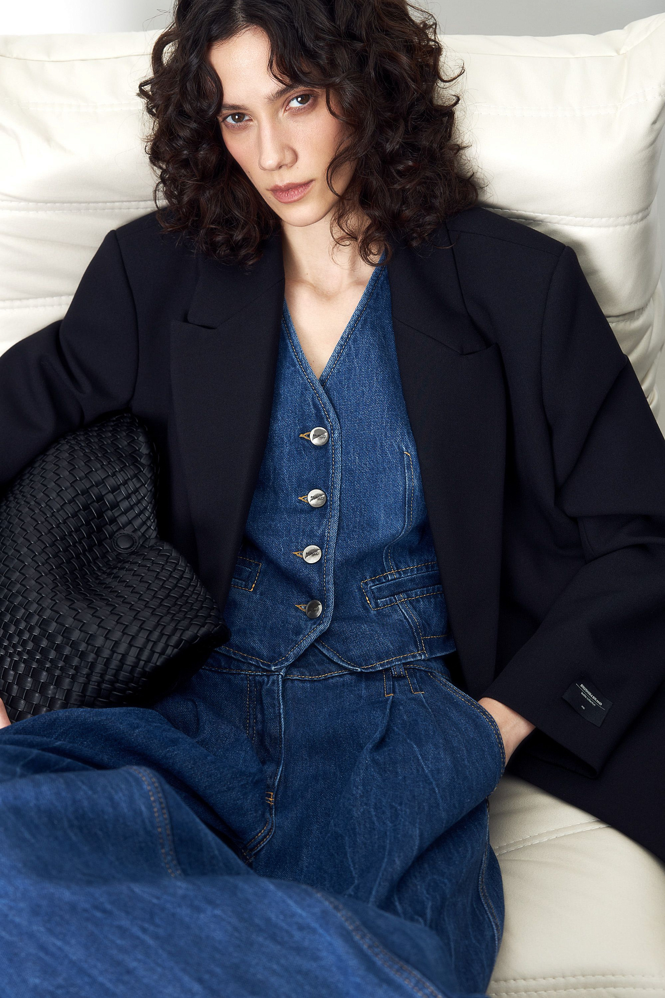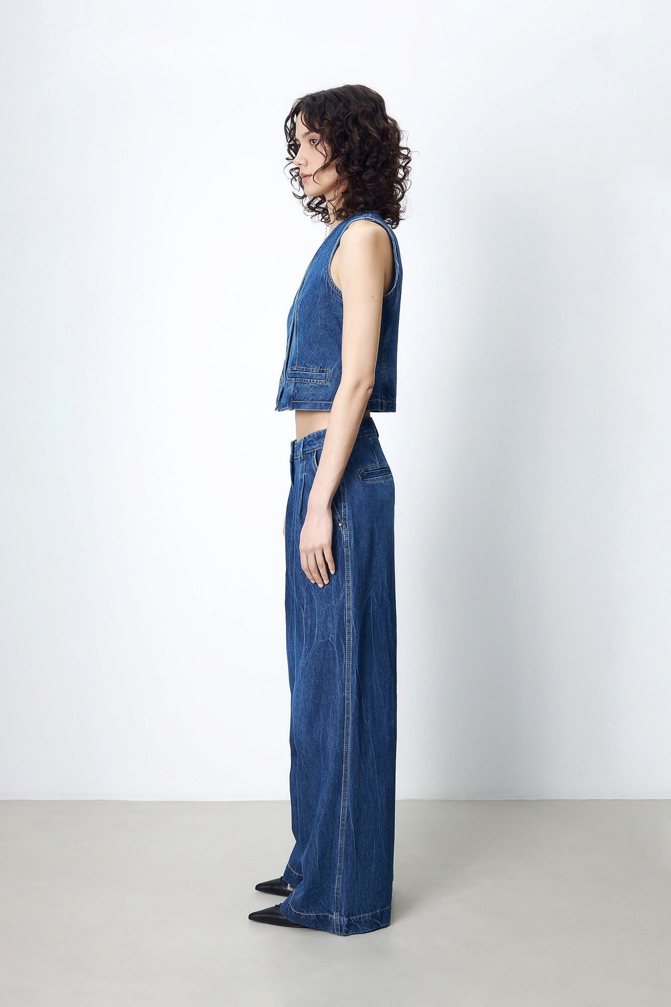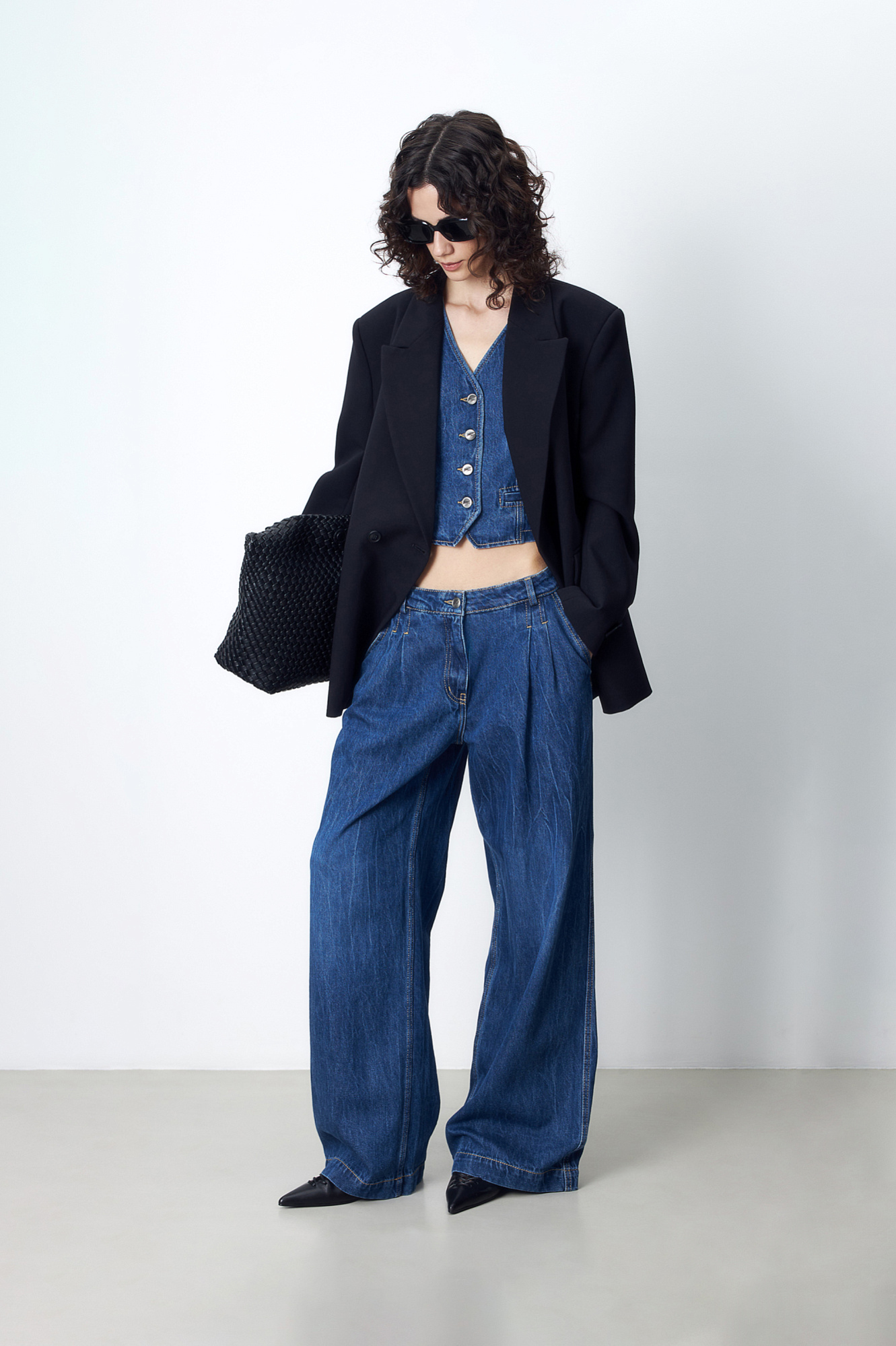 Джинсовый костюм из 100% хлопка, состоящий из джинс и жилета. Широкие джинсы прямого силуэта, со средней посадкой, застежкой на молнию и пуговицу, шлевки на поясе для ремня. Приталенный жилет с имитацией карманов и V-образным вырезом. Застежка на металлические пуговицы.