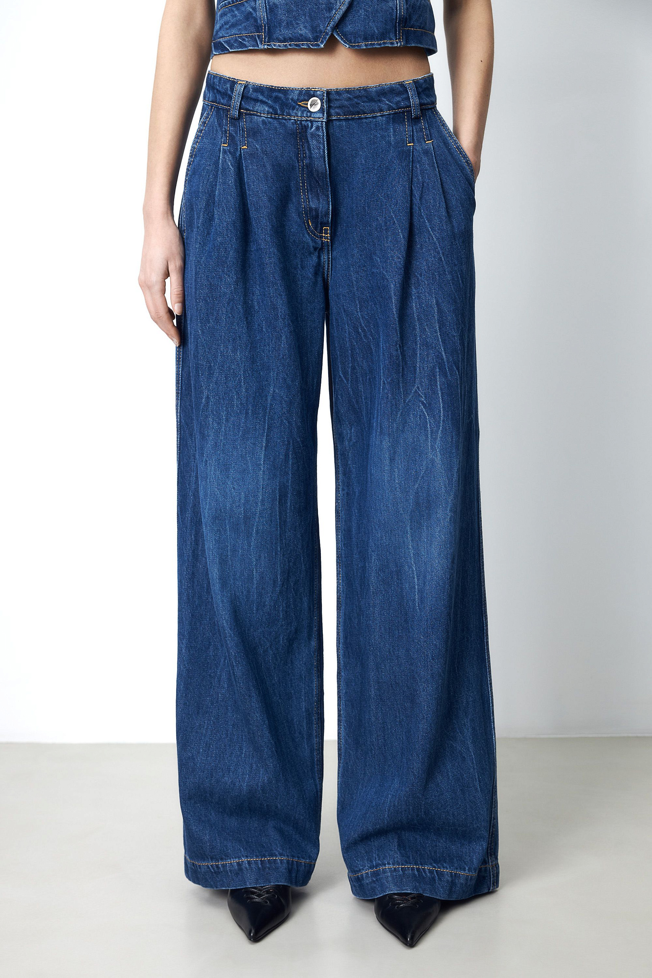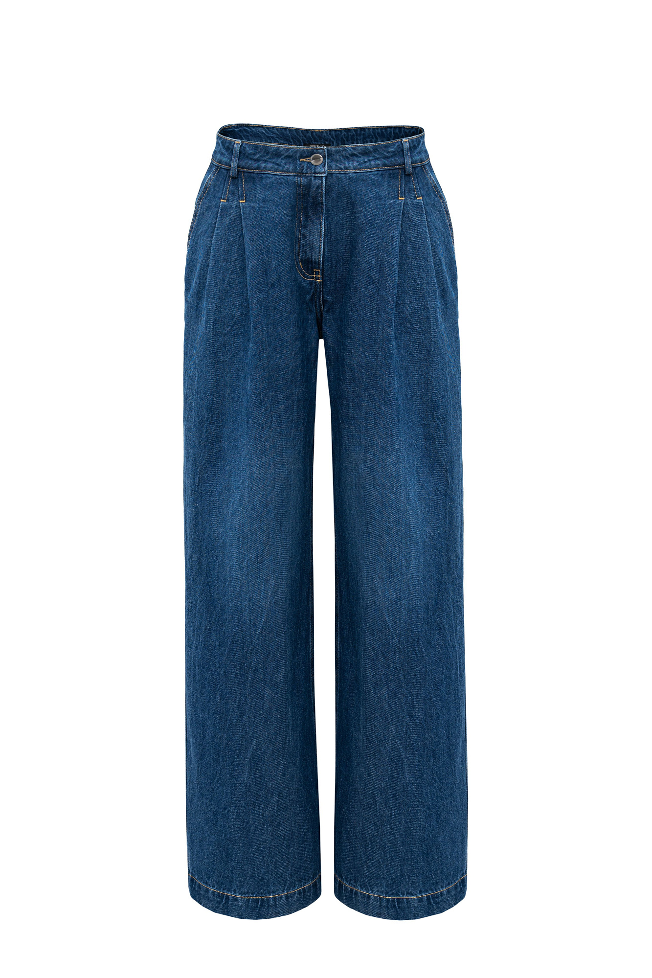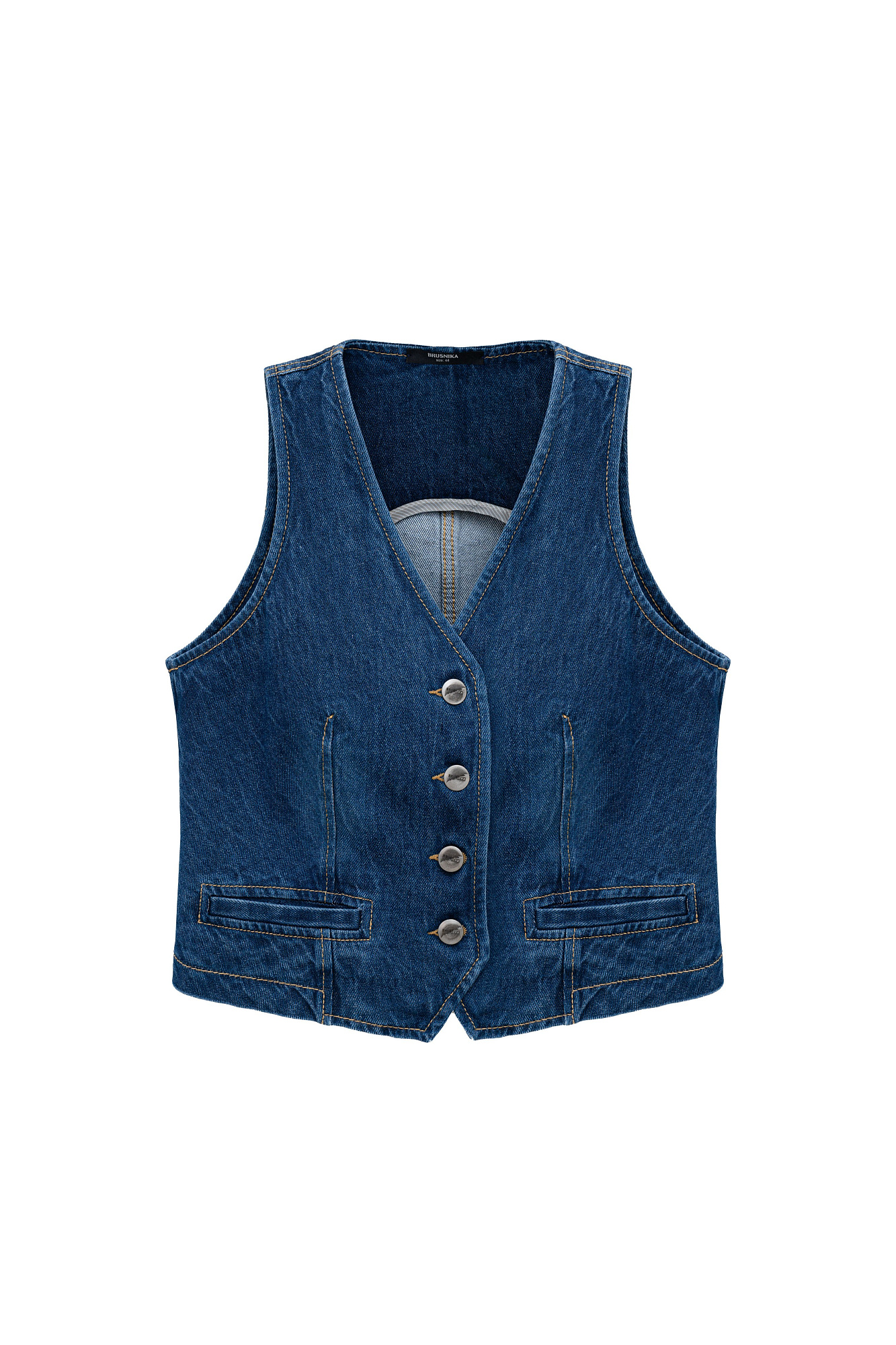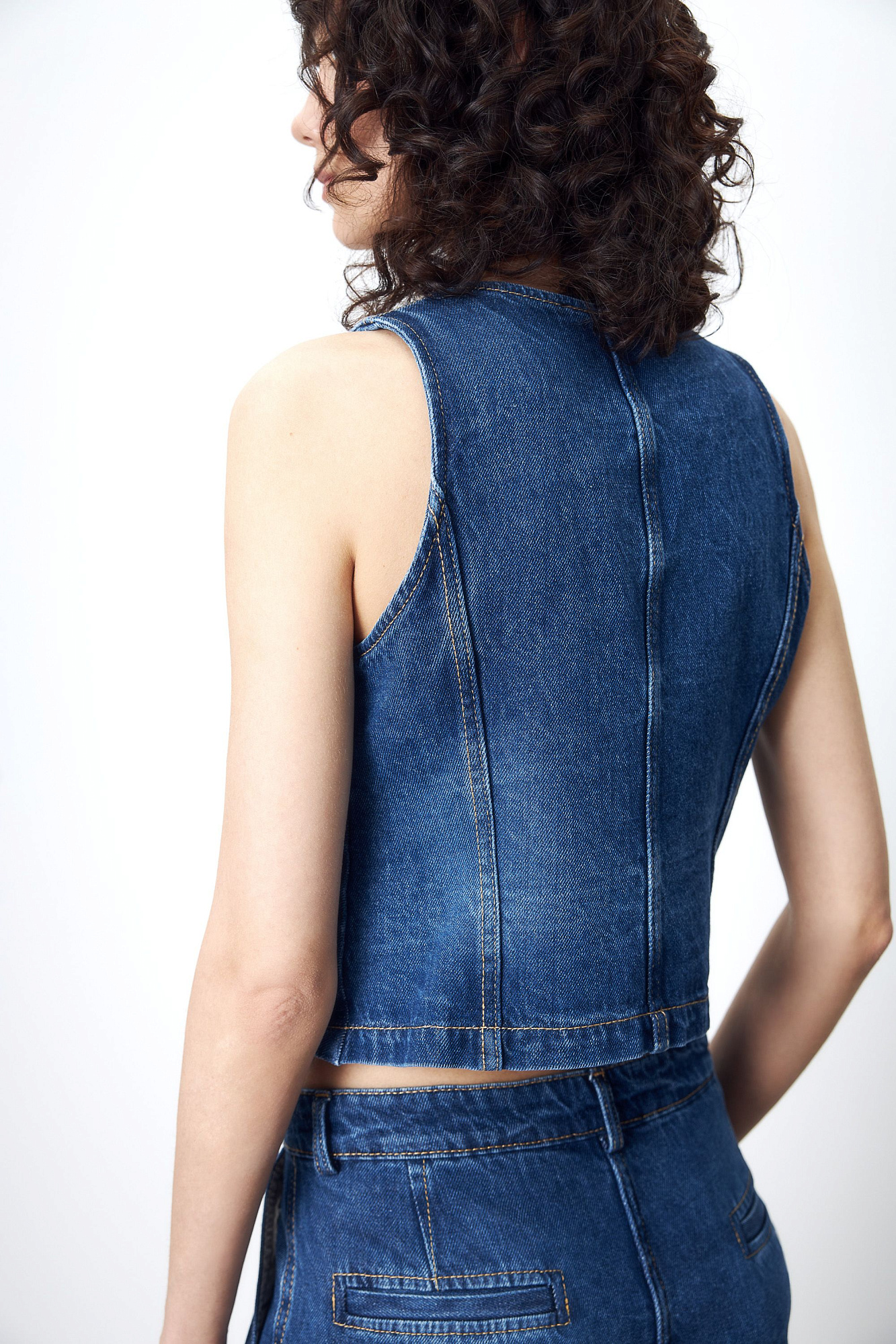Джинсовый костюм из 100% хлопка, состоящий из джинс и жилета. Широкие джинсы прямого силуэта, со средней посадкой, застежкой на молнию и пуговицу, шлевки на поясе для ремня. Приталенный жилет с имитацией карманов и V-образным вырезом. Застежка на металлические пуговицы.