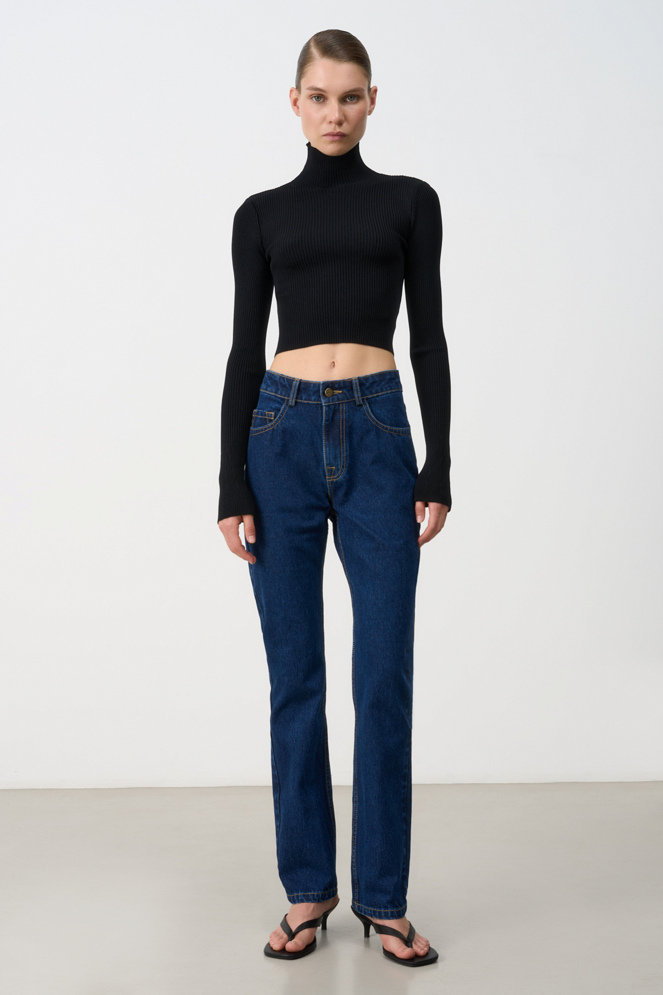 Джинсы скинни с высокой посадкой. Модель прямого кроя, заужена к низу. Пять карманов. Застежка на молнию и металлическую пуговицу.
