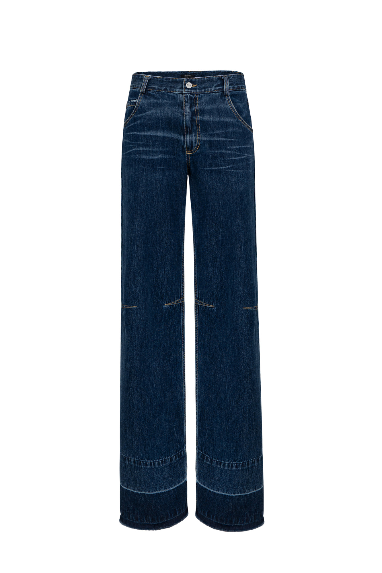 Прямые джинсы со средней посадкой с потертостями и контрастной отстрочкой. Потайная застежка на молнию и пуговицу. Необработанный низ. Четыре кармана.