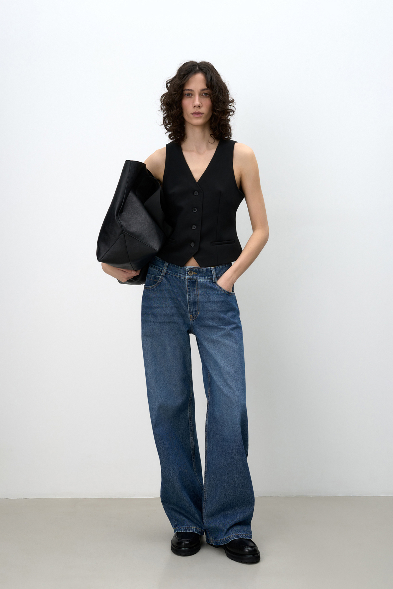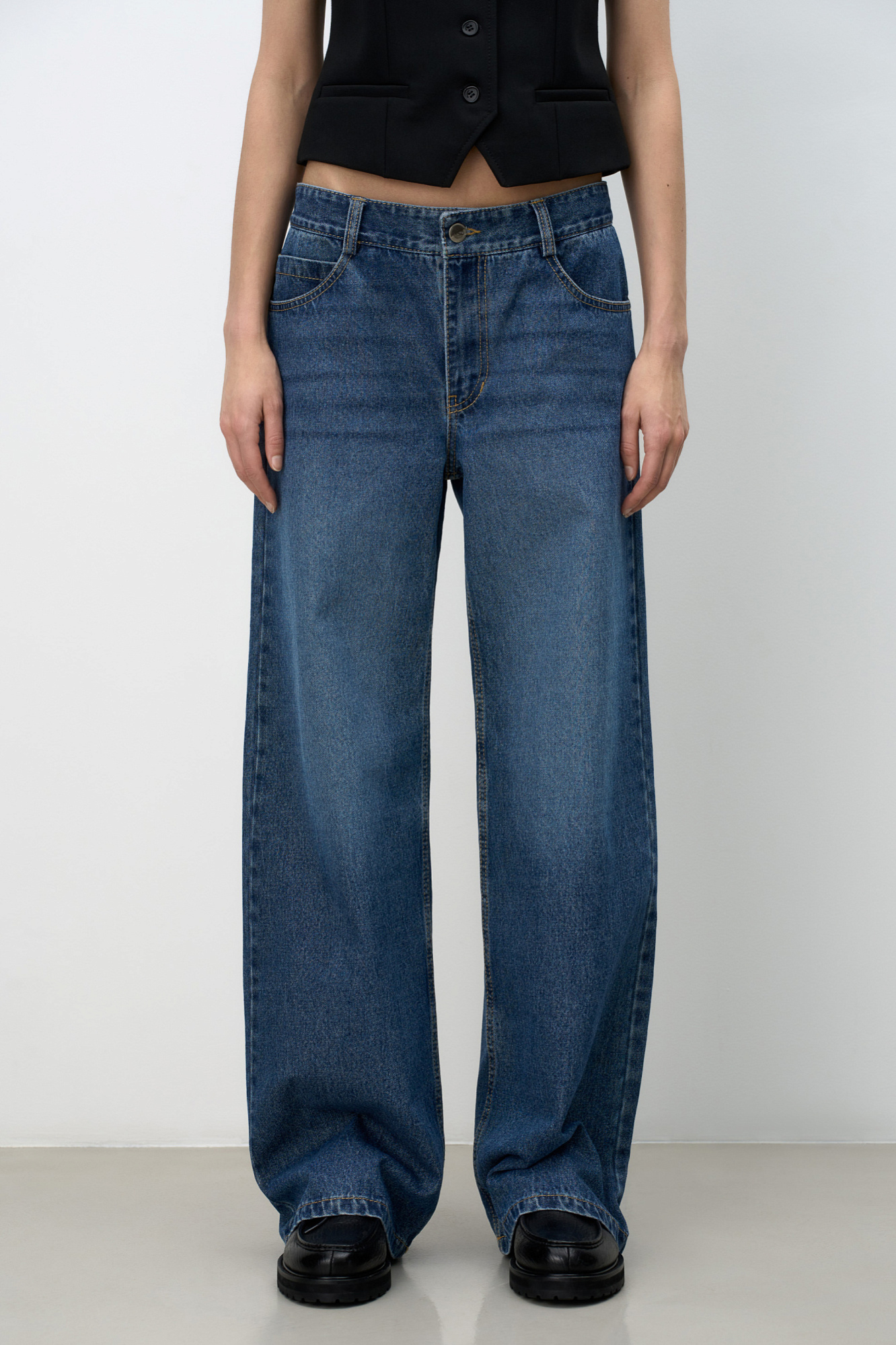 Прямые джинсы из 100% хлопка с боковыми карманами. Модель со средней посадкой и потайной застежкой на молнию и пуговицу.