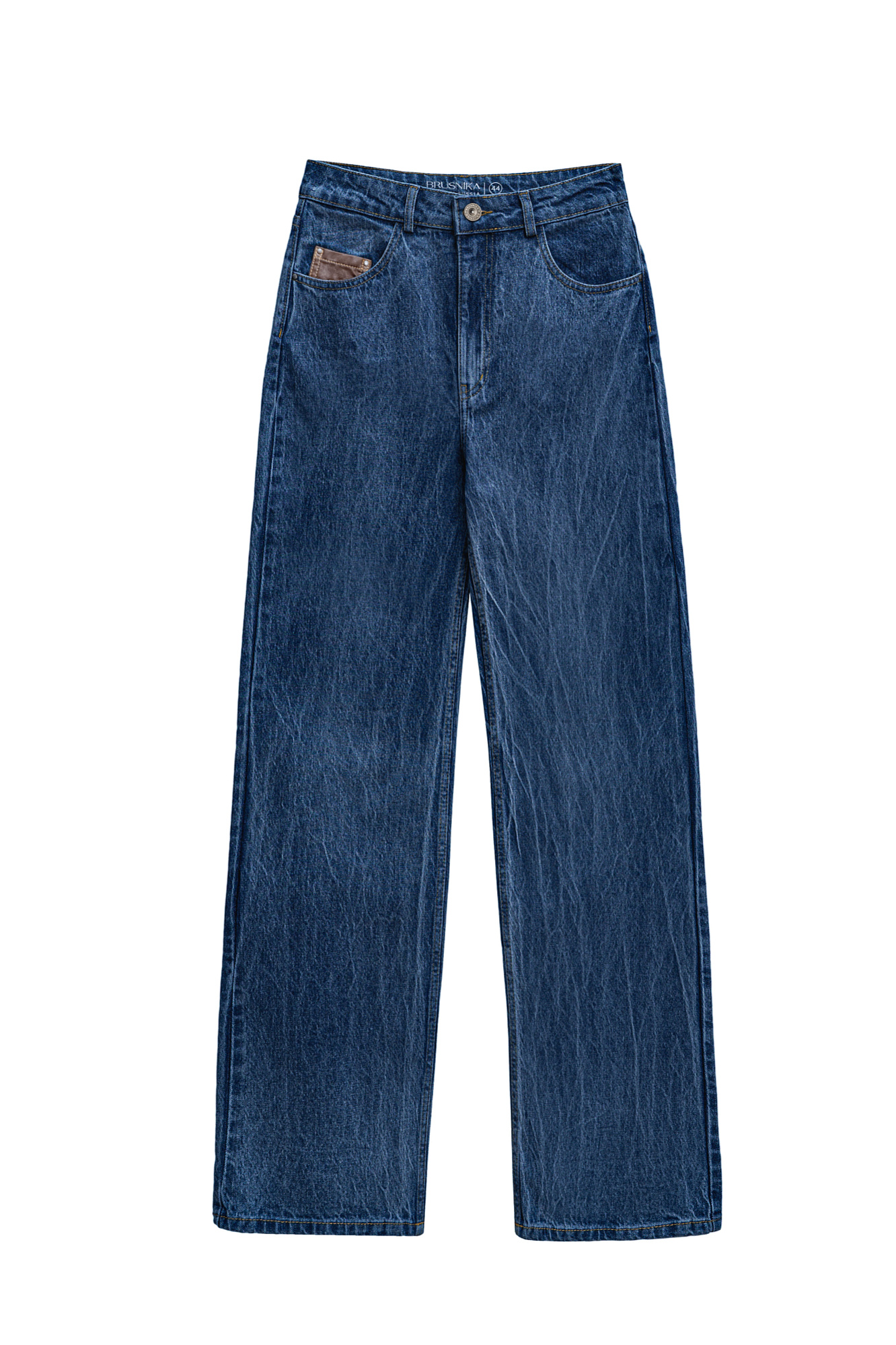 Джинсы из 100% хлопка. Модель прямого широкого кроя, с классической посадкой, пятью карманами, шлевками на поясе для ремня и застежкой на молнию и пуговицу. Эффект “мраморной” стирки по всей поверхности. Маленький карман с отделкой из коричневой экокожи.