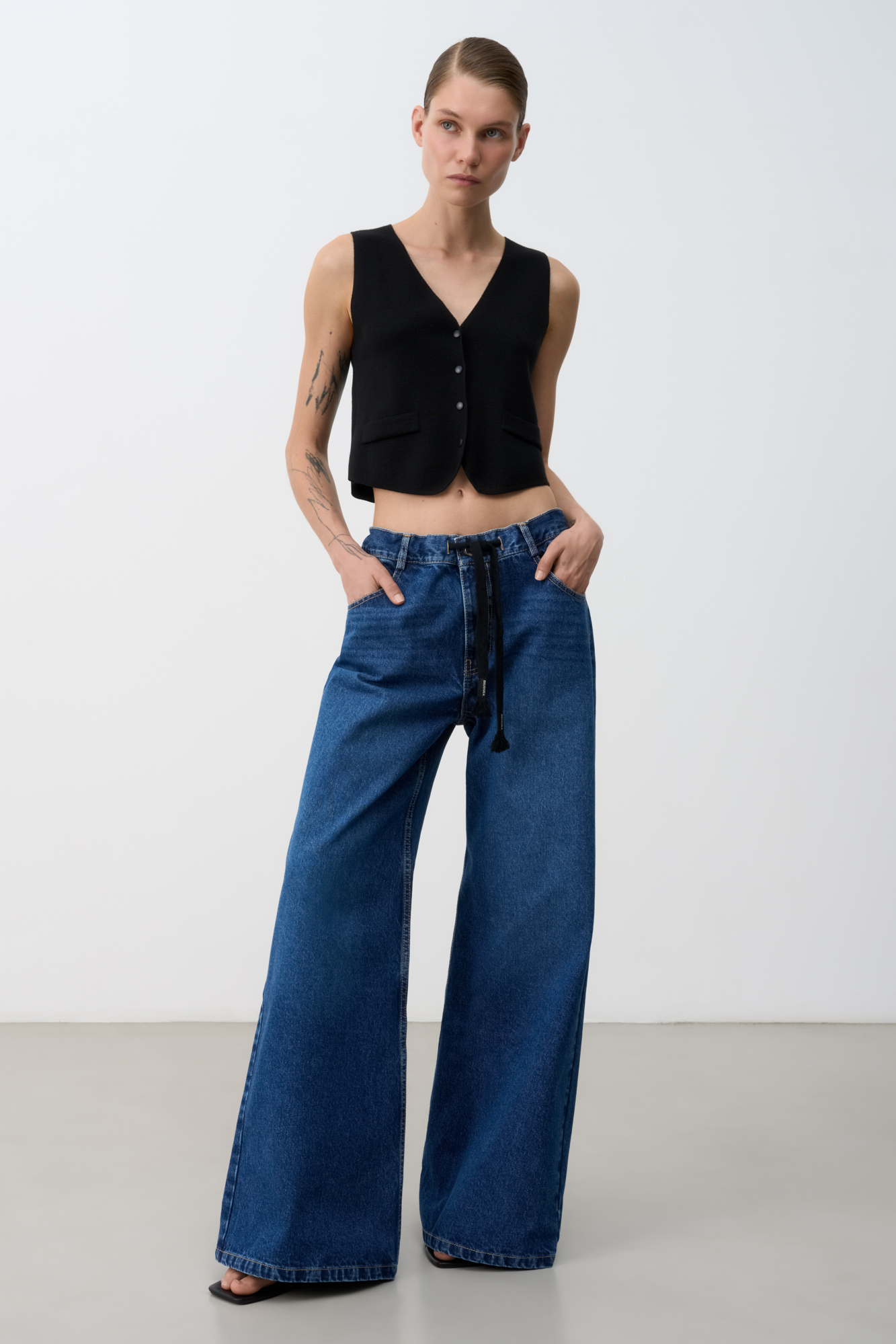 Прямые джинсы из 100% хлопка с боковыми карманами. Модель со средней посадкой, брендированной кулиской и потайной застежкой на молнию и пуговицу.