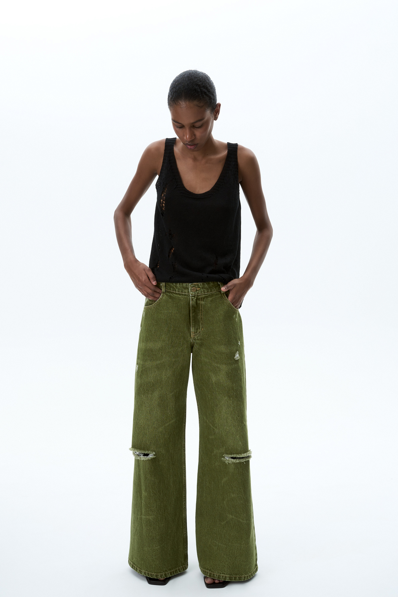 Широкие джинсы из 100% хлопка с горизонтальными разрезами. Модель прямого силуэта, со средней посадкой. Пять карманов, шлевки на поясе для ремня, застежка на молнию и пуговицу.